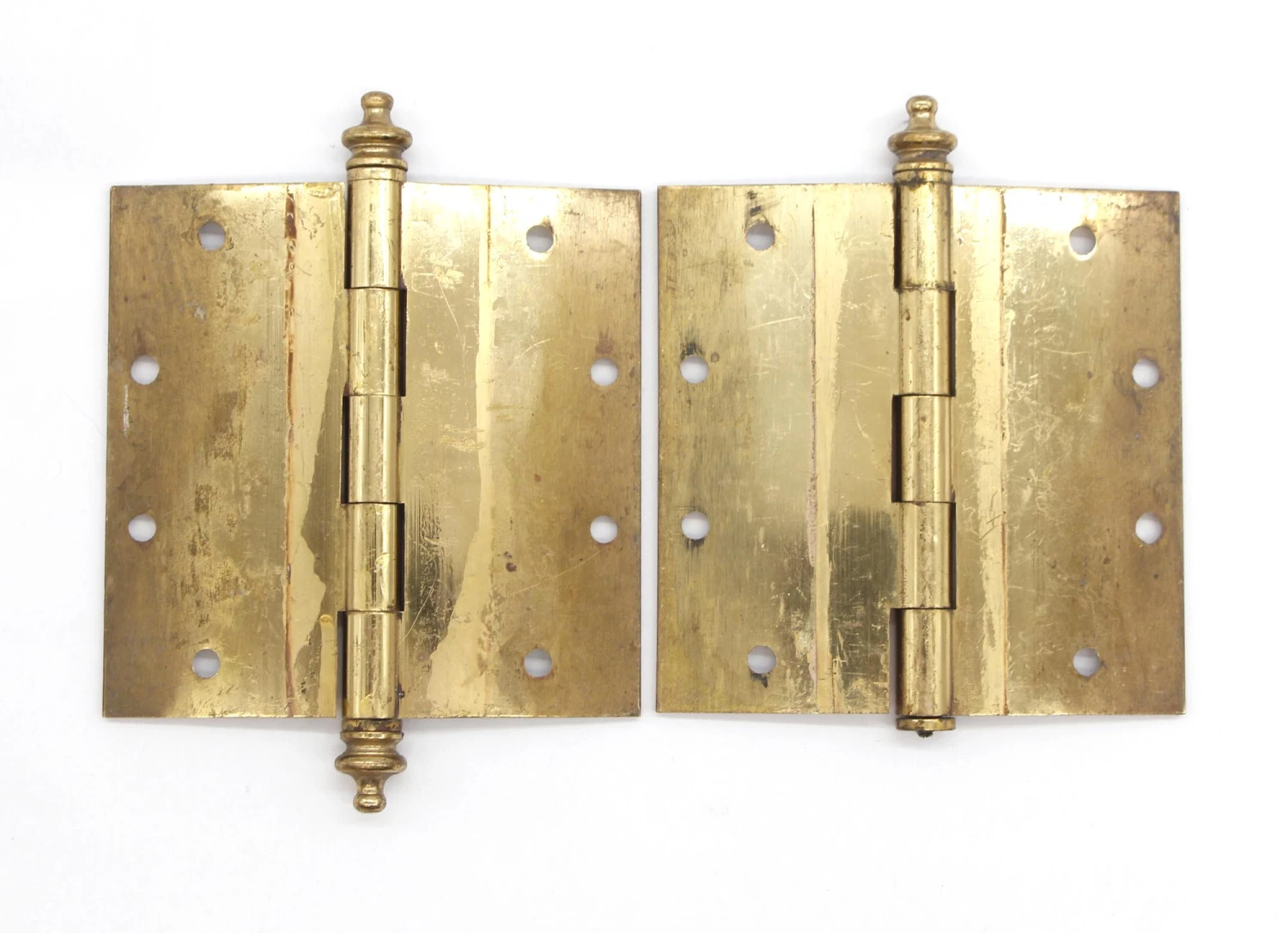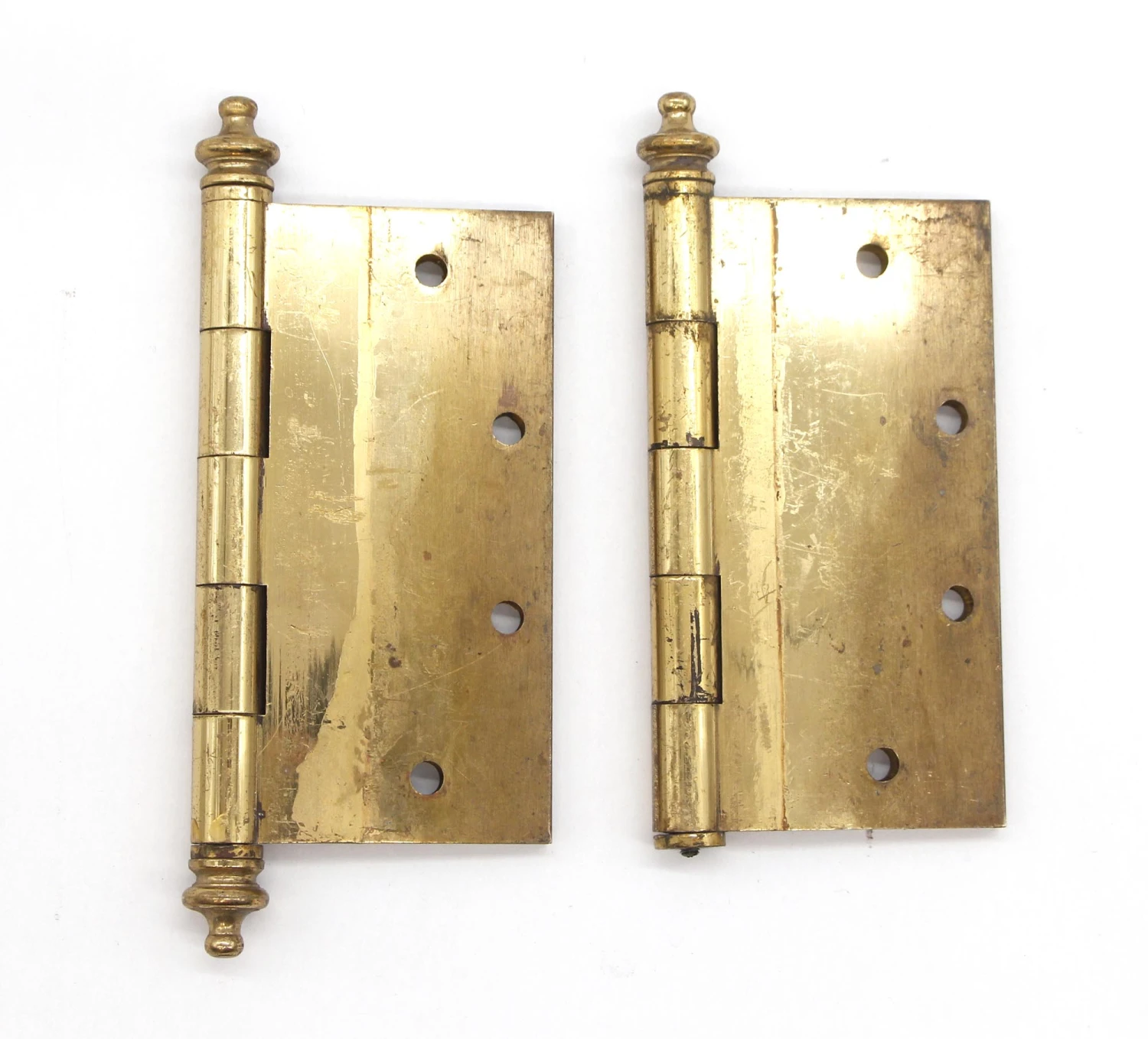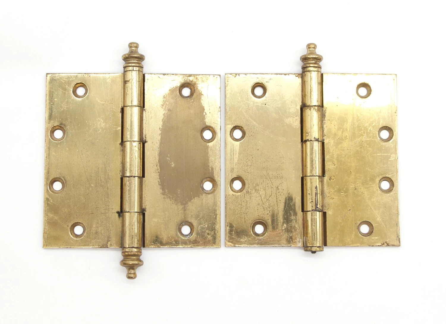 These hinges are made of polished brass with ball tips, five knuckles, and a template hole pattern. They are good working condition with one finial missing. Priced as a pair.
