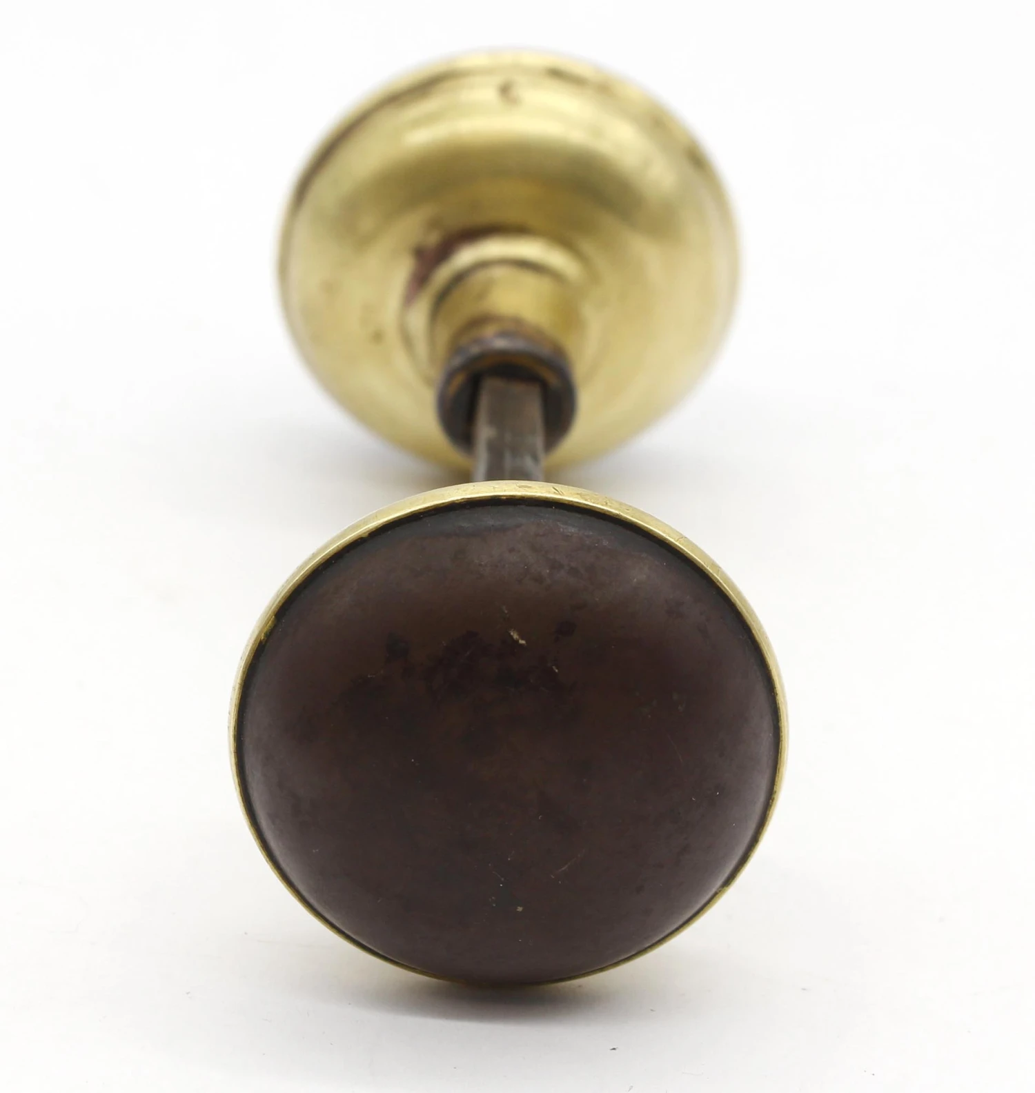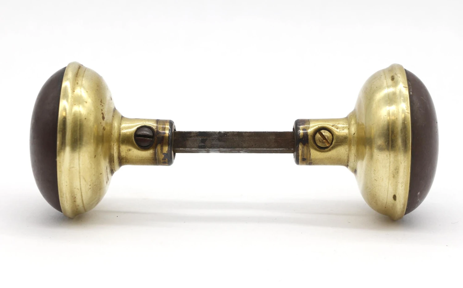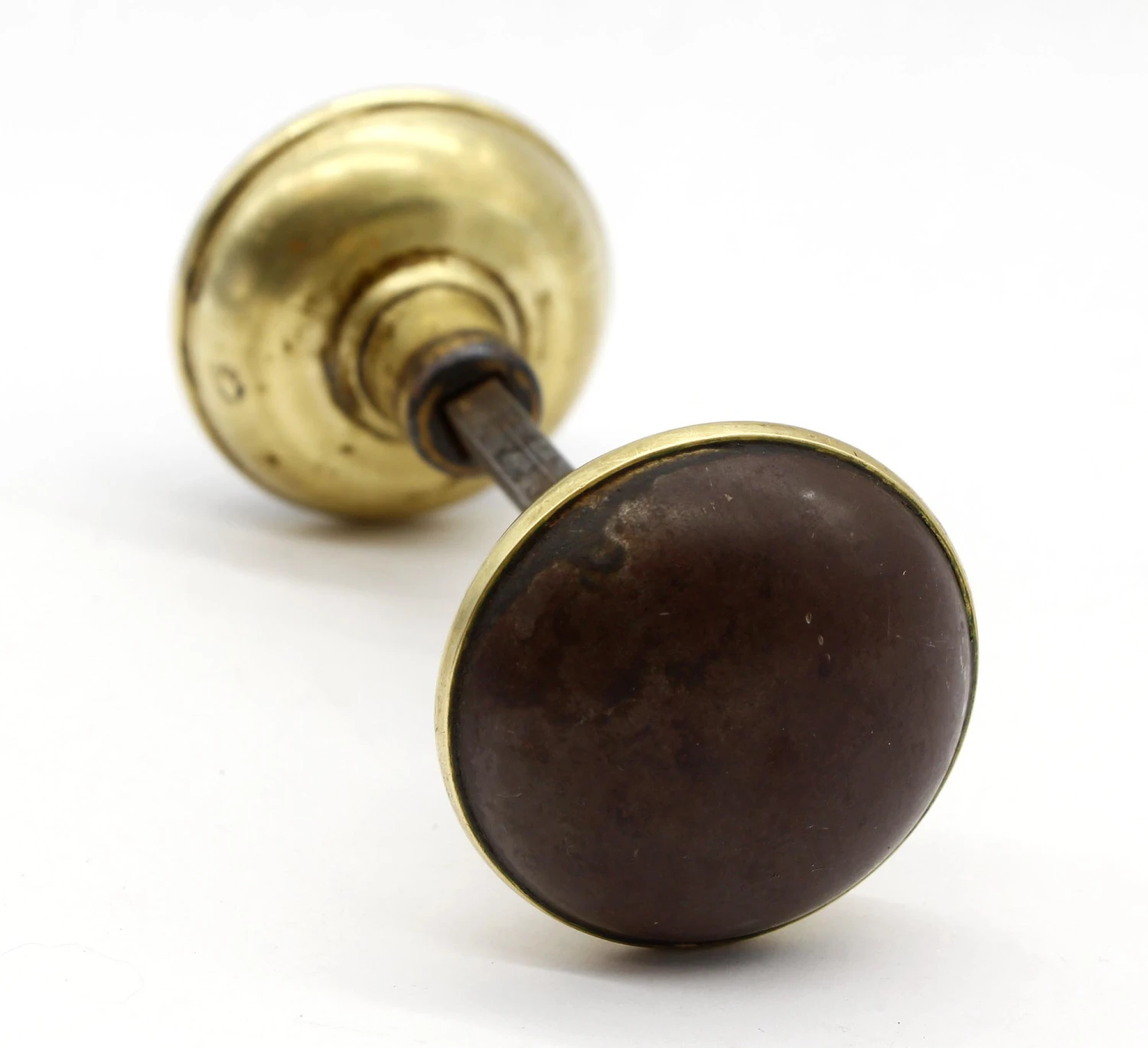 Vintage pair of doorknobs with a darkened steel front and a polished brass back. The manufacturer is unknown.