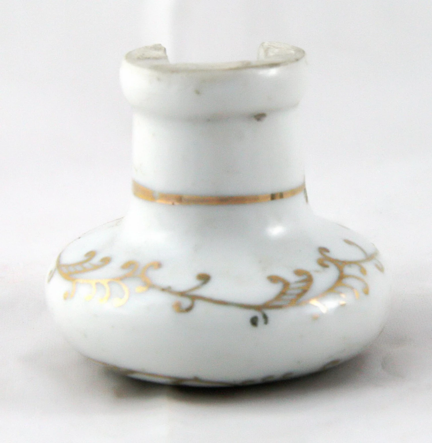 Very dainty gold leaf flower and center rose patterned porcelain knobs. No spindle included. Priced as a pair. Both are broken in the base.