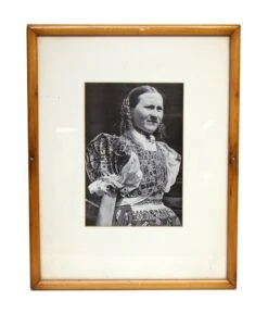Pine frame and white matte with a black and white photo of a woman in a traditional costume.