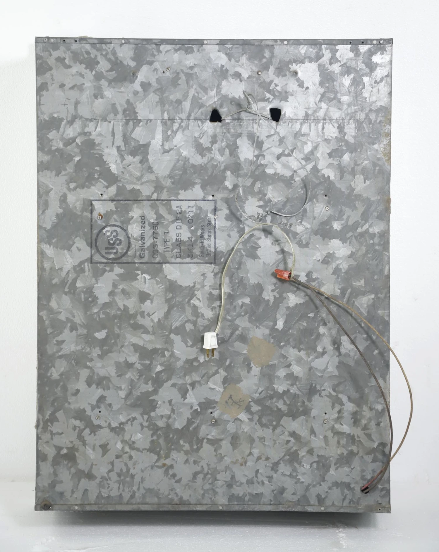 Illuminated three section aluminum marquis display case from 172 Madison Avenue with a galvanized steel backing. The sections open with nickel pulls. This is in good condition. Please inquire about the working condition of the lighting.