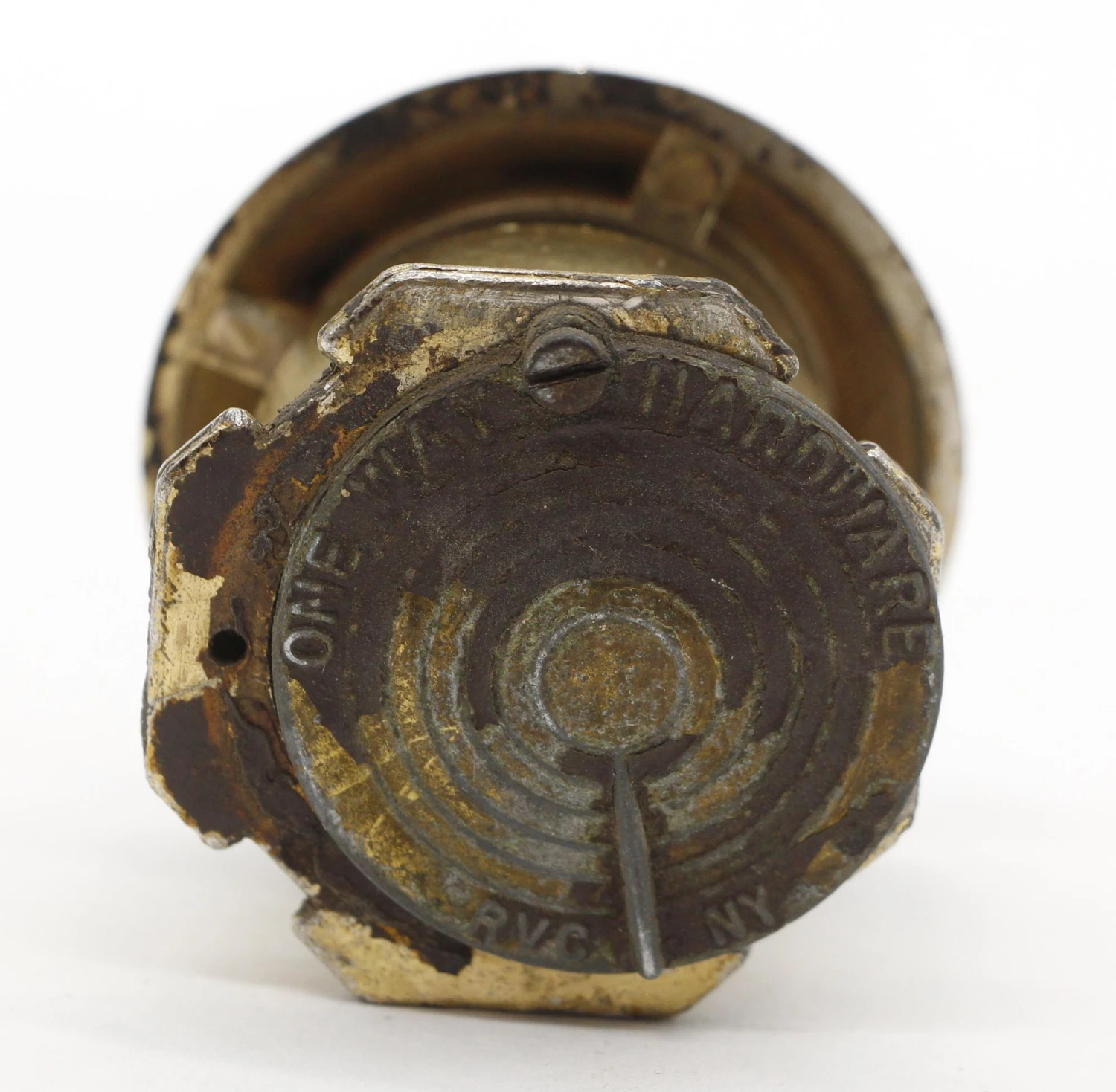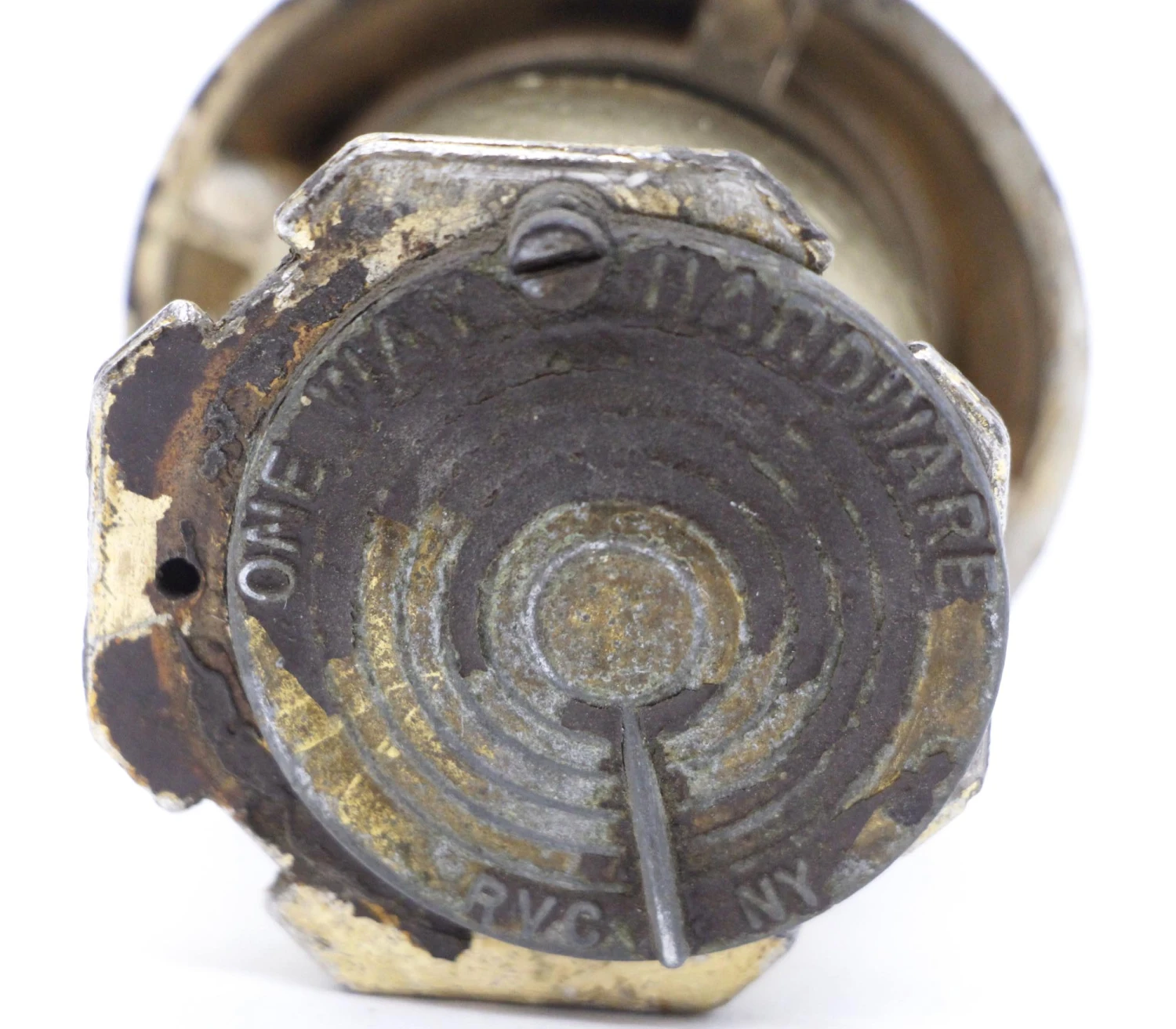 Reclaimed circular peephole made of brass with a nickel finish. There is surface wear on the nickel finish and paint residue on the interior plate. One available.