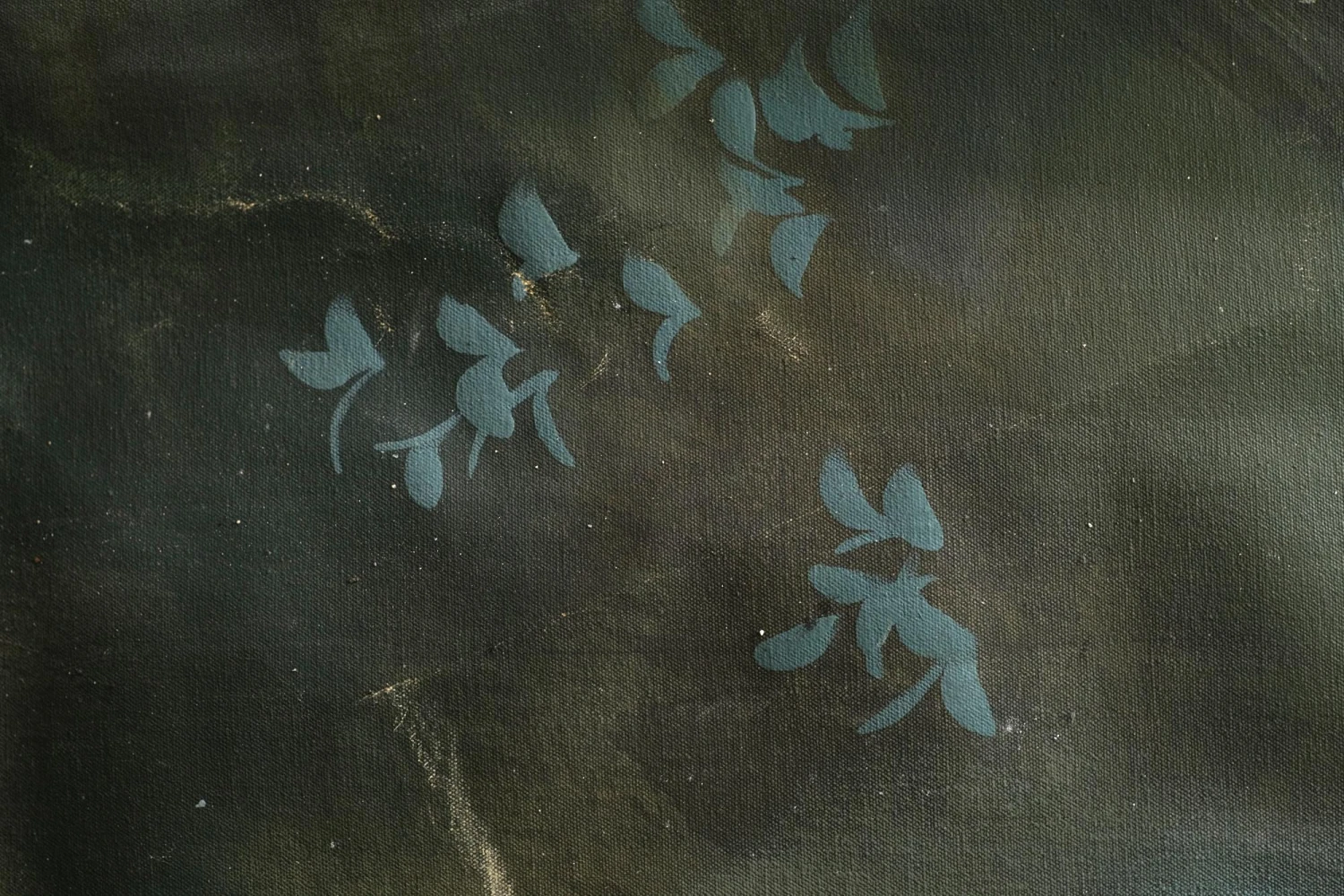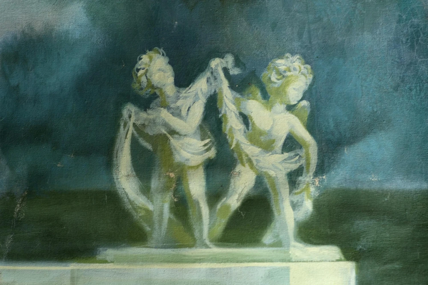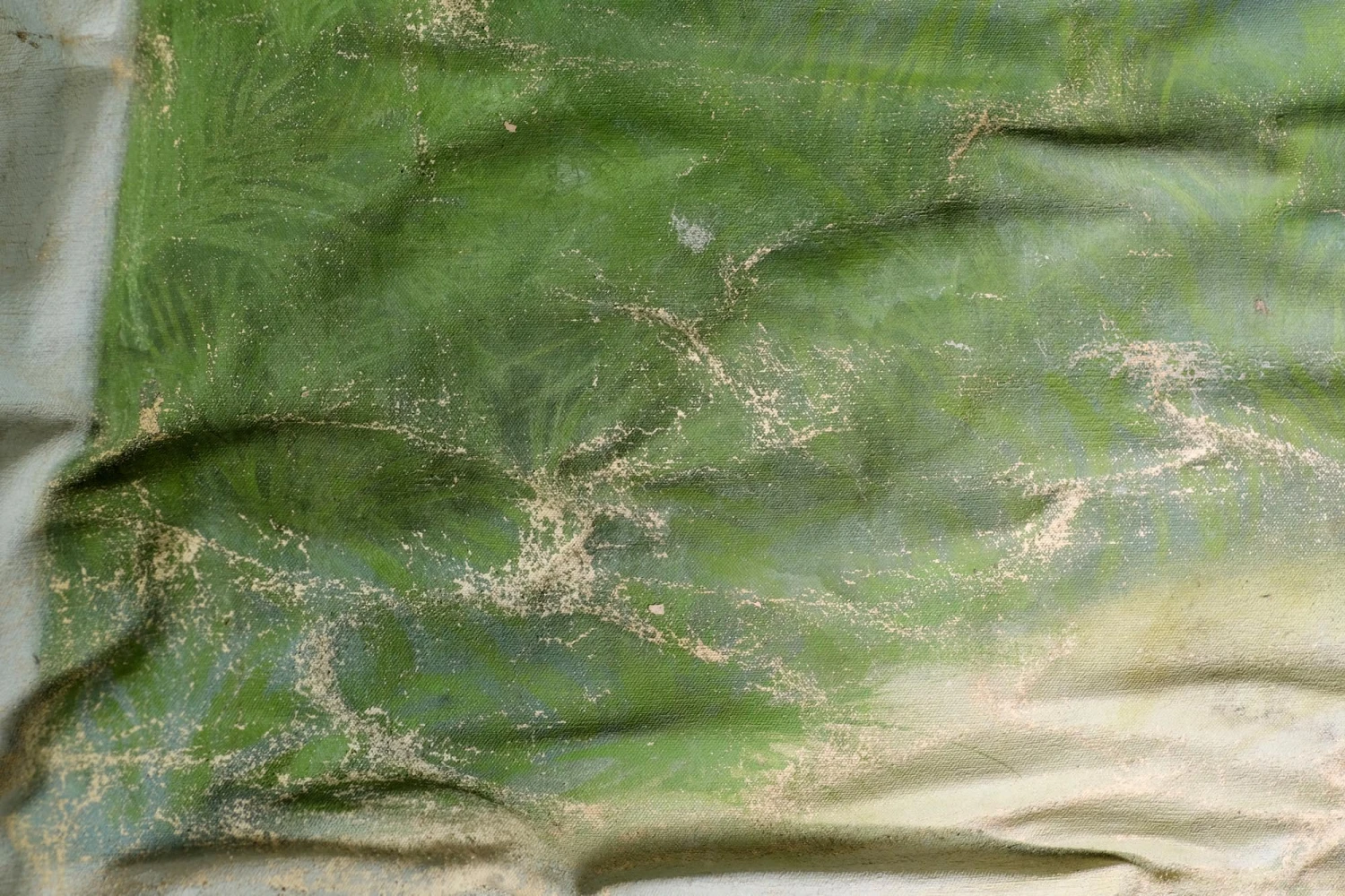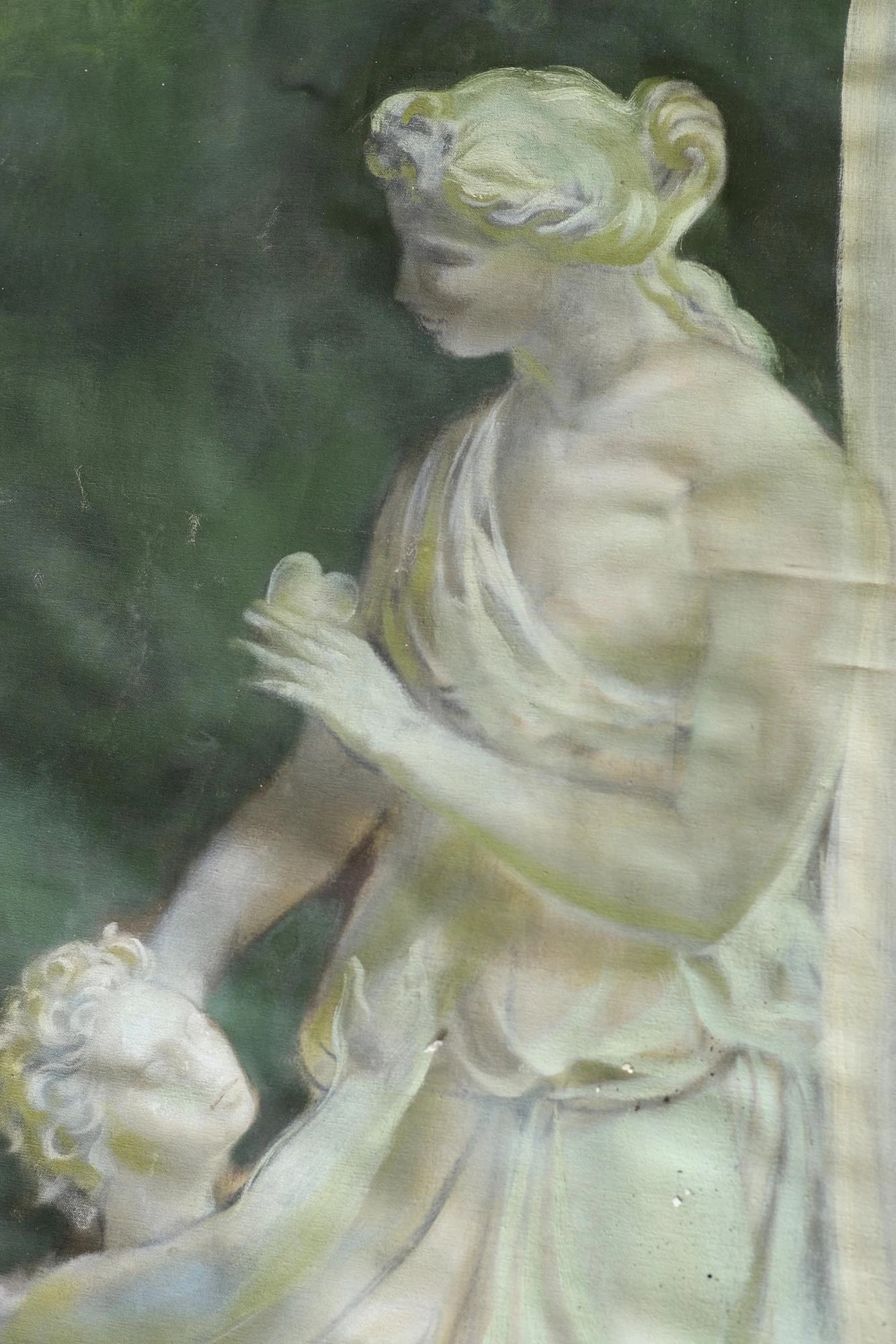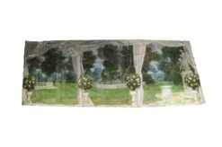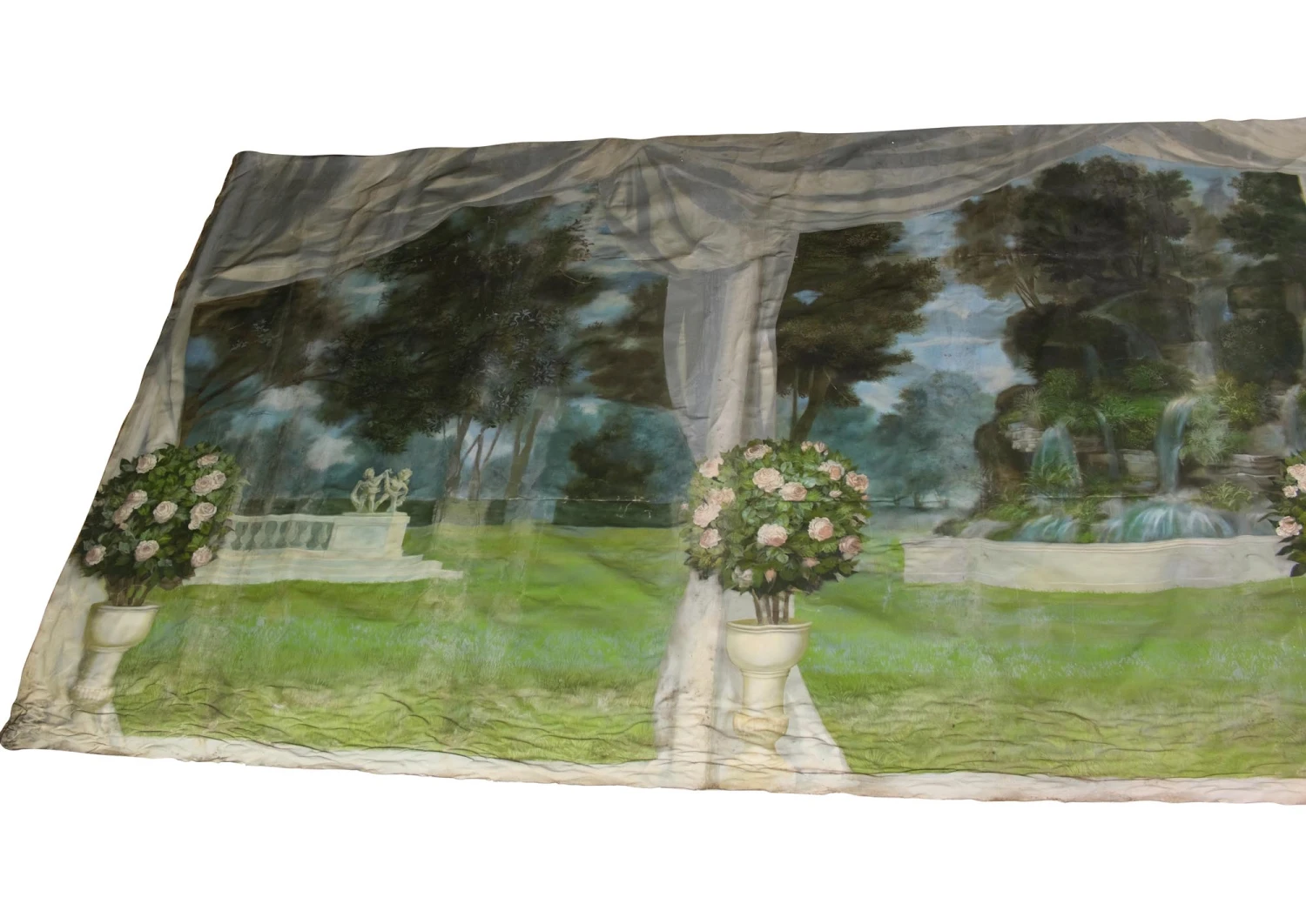 This is a very large and impressive painted canvas mural. It would make an elegant statement on the wall of a banquet hall for an event, such as a wedding or bar mitzvah, or an elegant hotel. The canvas measures 22.5 ft. wide and about 10.25 ft. high. It is hand painted, showing beautiful green gardens full of statues, potted flowers, trees, and waterfalls. There is a white curtain painted along the top edge, making a dramatic addition. The colors are soft and the panorama looks very realistic. This painting may be original. It could also be used as wallpaper. There are some damage-holes, wrinkles, cracks, and light water damage.