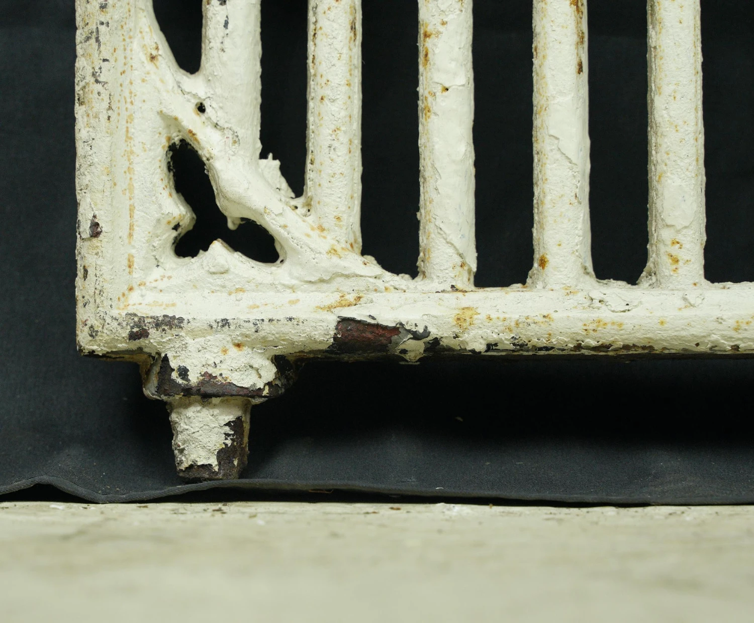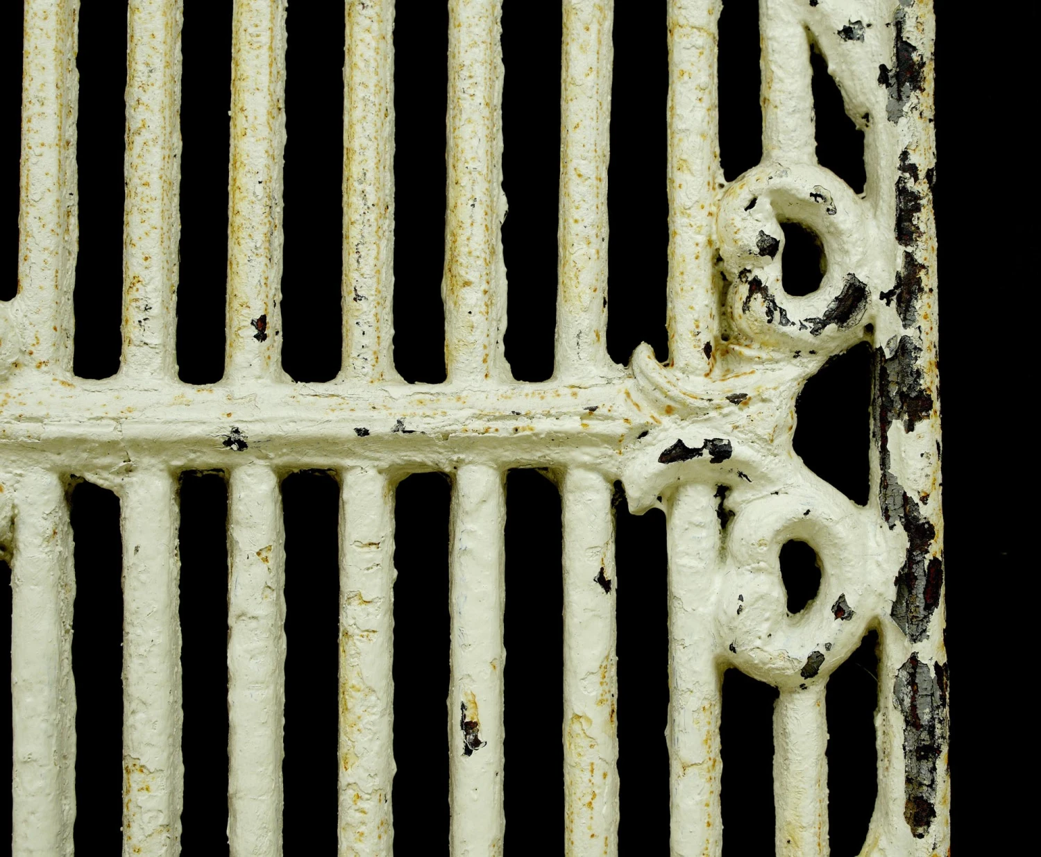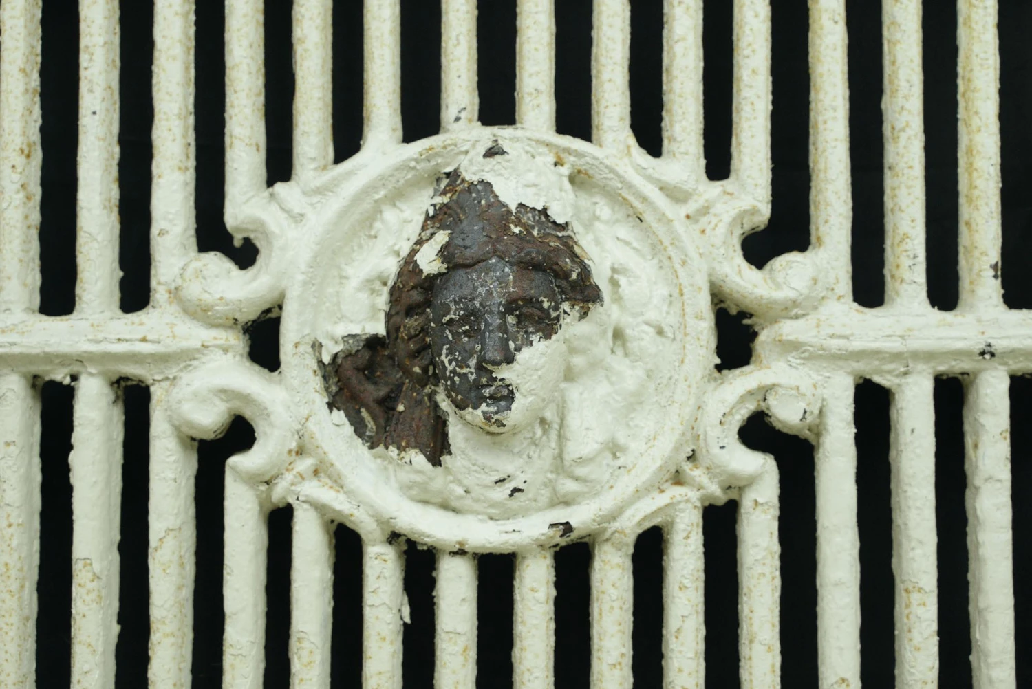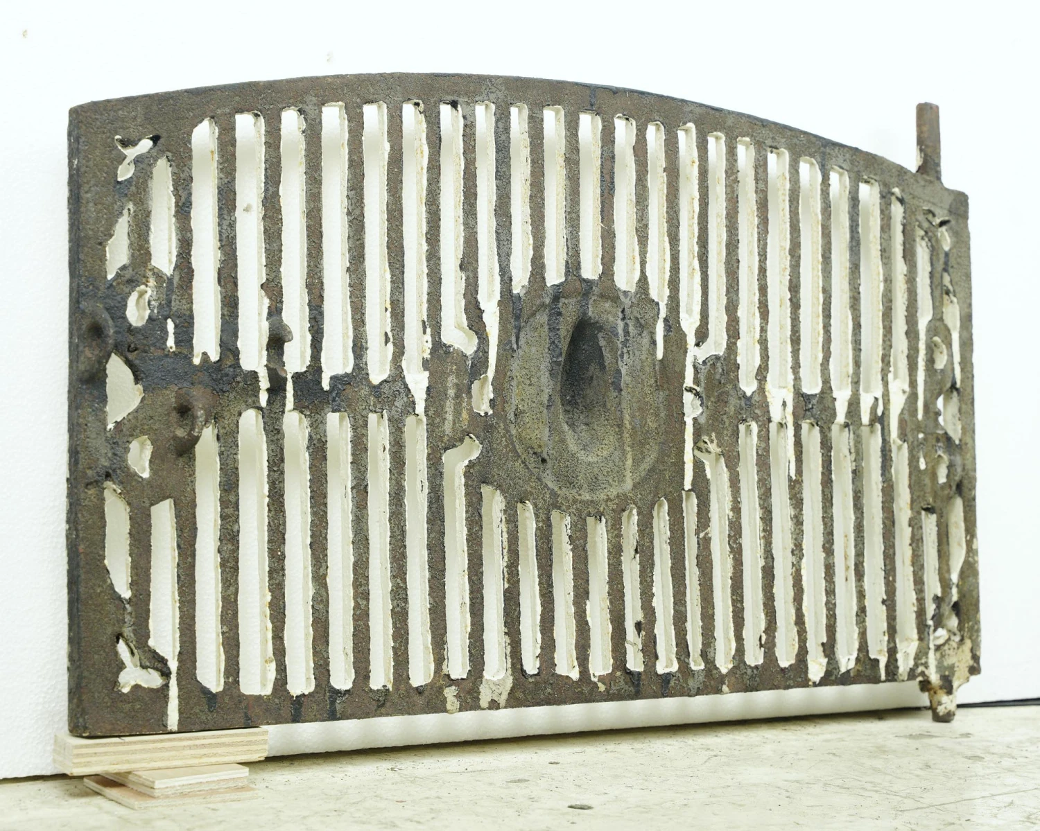 This fireplace cover or coal chute door embodies historical significance. Crafted from cast iron and painted white, this reclaimed door adds a touch of vintage charm to spaces, showcasing the durability of cast iron and reflecting the functional and decorative elements of fireplaces from the past. This is in good condition with surface wear.
