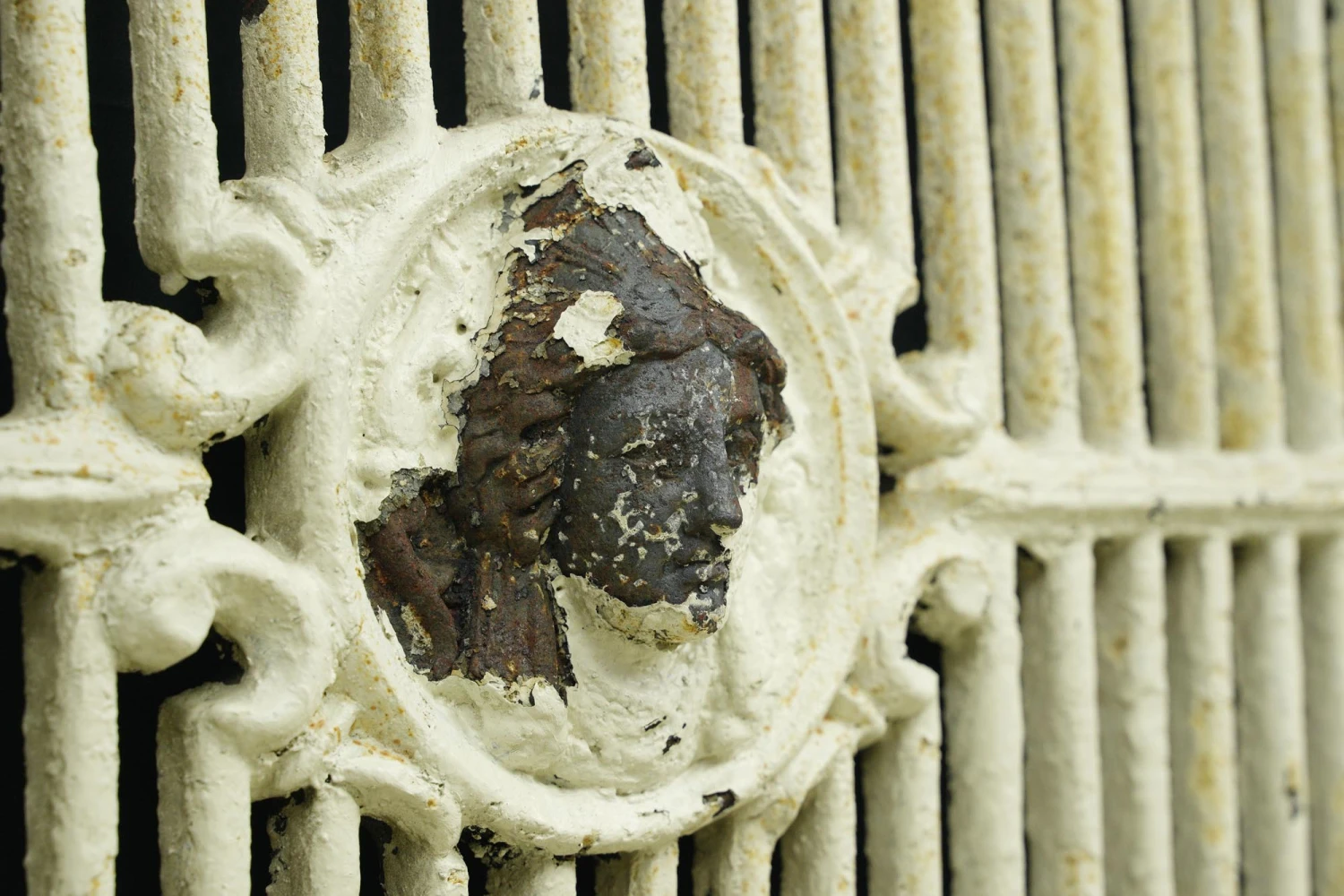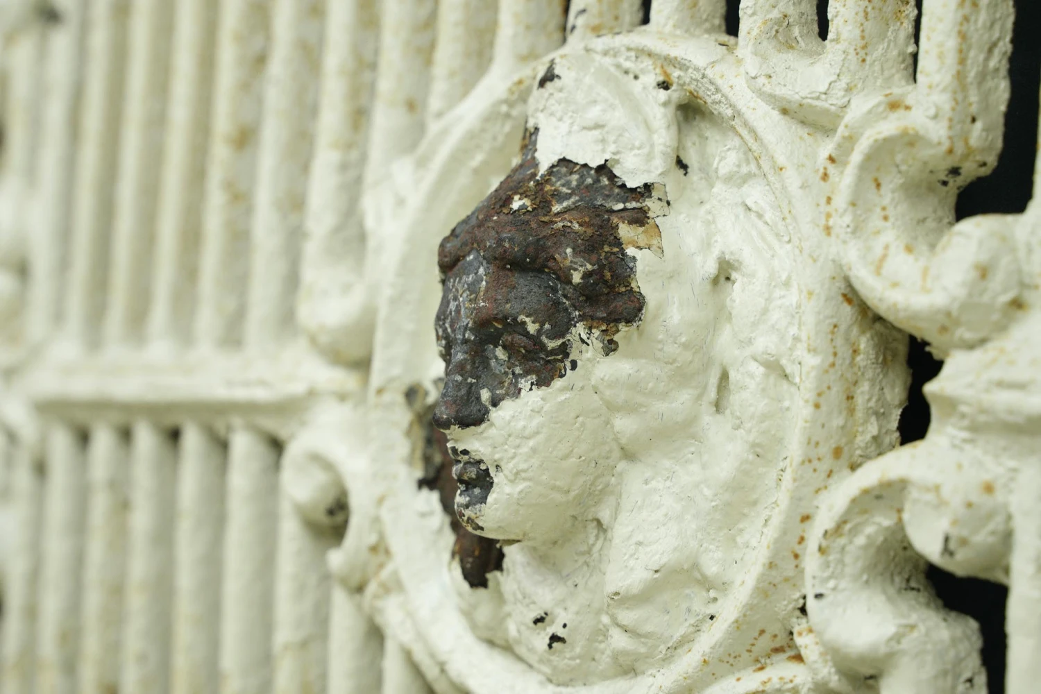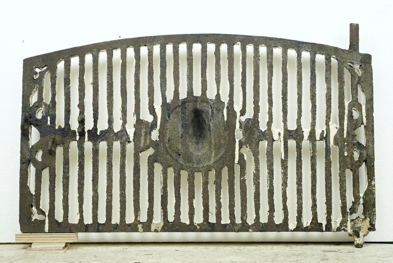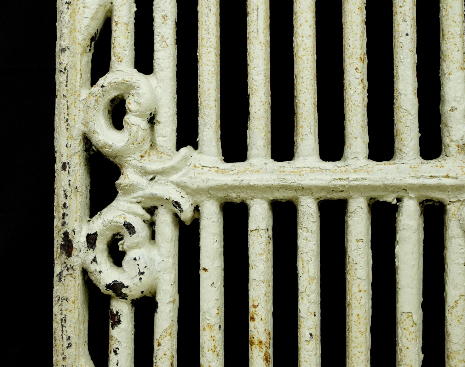 This fireplace cover or coal chute door embodies historical significance. Crafted from cast iron and painted white, this reclaimed door adds a touch of vintage charm to spaces, showcasing the durability of cast iron and reflecting the functional and decorative elements of fireplaces from the past. This is in good condition with surface wear.