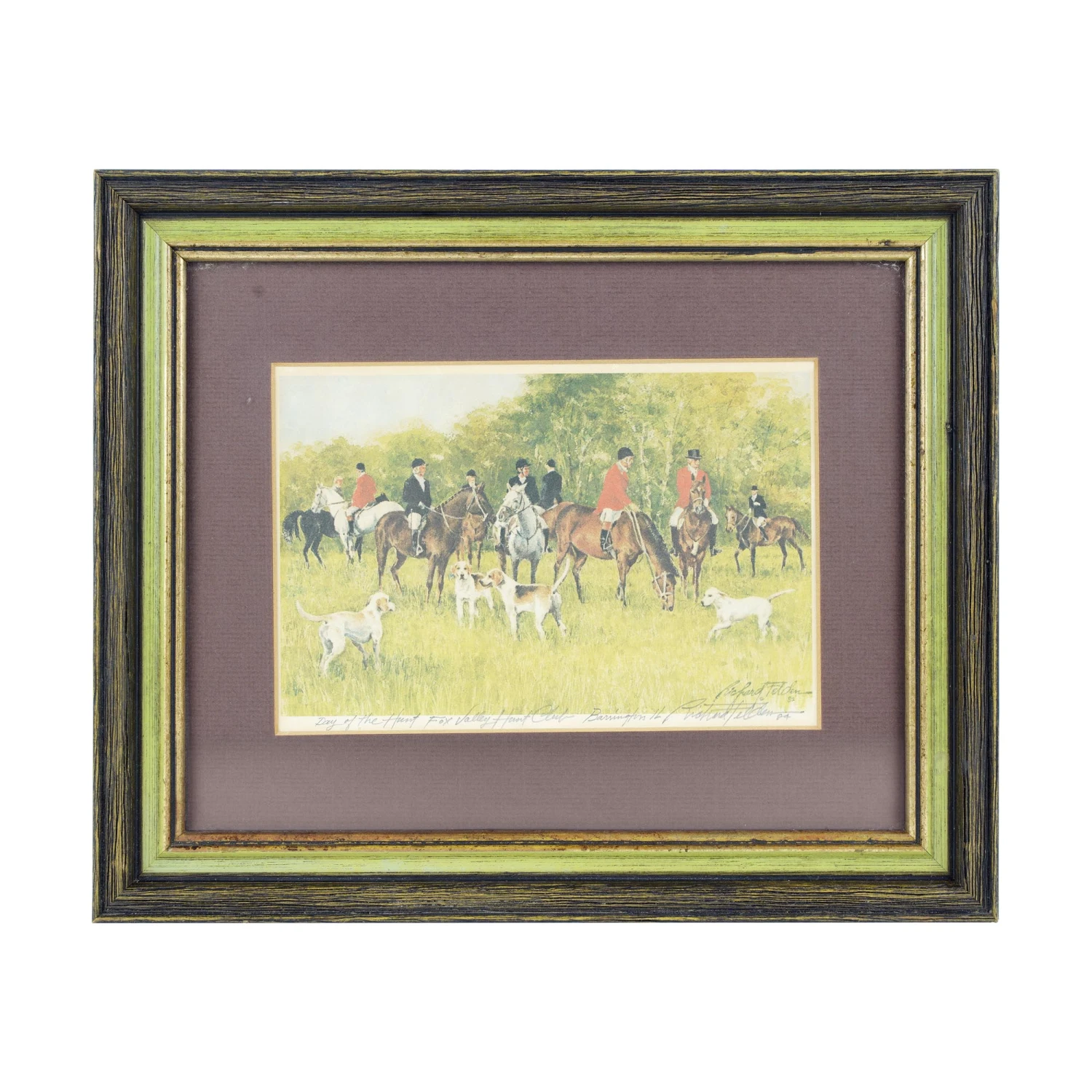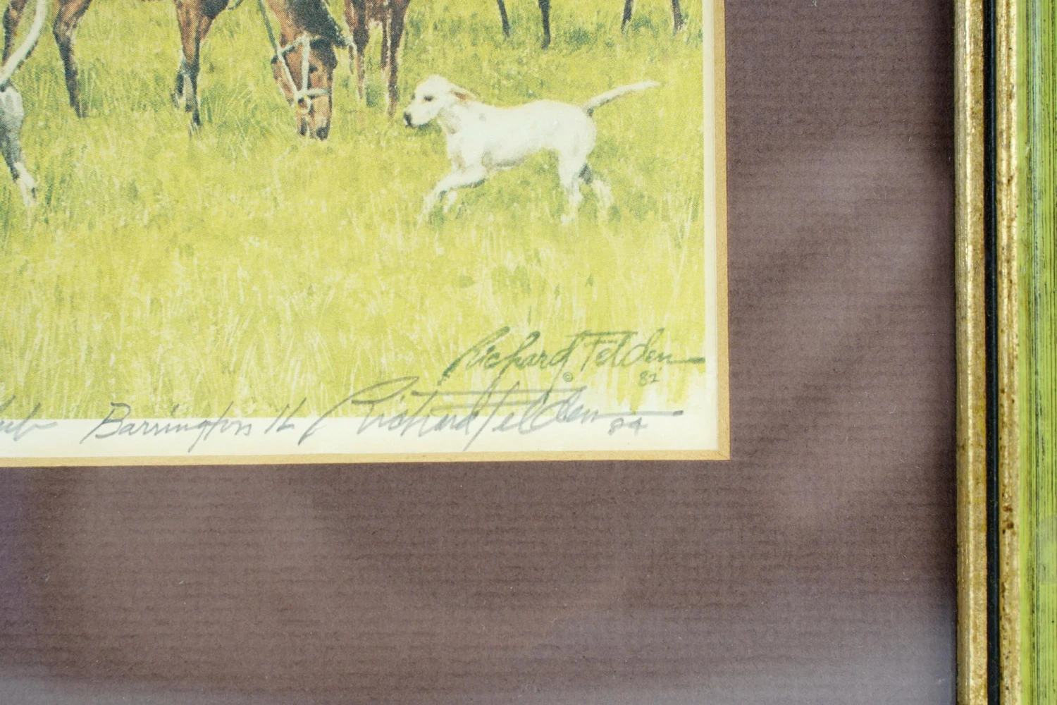 This wood framed print of the watercolor painting is titled “Day of the Hunt Fox Valley Hunt Club, Barrington IL”, by artist Richard Felden in 1982. The print was made in 1984 by Felden himself. The glass is intact and there is a mounting wire attached to the back. This is in good condition. The frame has some blemishes. Please see the photos.