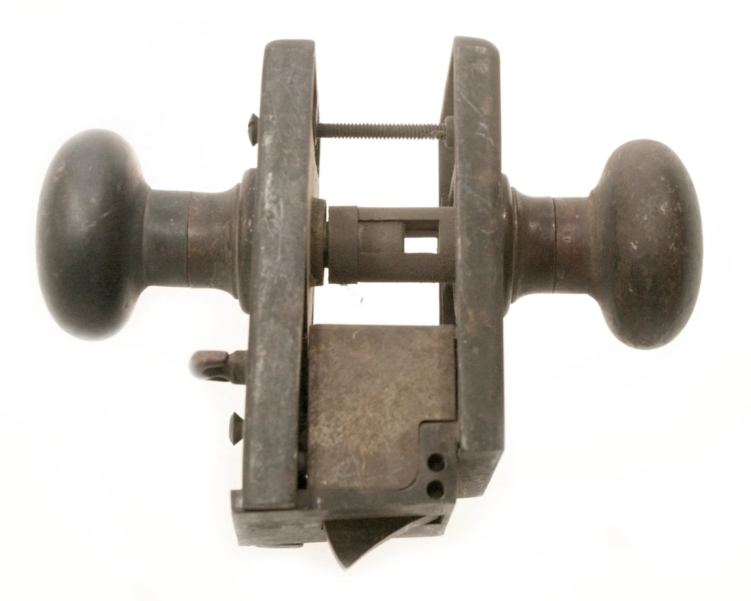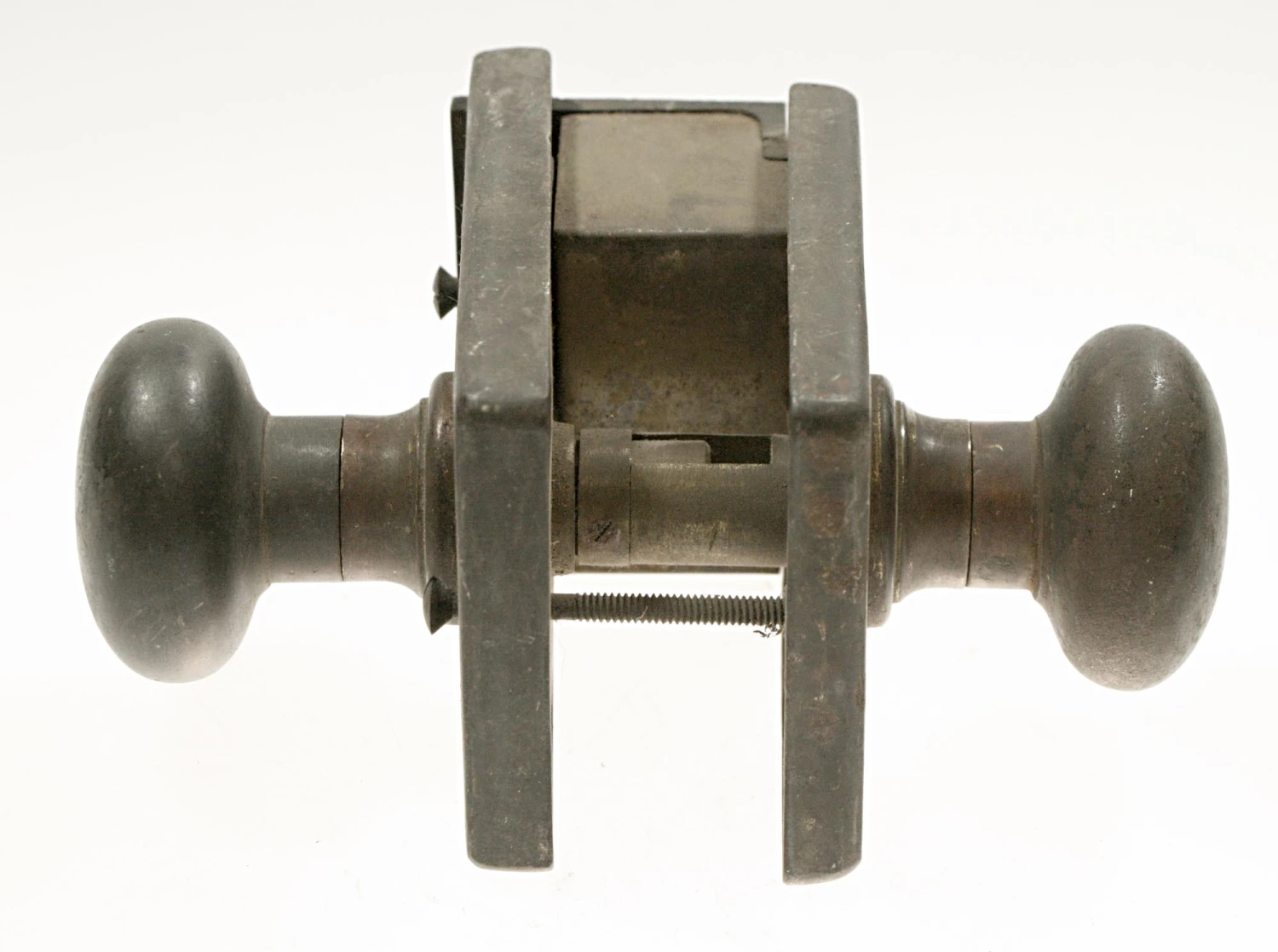 Dark cast bronze Russwin door knob set with a basic Mid Century design. Made for an interior door. Set includes a pair of doorknobs, two back plates and an attached lock.