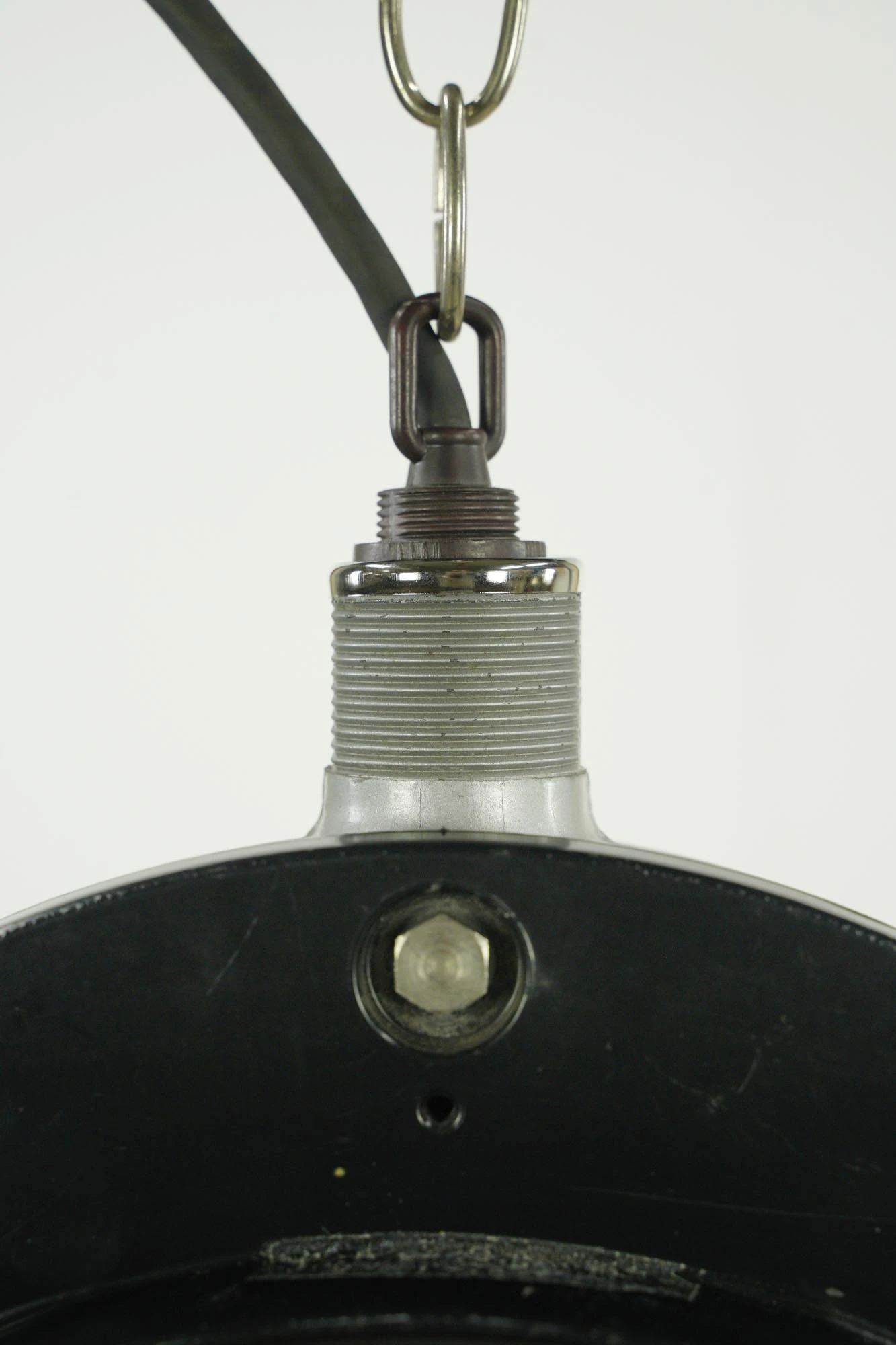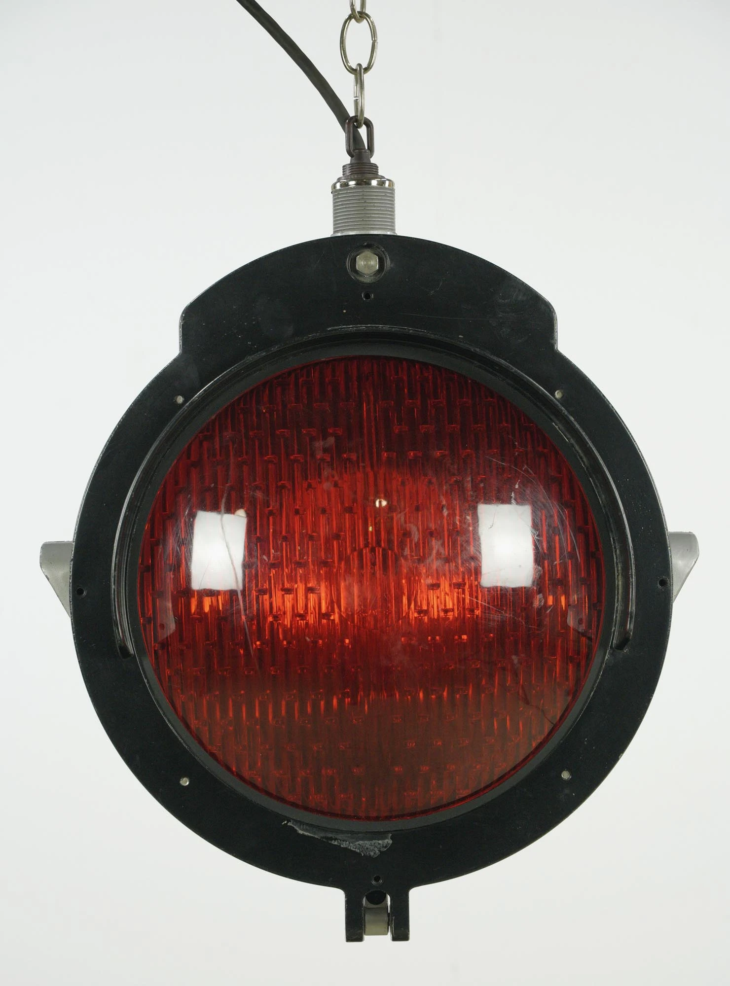Black aluminum rail yard pendant light with red glass. Made by Safetran Systems Corp. No canopy. The back of one needs a paint job. Good condition with appropriate wear from age. Priced each.