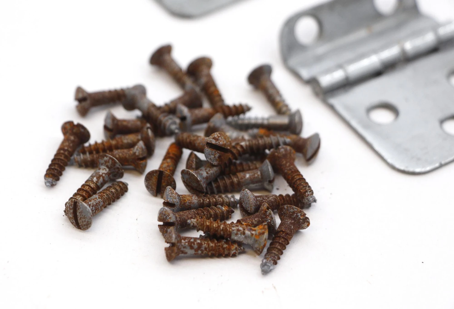 These hinges showcase a vintage steel design with an offset configuration. While they may exhibit oxidation and a fair to good finish condition, these hinges remain fully functional, offering a perfect blend of character and utility. Priced per set of ten.