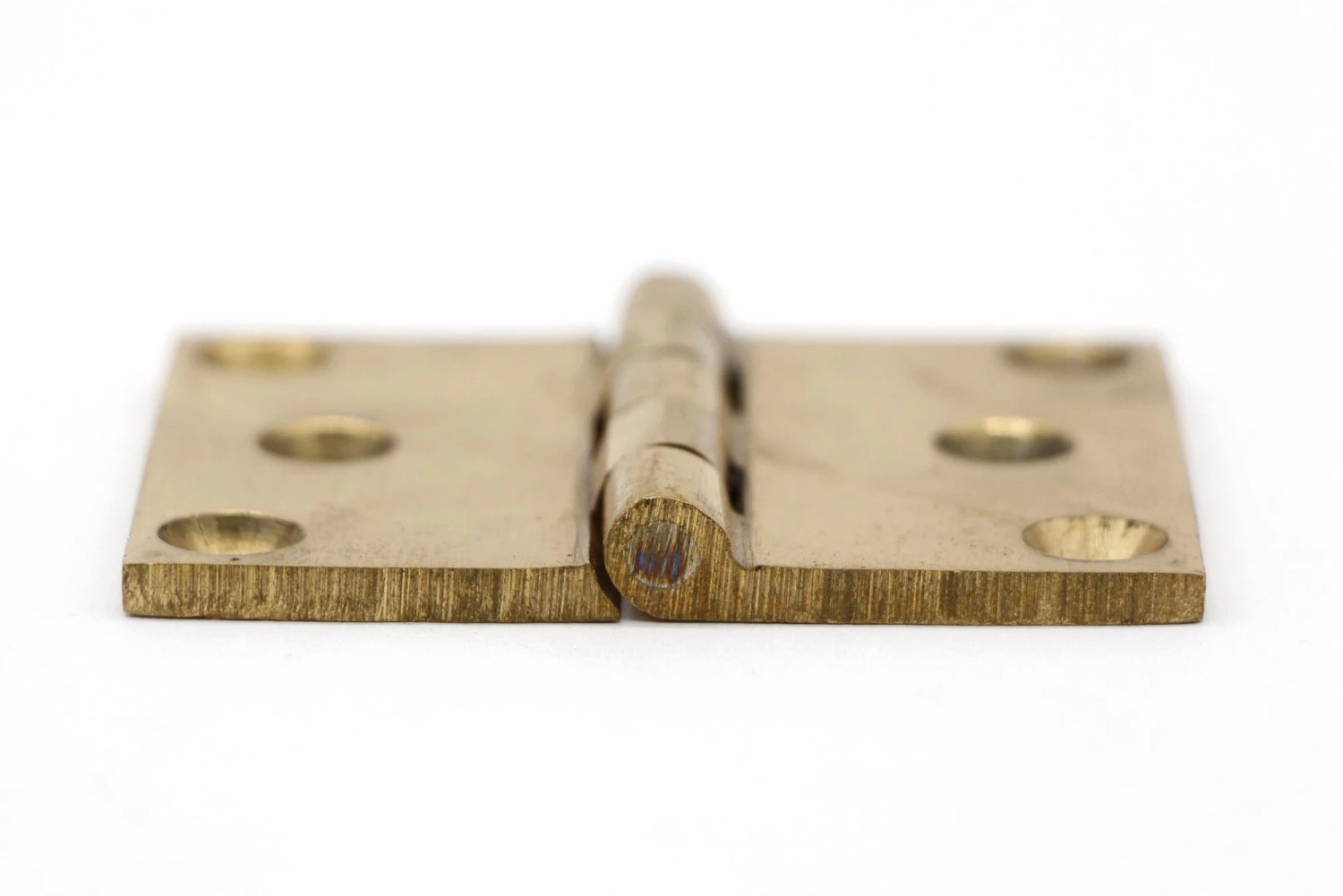 Brass furniture butt hinge with flat tips and five knuckles. Made by Corbin. Priced as a set of four.