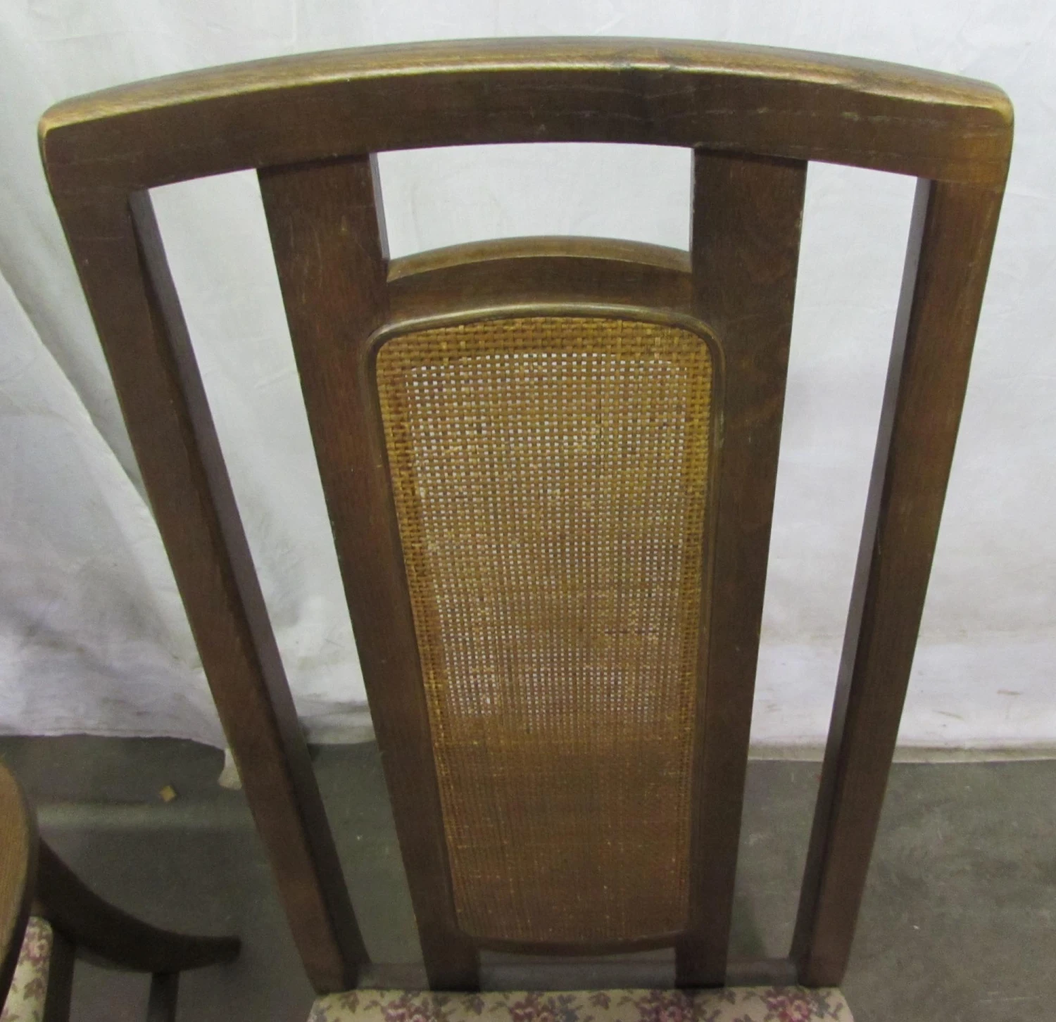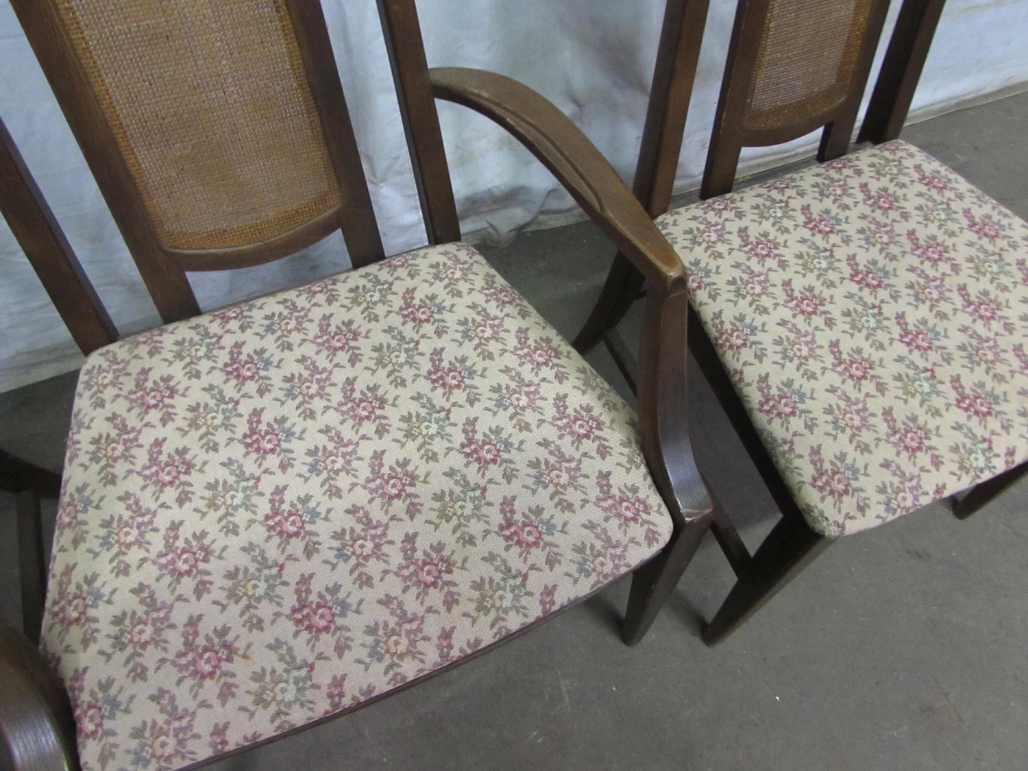 Set of four high back solid wood chairs with wicker backs and tan and pink floral upholstered seats. The wicker is in great condition. One chair has arms and three do not. The seats need to be reupholstered.