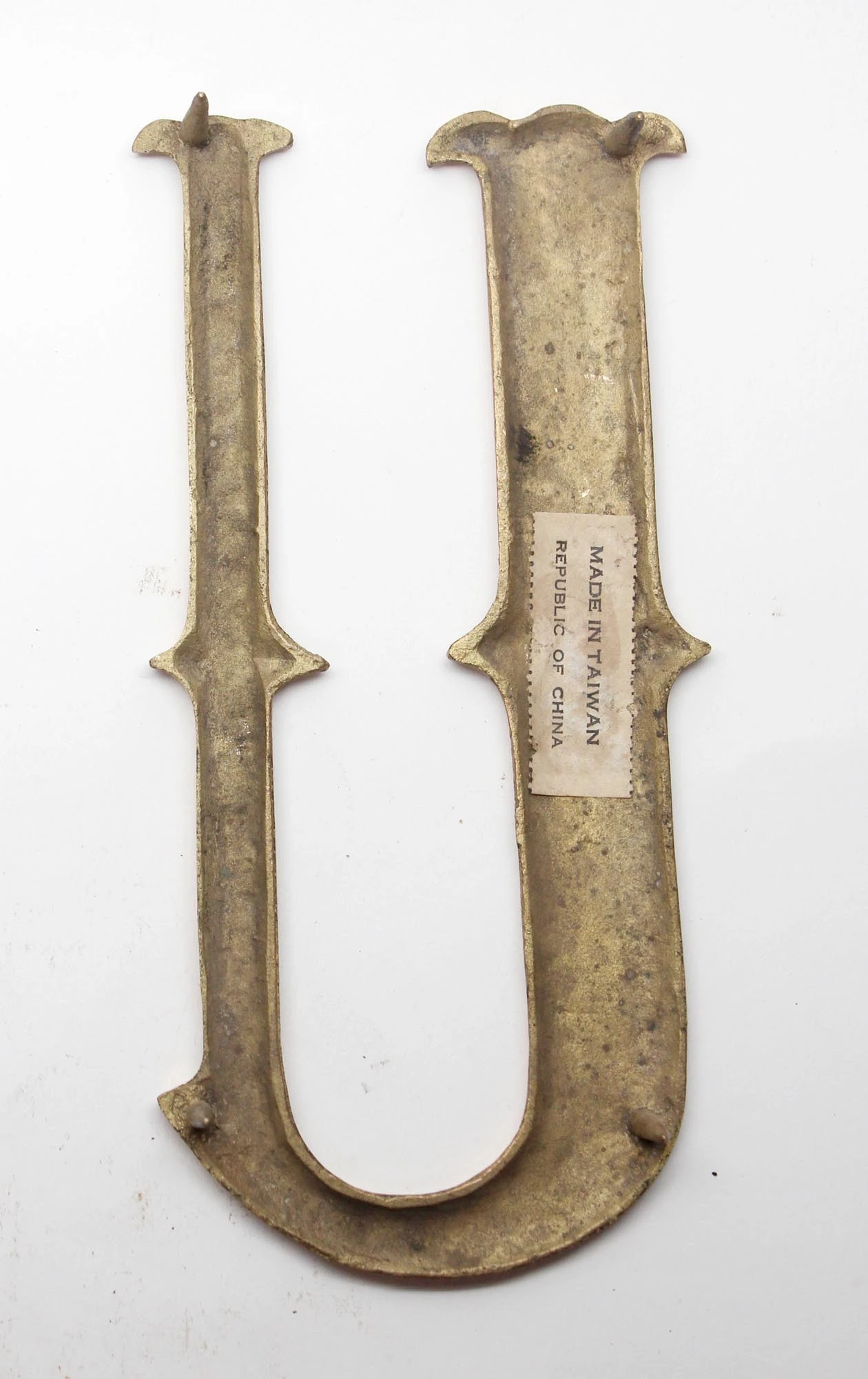 Solid polished brass U letter with 4 prongs on the back. It can be used as a trivet or on a wall application. Priced each.