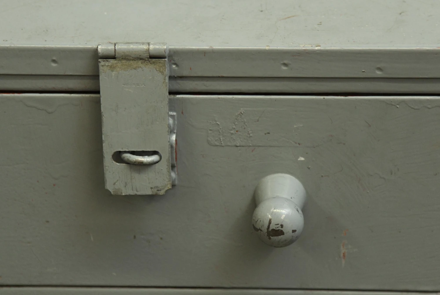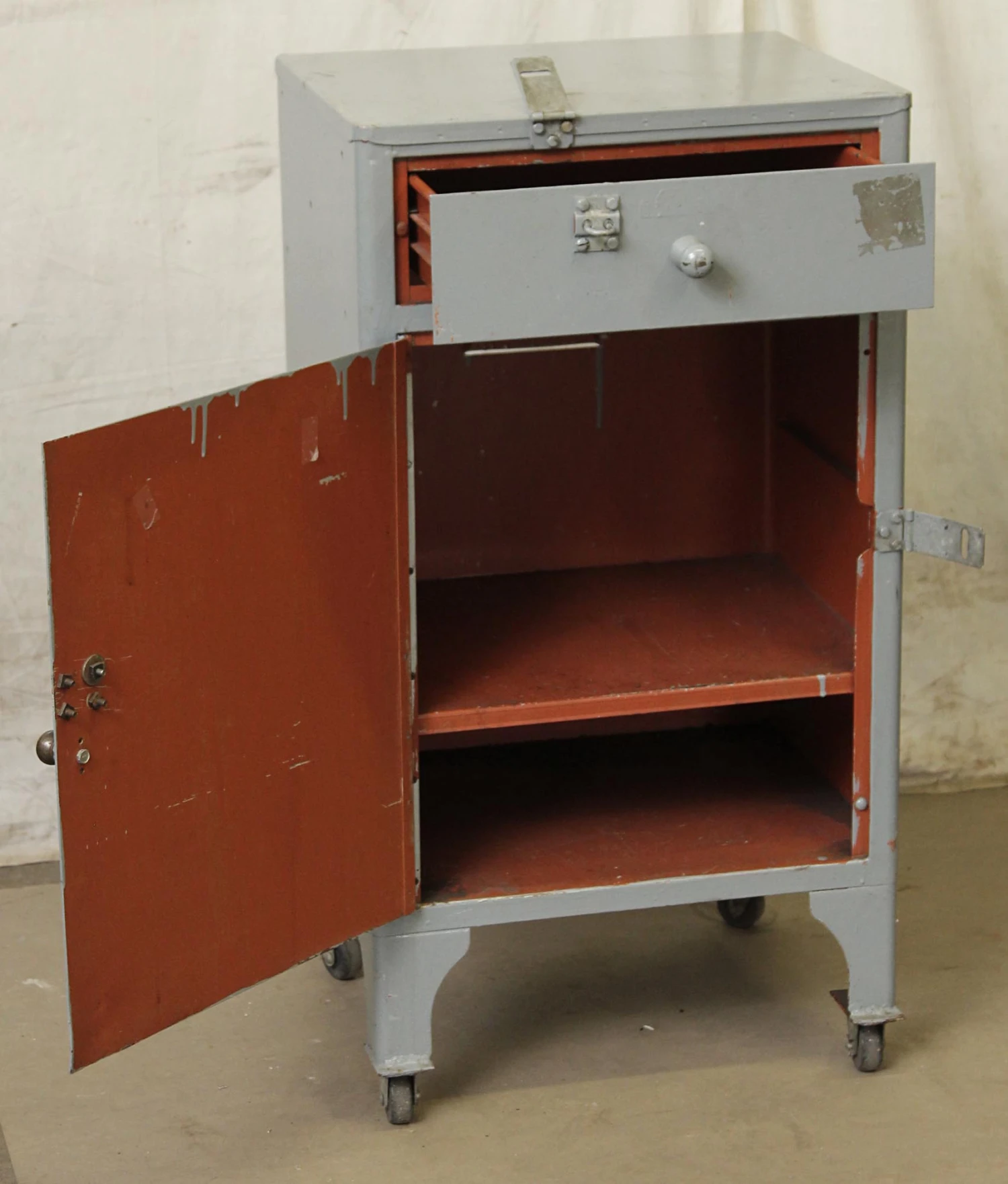 Steel cabinet paint gray. This looks like it was originally a reddish color. It is unbranded. Towel bar mounted. Features one drawer and one bottom cabinet with two shelves.