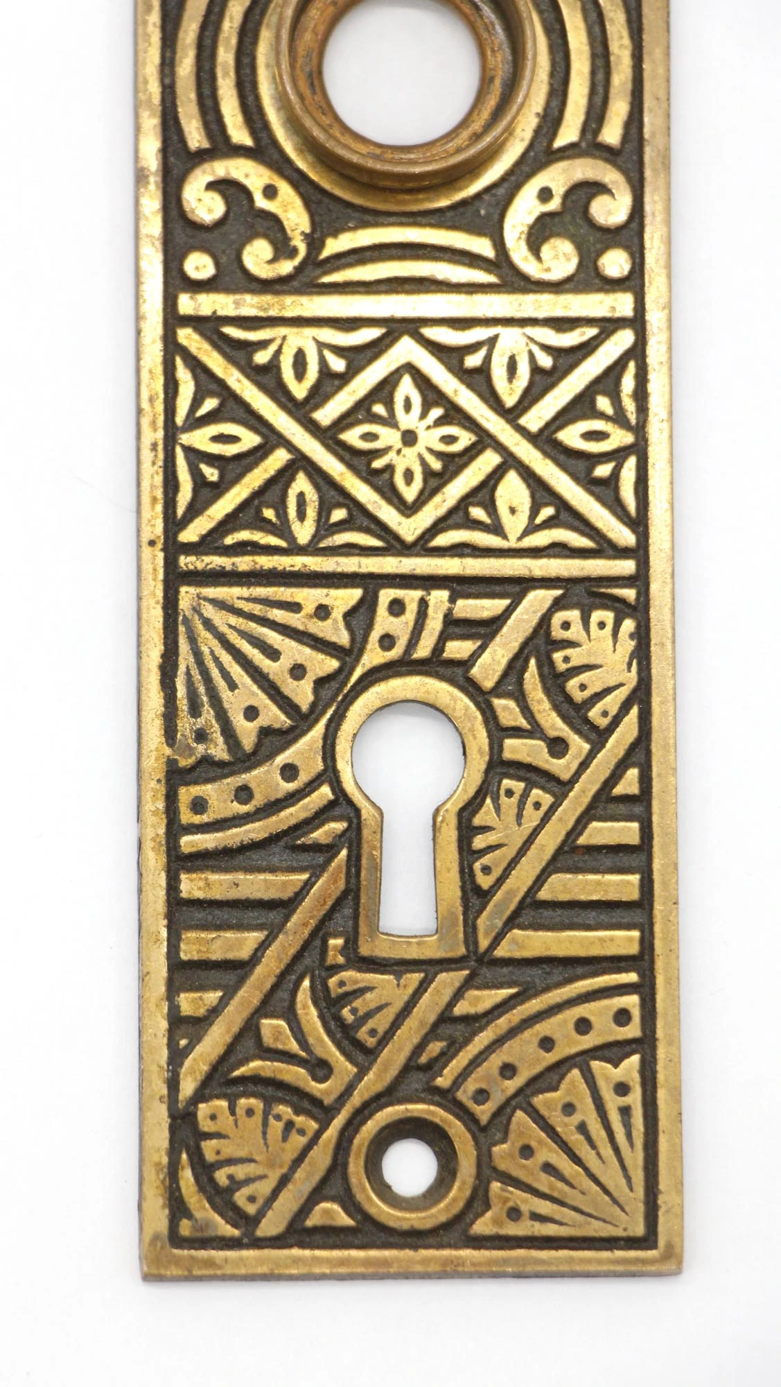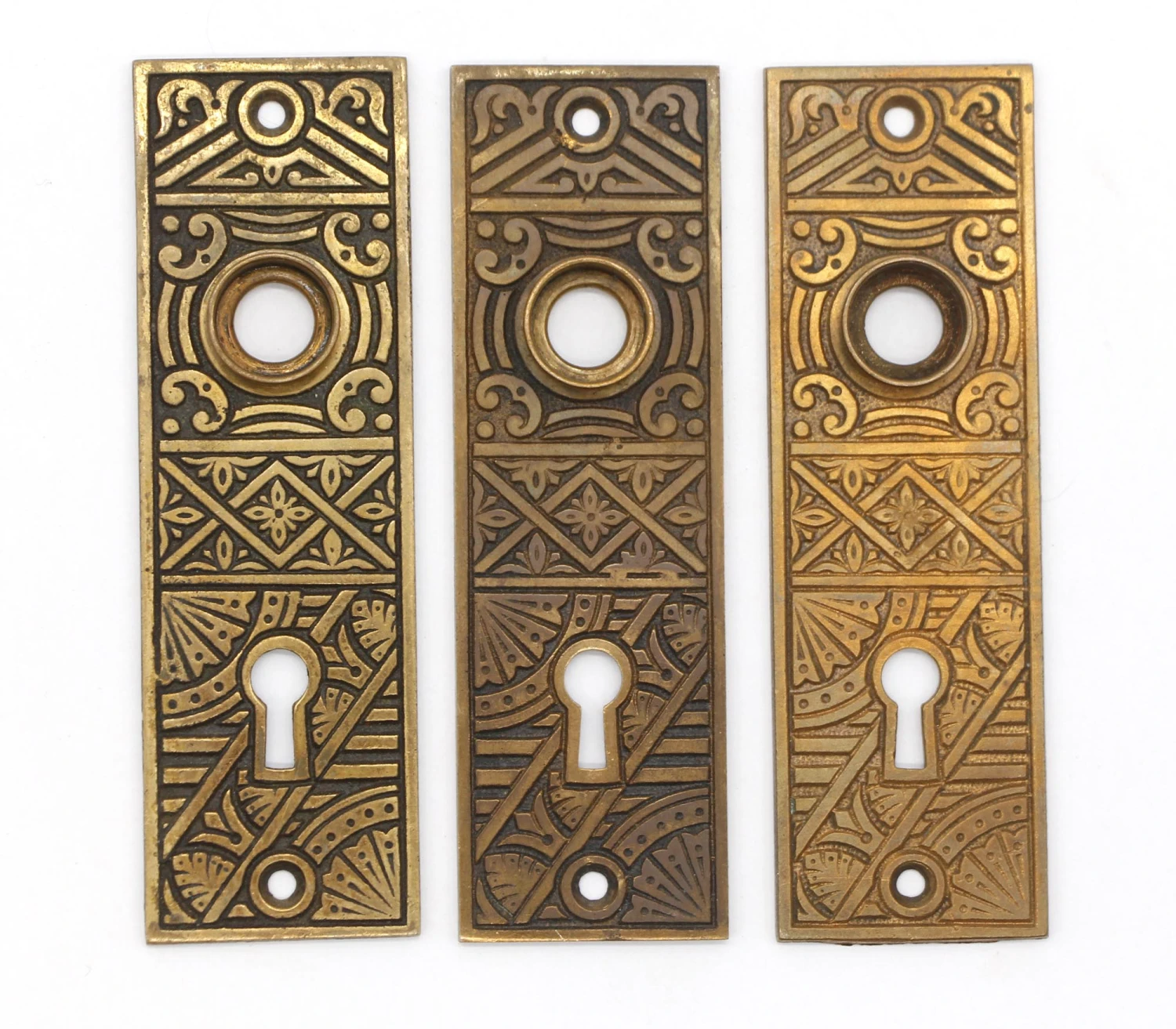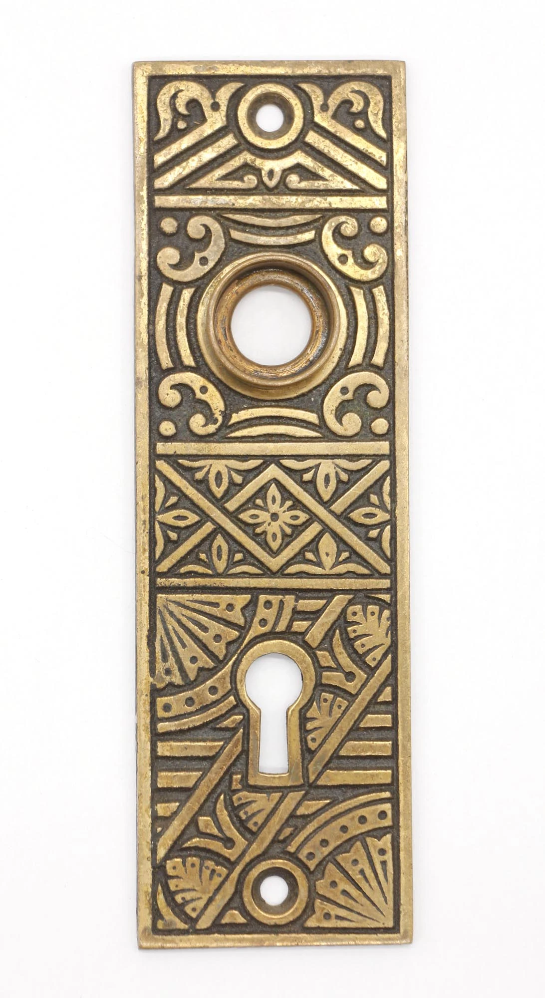 Bronze back plate with a keyhole and an ornate Aesthetic design. Patinas vary. Please see the photos. Priced each.