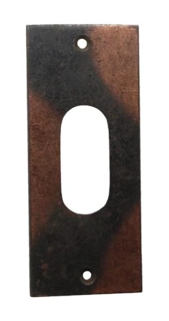 Pocket door plate made of steel with copper and black finish known as japanning. The back recessed panel not attached. One available.