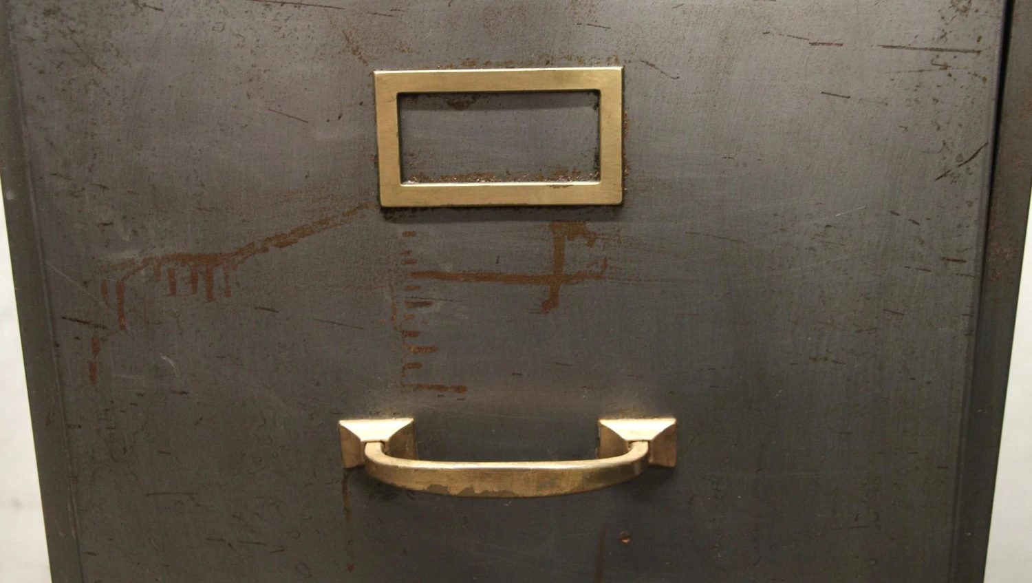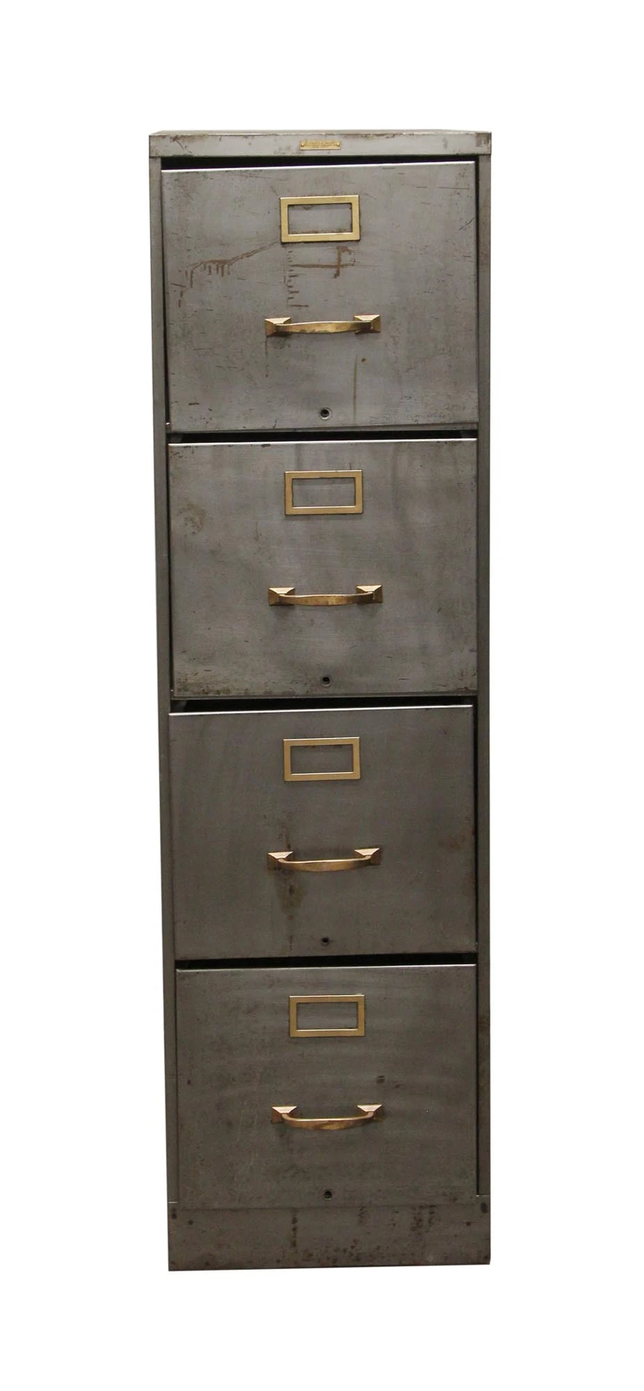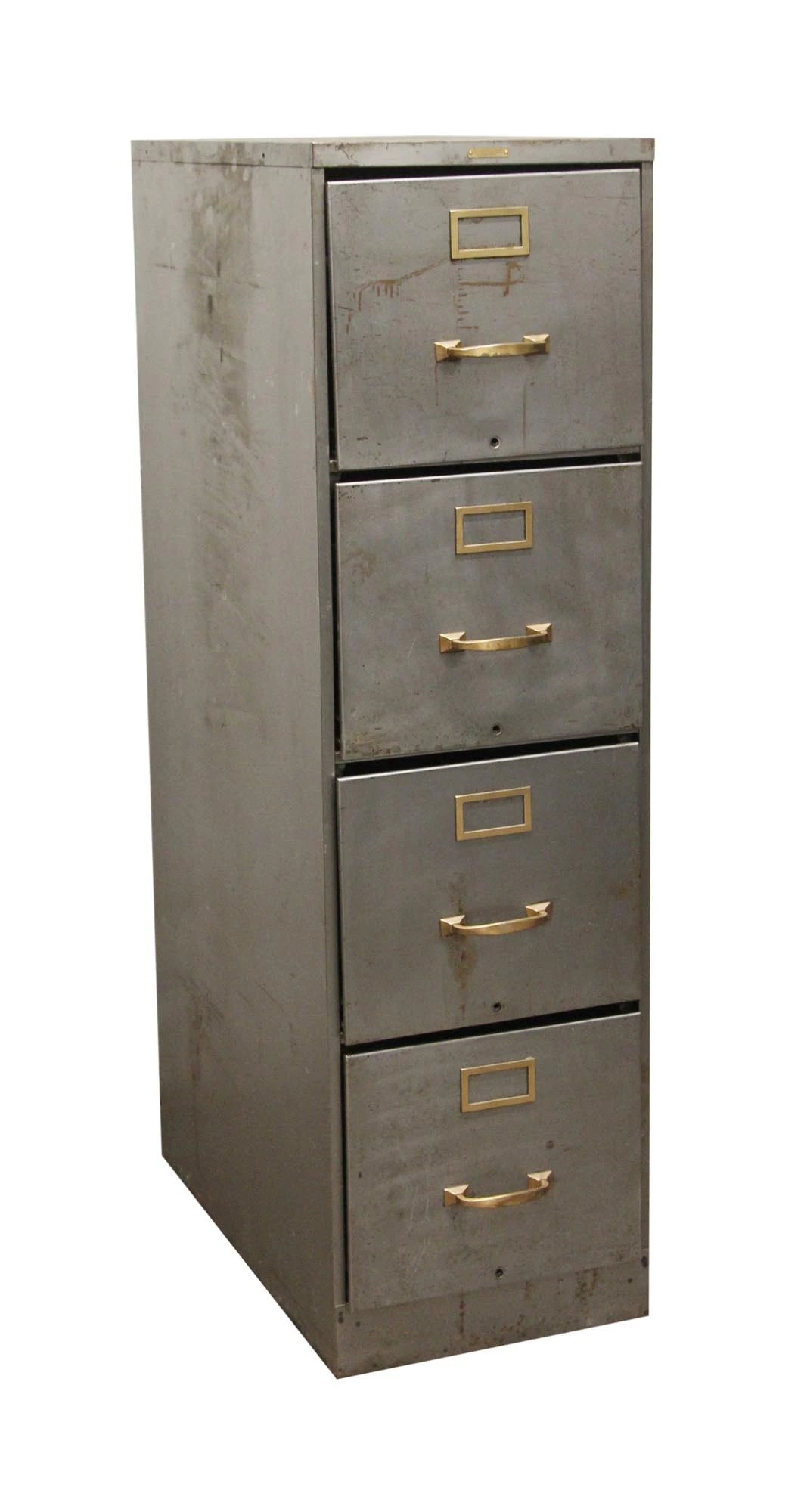 Four drawer industrial metal cabinet with original brass hardware. Made by Steelcase.