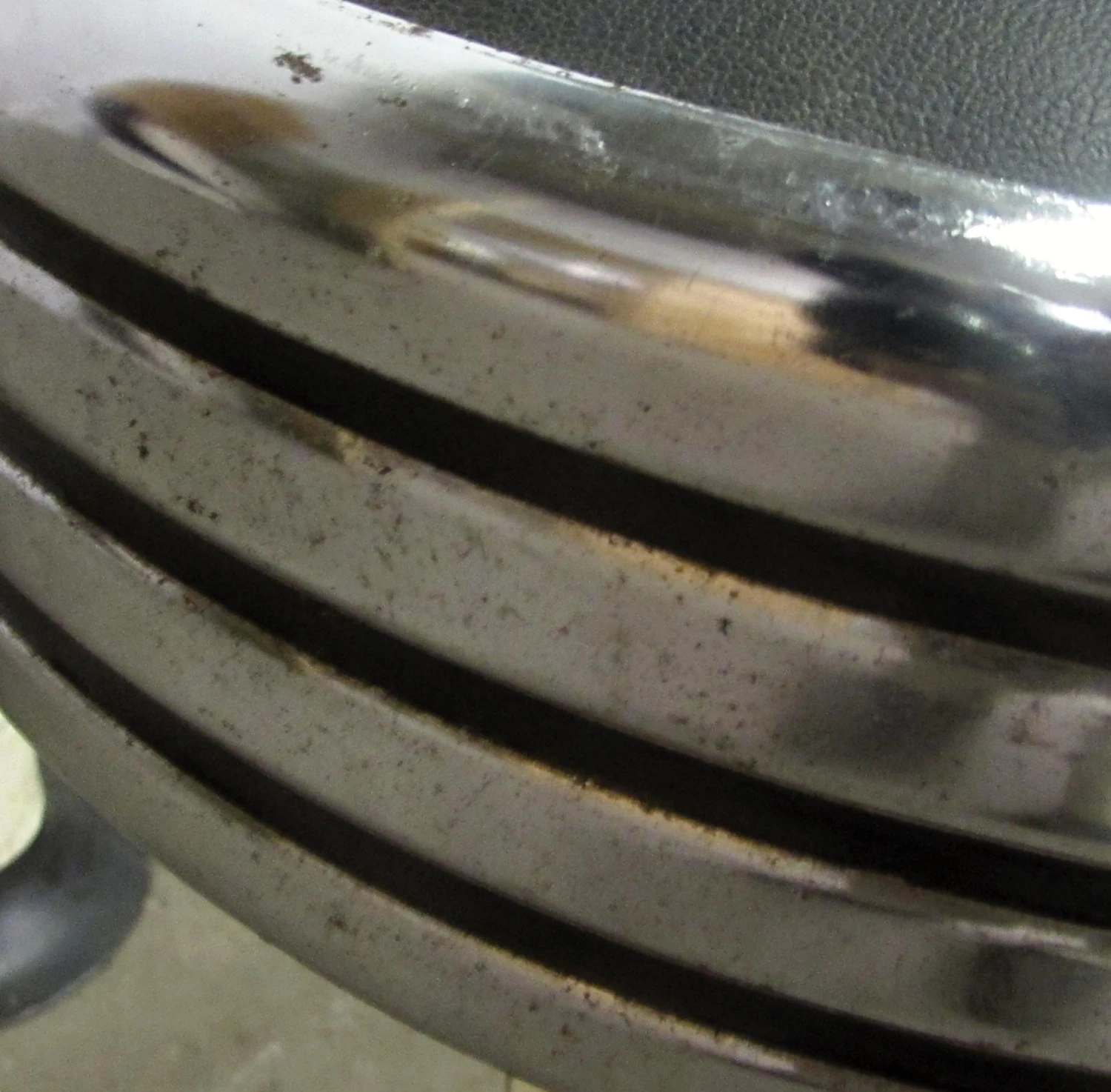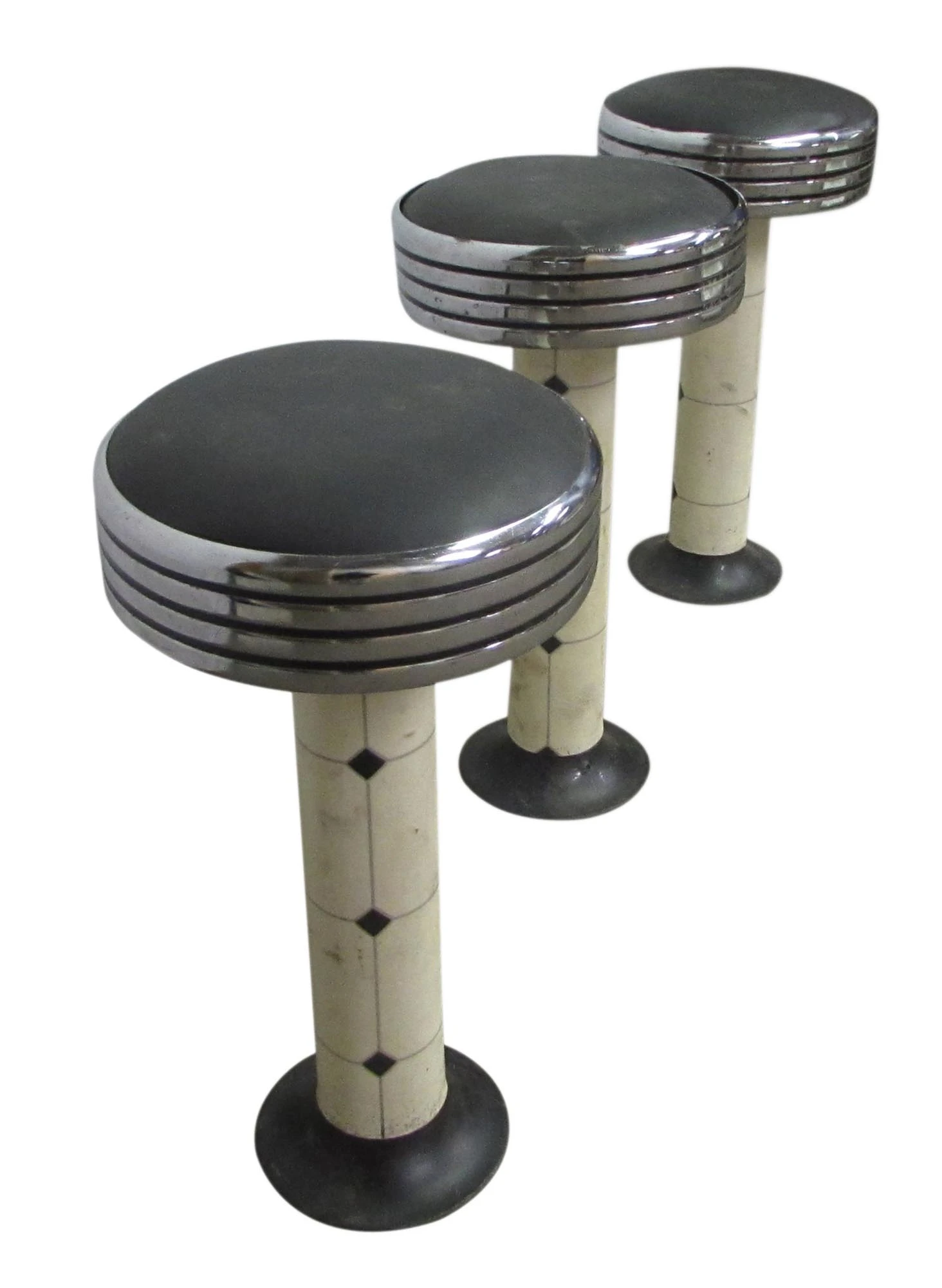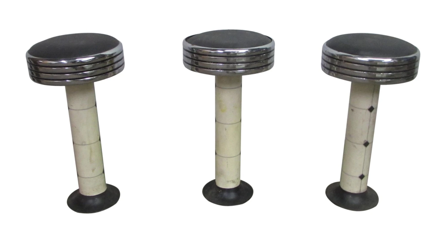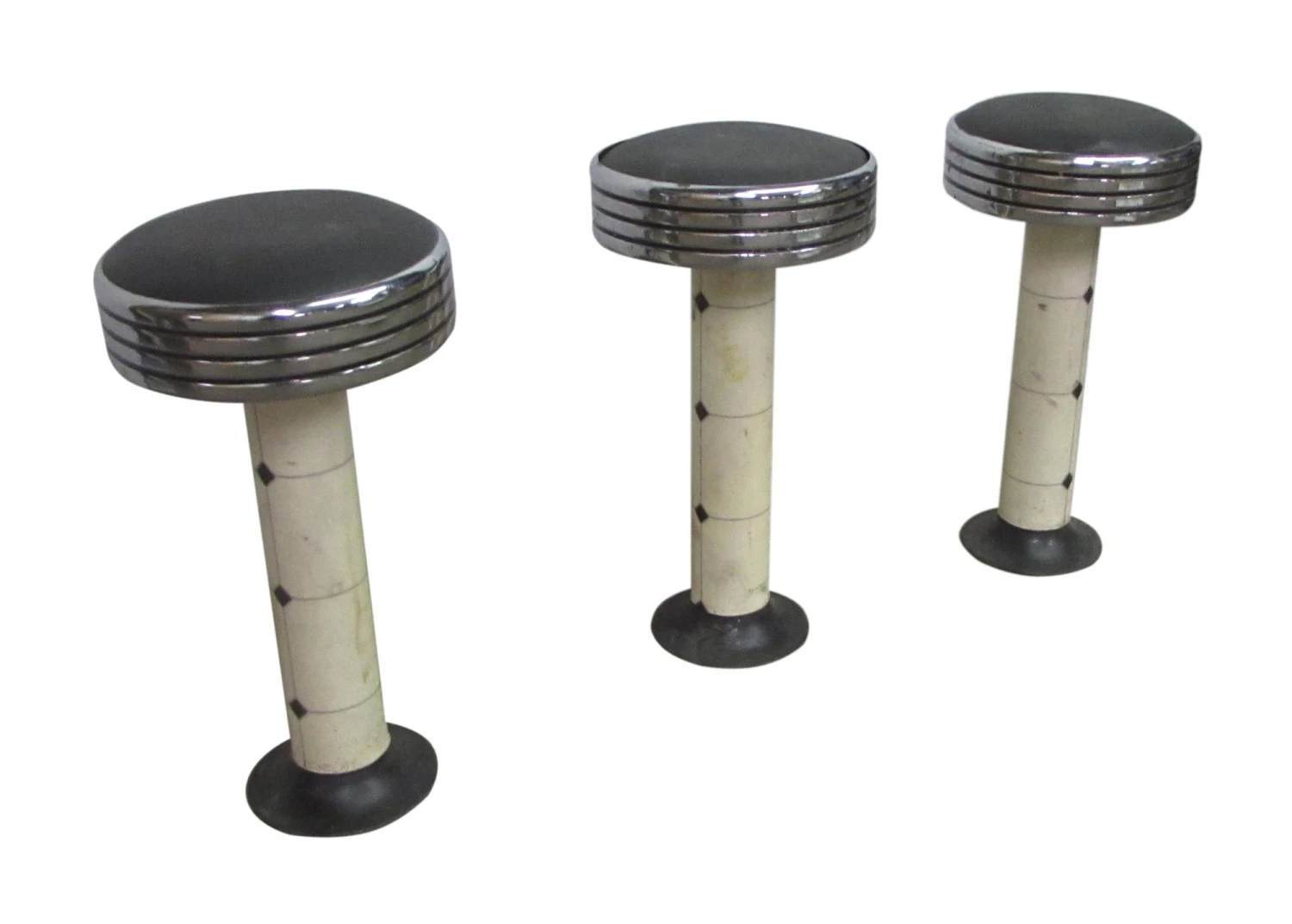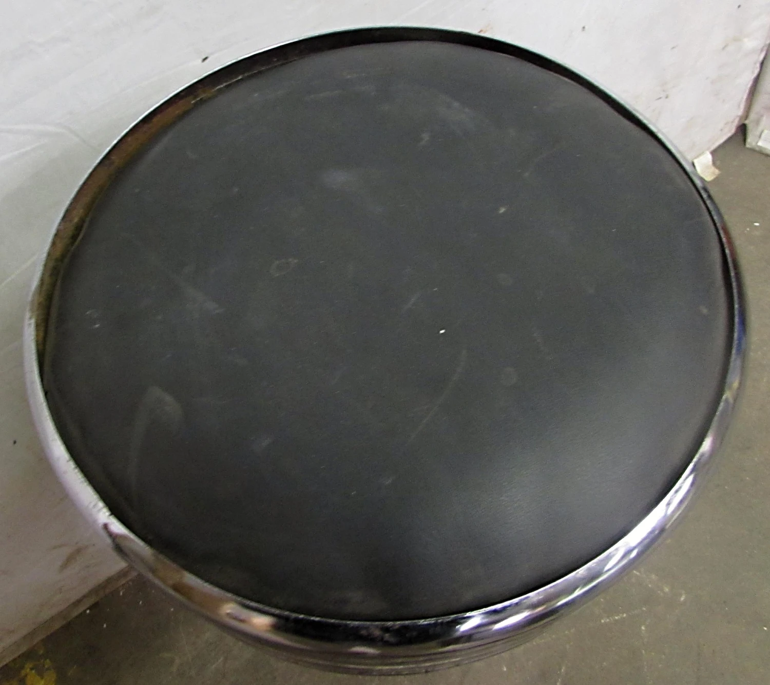 1950s Diner or bar style stools that attach to the floor at the base of the seats, with a round chrome riveted seat edge and black vinyl tops. Priced each.