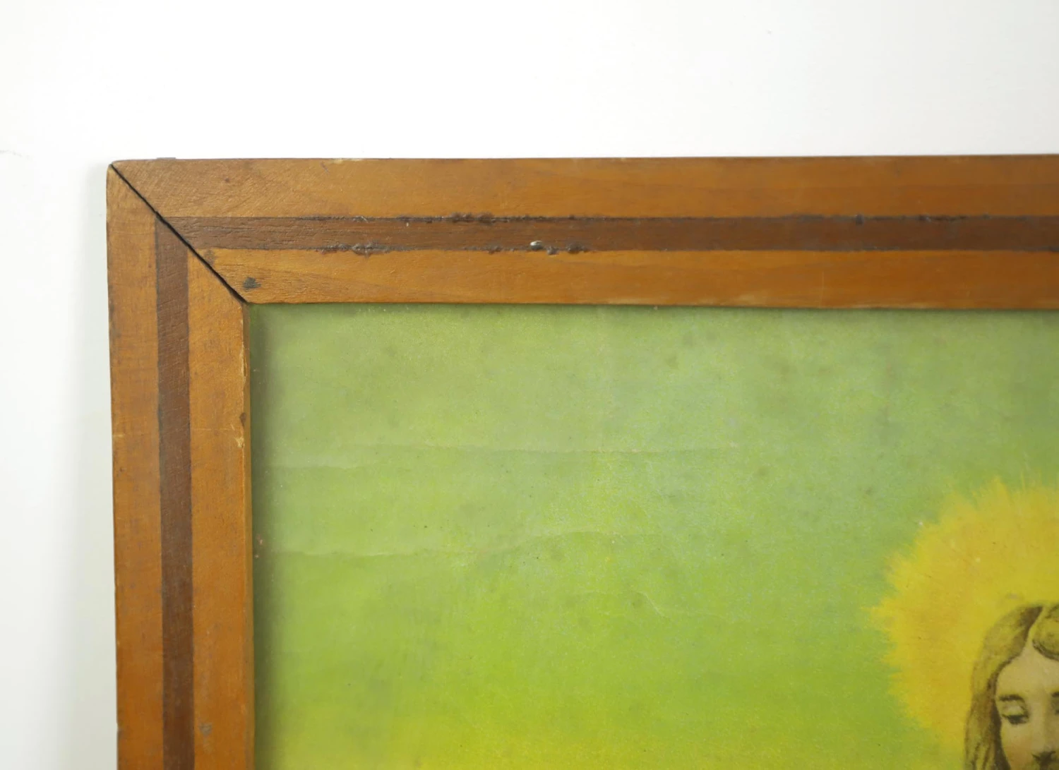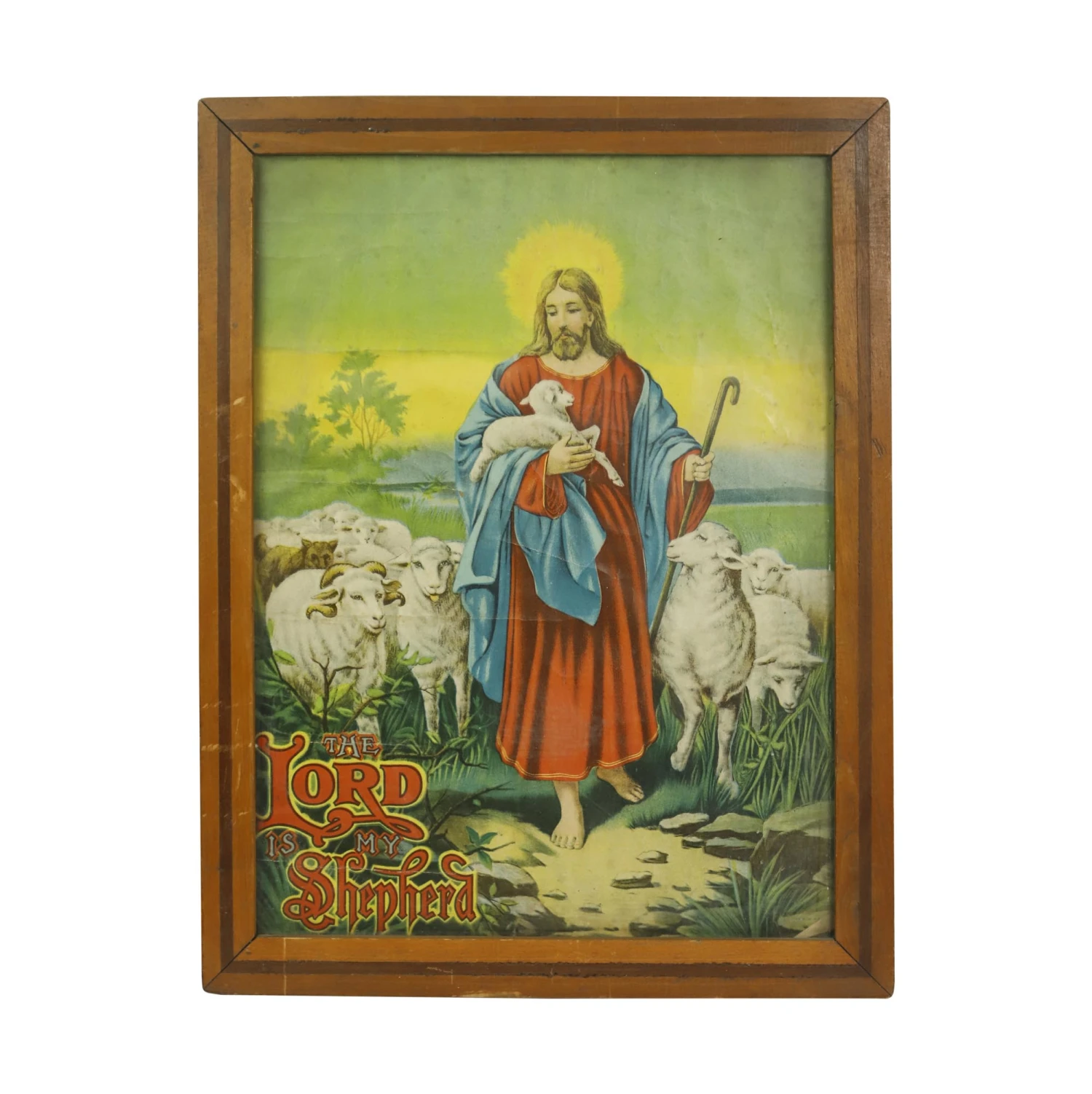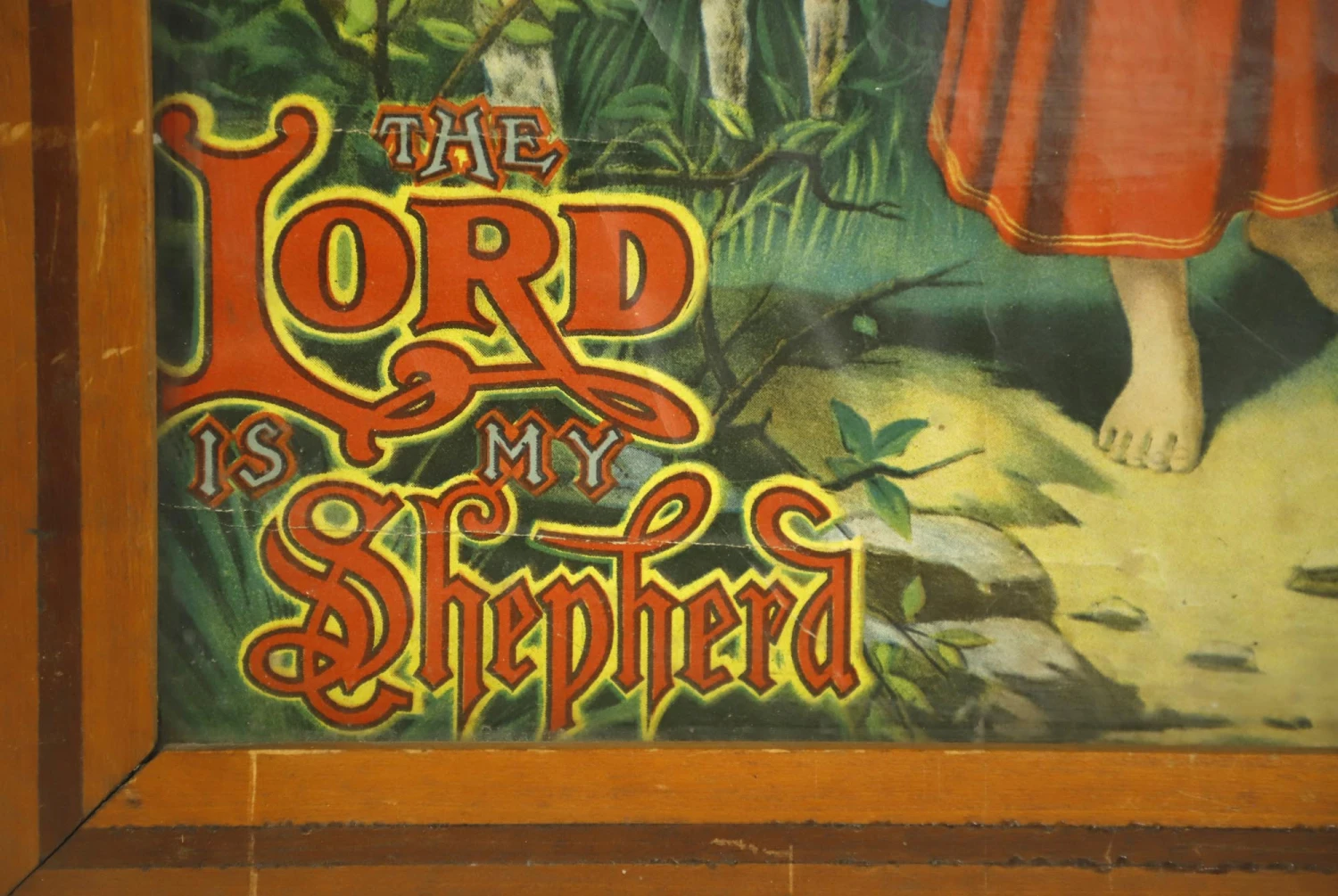 Wood frame “The Lord Is My Shepherd” print. There is expected wear and some warping. A mounting wire is attached to the back.