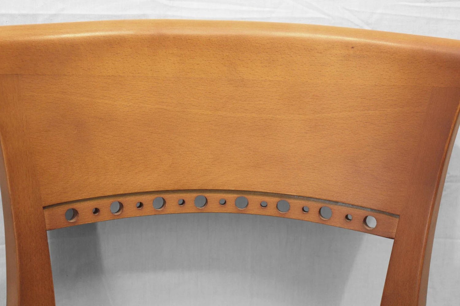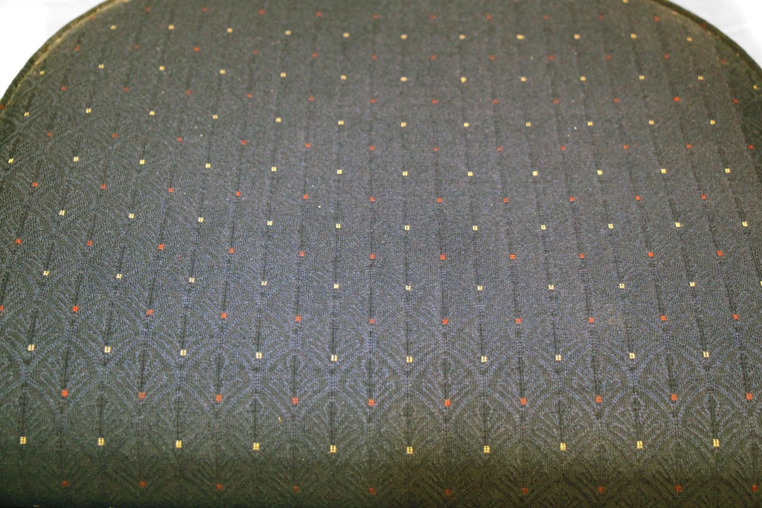 Vintage Traditional high back chairs with a blue fabric seat. The frame is solid maple with a detailed edge. The backrest has a unique circular cut-out detail. Priced each.