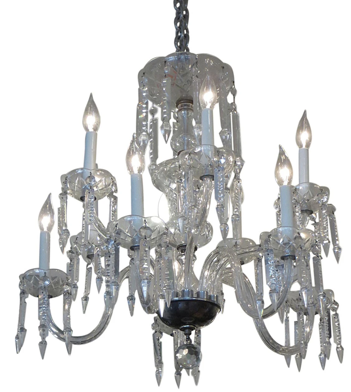 This crystal chandelier is elegant in style and has etched crystals throughout, with two tiers and six arms. The price includes restoration of cleaning and rewiring. Please specify the overall drop that is needed upon purchasing. The restoration will include up to 3 feet of chain. There will be a $10 per foot charge for each additional foot of chain.