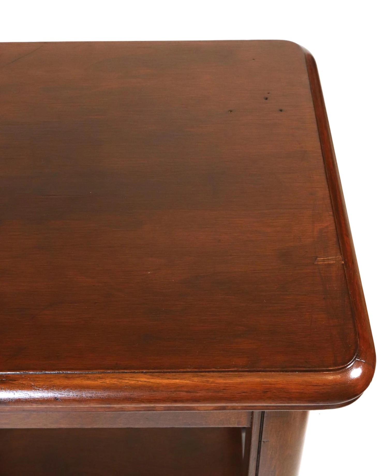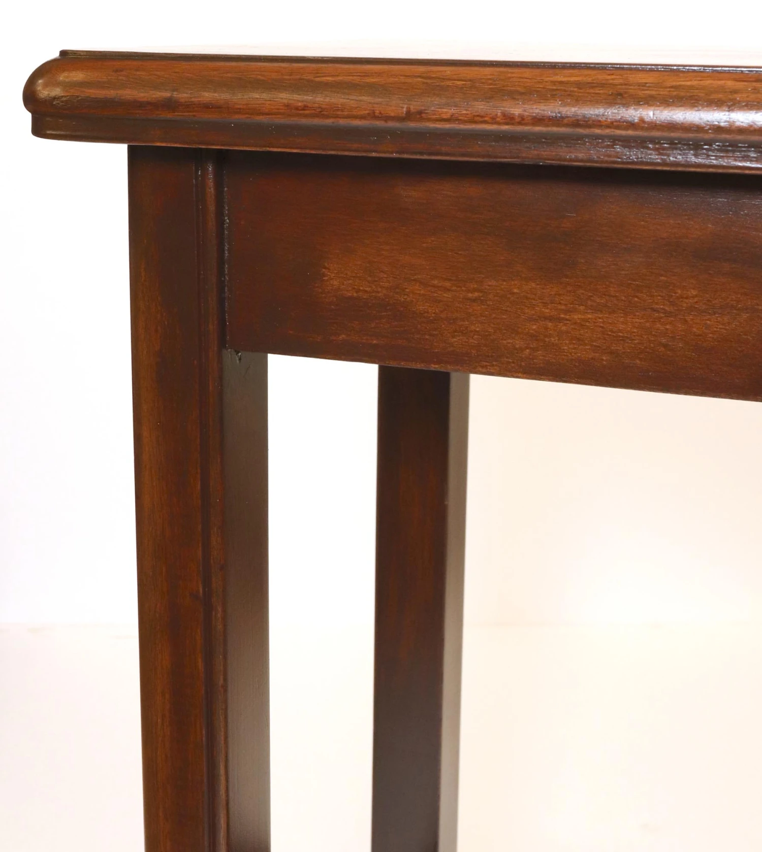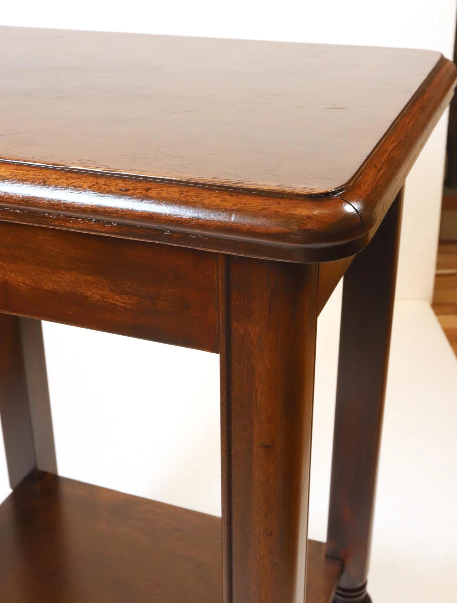 Traditional style end table made of dark stained wood and features a bottom shelf. Good condition with some scratches and discoloration on top. One available.