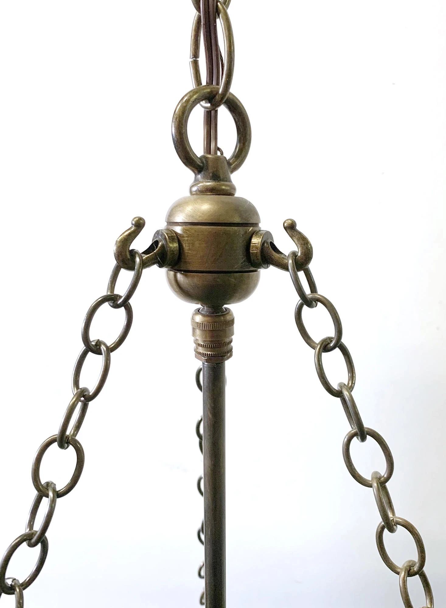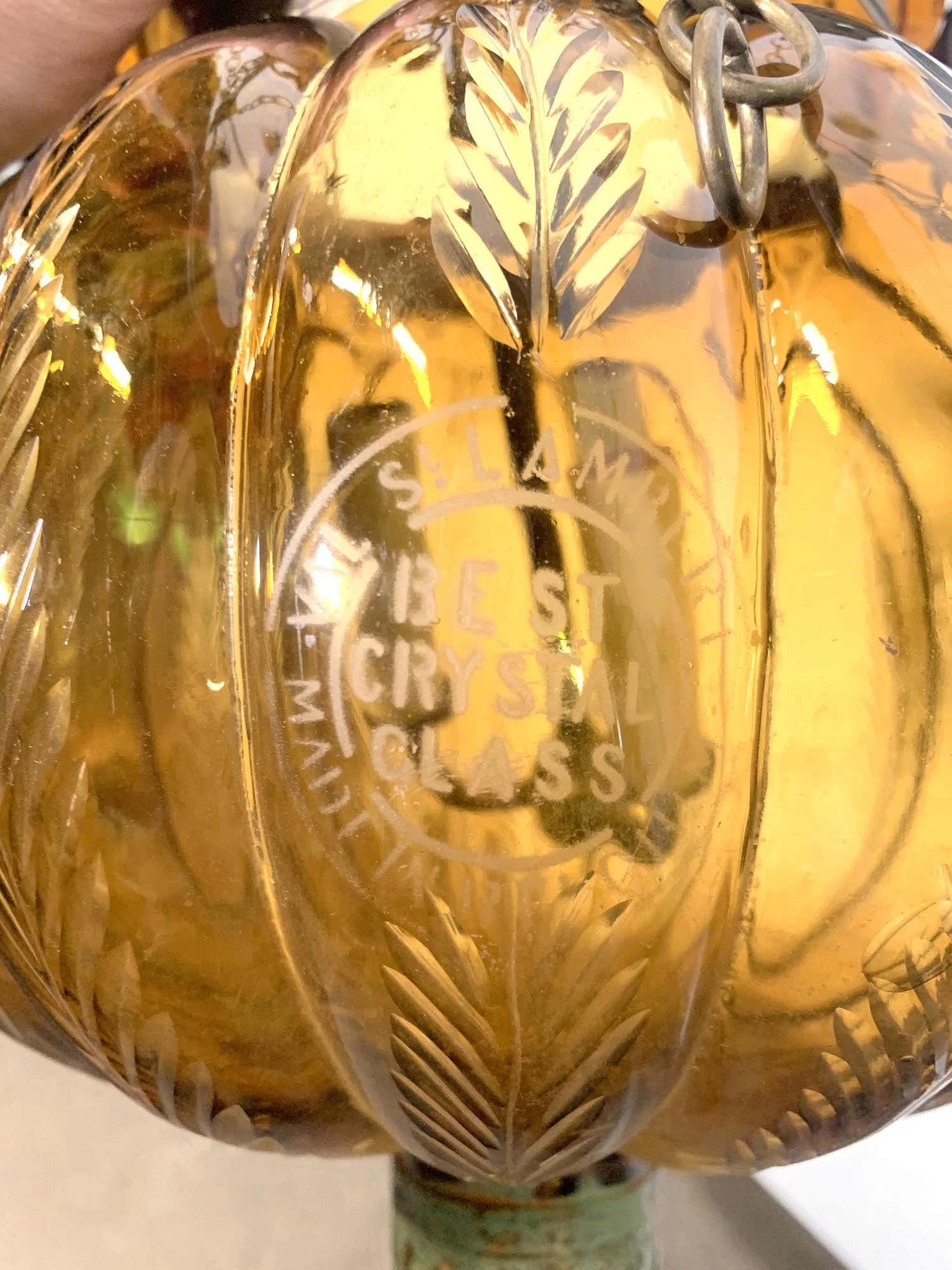 Antique original signed hand blown crystal pumpkin shaped bell jar pendant light with an amber hue. Made in Belgium by Val Saint Lambert. Stamped “Best Crystal Glass”. Price includes the chain, canopy, cleaning, and wiring. Please specify the overall drop that is needed upon purchasing. The restoration will include up to 3 feet of chain. There will be a $10 per foot charge for each additional foot of chain.
