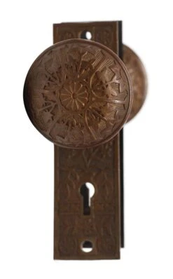 This Vernacular style six fold bronze door knob set was made by Sargent in the 1888 catalog. It is part of the J-20900 group. Priced as two door knobs, two back plates, and a spindle. Good condition with appropriate wear from age. One available.