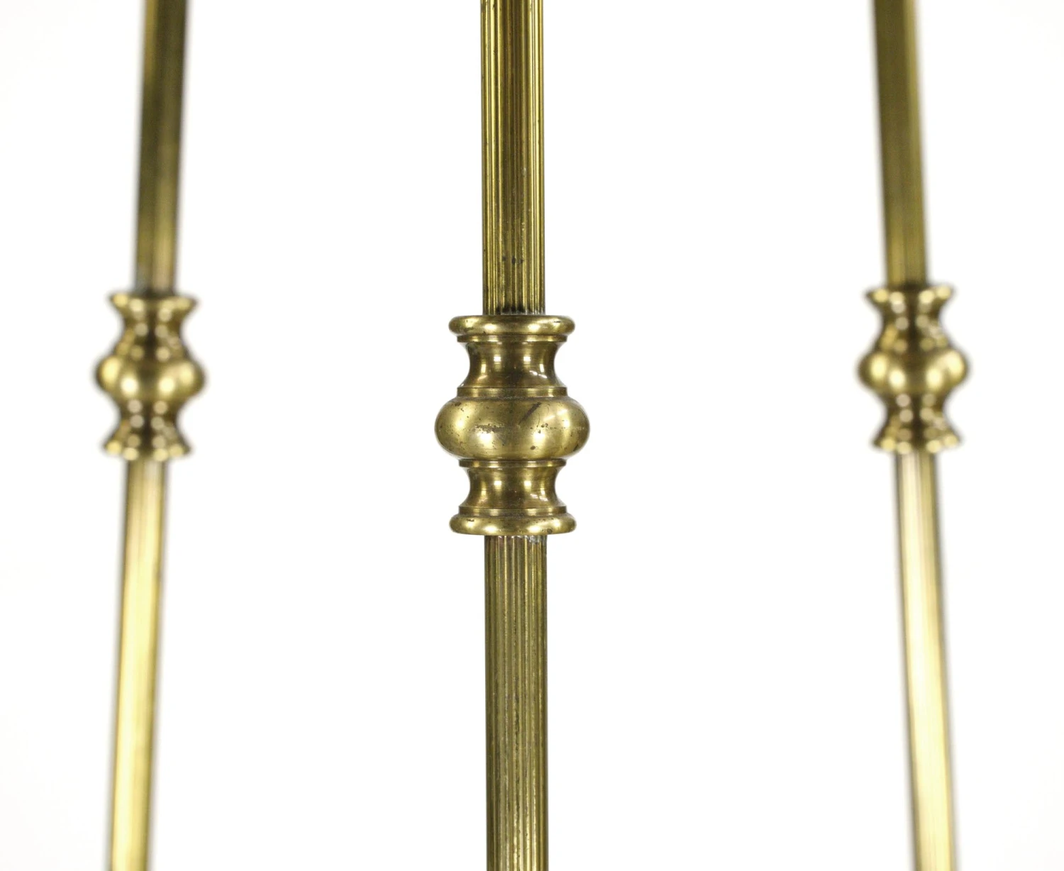 Victorian style chandelier with a brass patina frame and six arms featuring black shades positioned on three candle sticks. Good condition with minor surface wear on the brass. This light requires 18 candelabra light bulbs. This light is wired and ready to ship. One available.