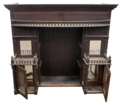 Carved wood over mantel with back beveled mirrors and glass front cabinets on both sides. This piece is in restorable condition.