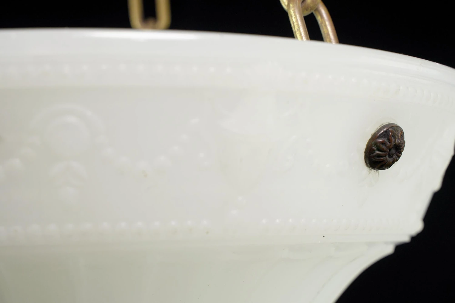 Victorian Ornate Milk Glass Dish Polished Brass Chain Pendant Light