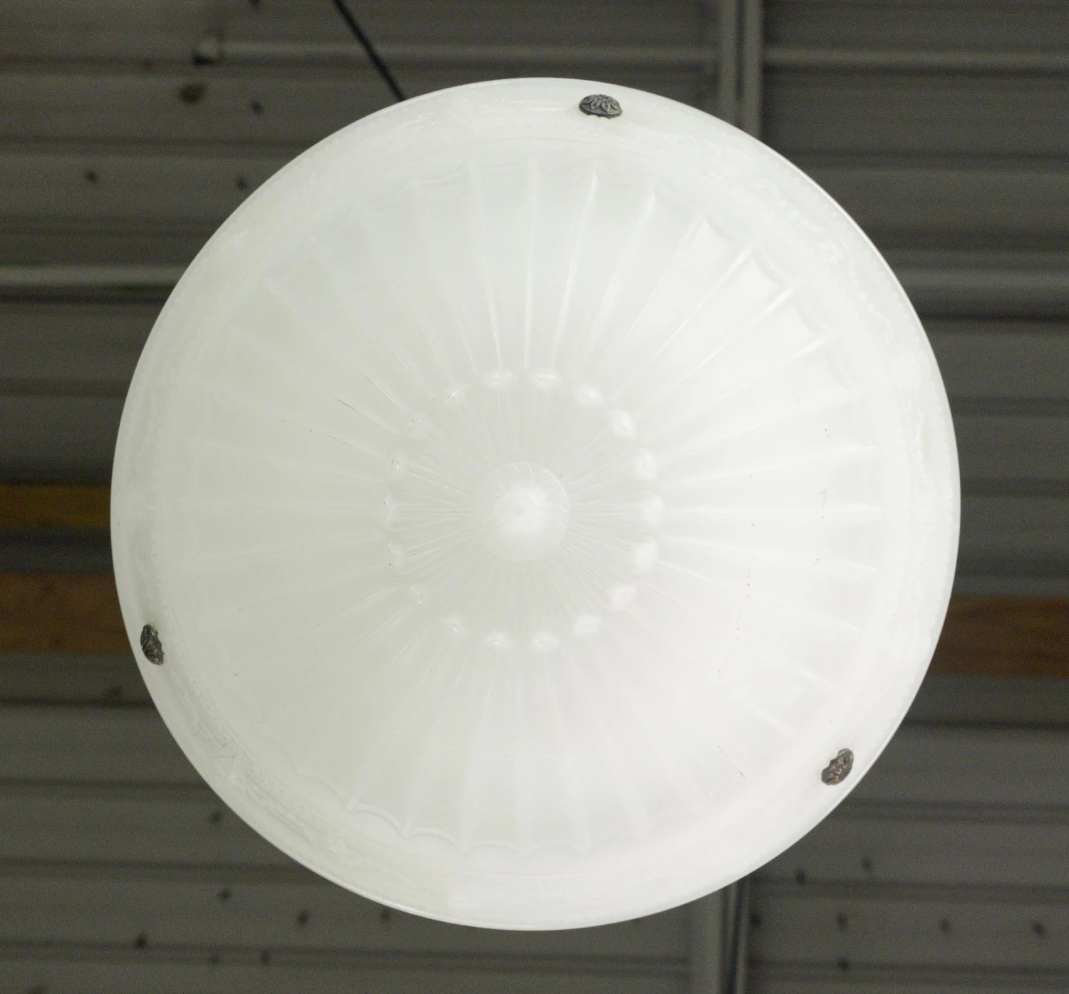 This Victorian pendant light is an exquisite vintage fixture featuring a milk glass dish with intricate ornate designs suspended from a polished brass chain, providing a captivating blend of elegance and nostalgia to any space. This is in good condition. The price includes restoration of cleaning and rewiring.