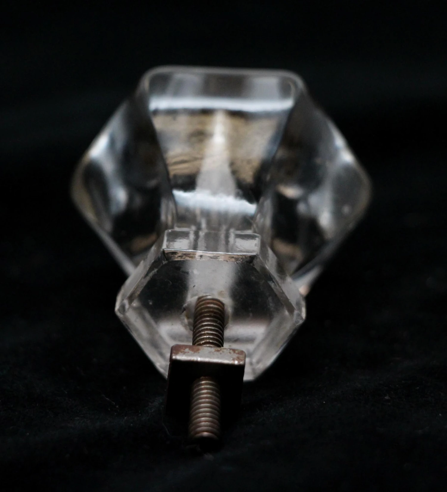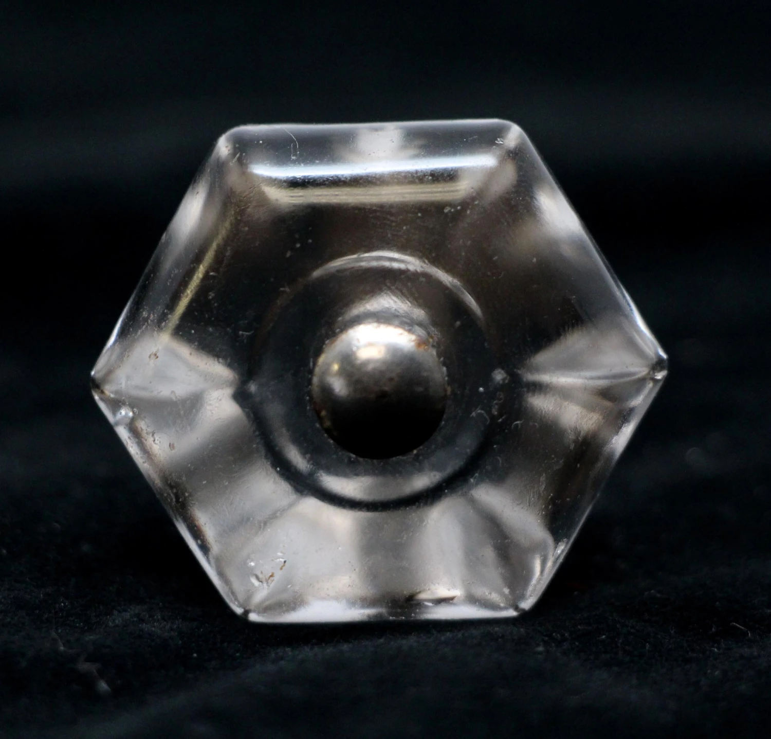 Clear glass cabinet or drawer knobs with a hexagon shape. Priced each.