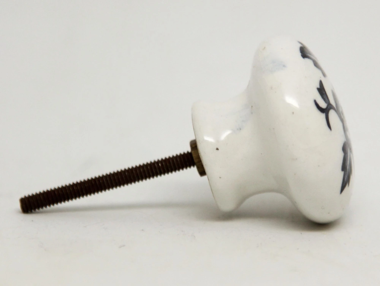 Vintage ceramic white cabinet knob with dark blue floral details. Screws included. Good condition with appropriate wear from age. Priced each.