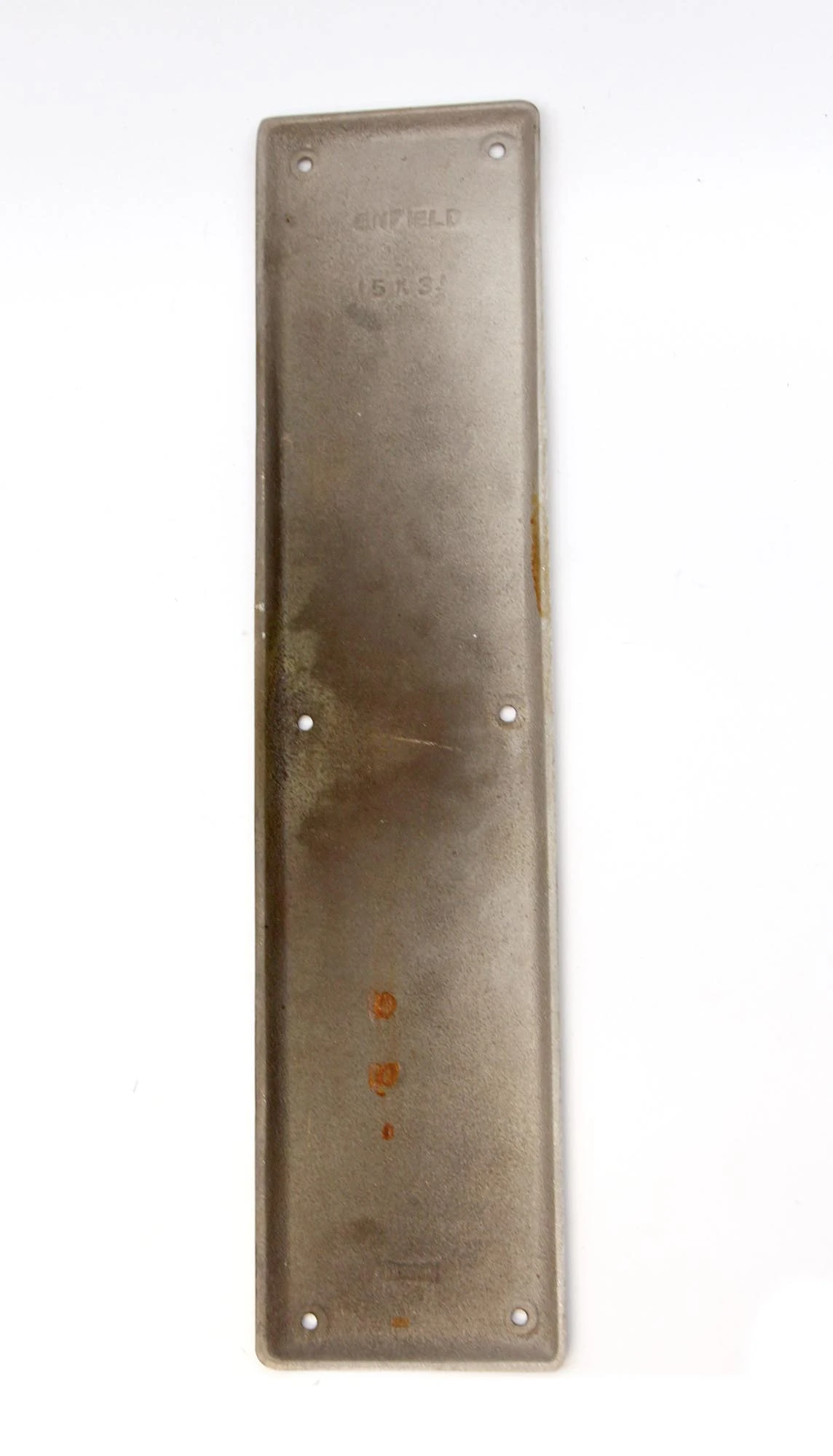 Classic steel push plate inscribed Russwin Enfield on back. Shows some patina and signs of age. One available.