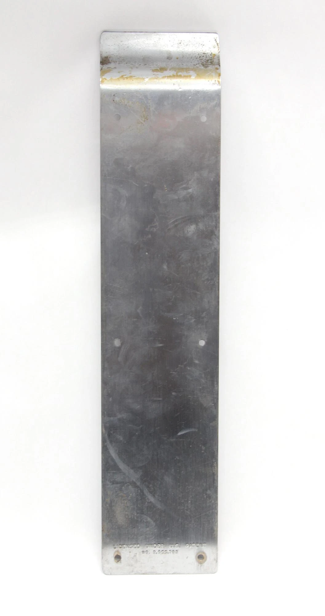 Nickel plated brass push plate with a top curve. Inscribed patent number 2,555,783. Priced each.