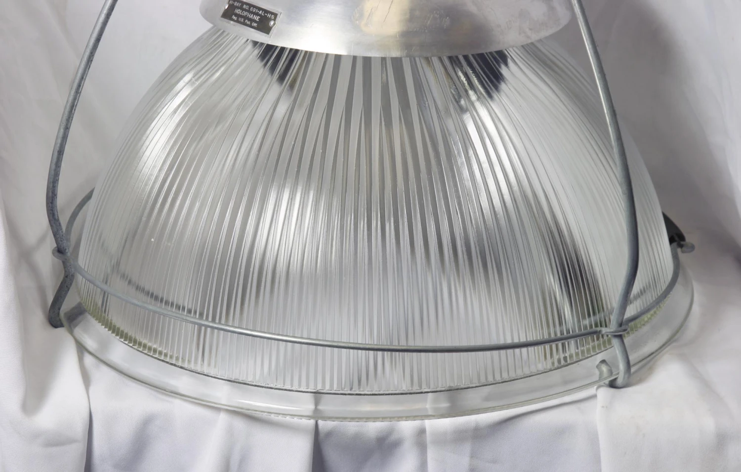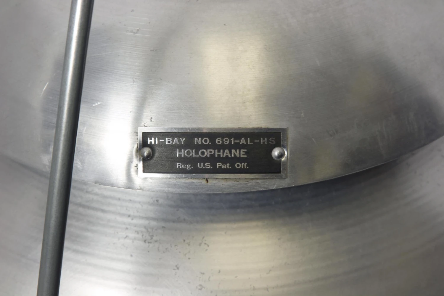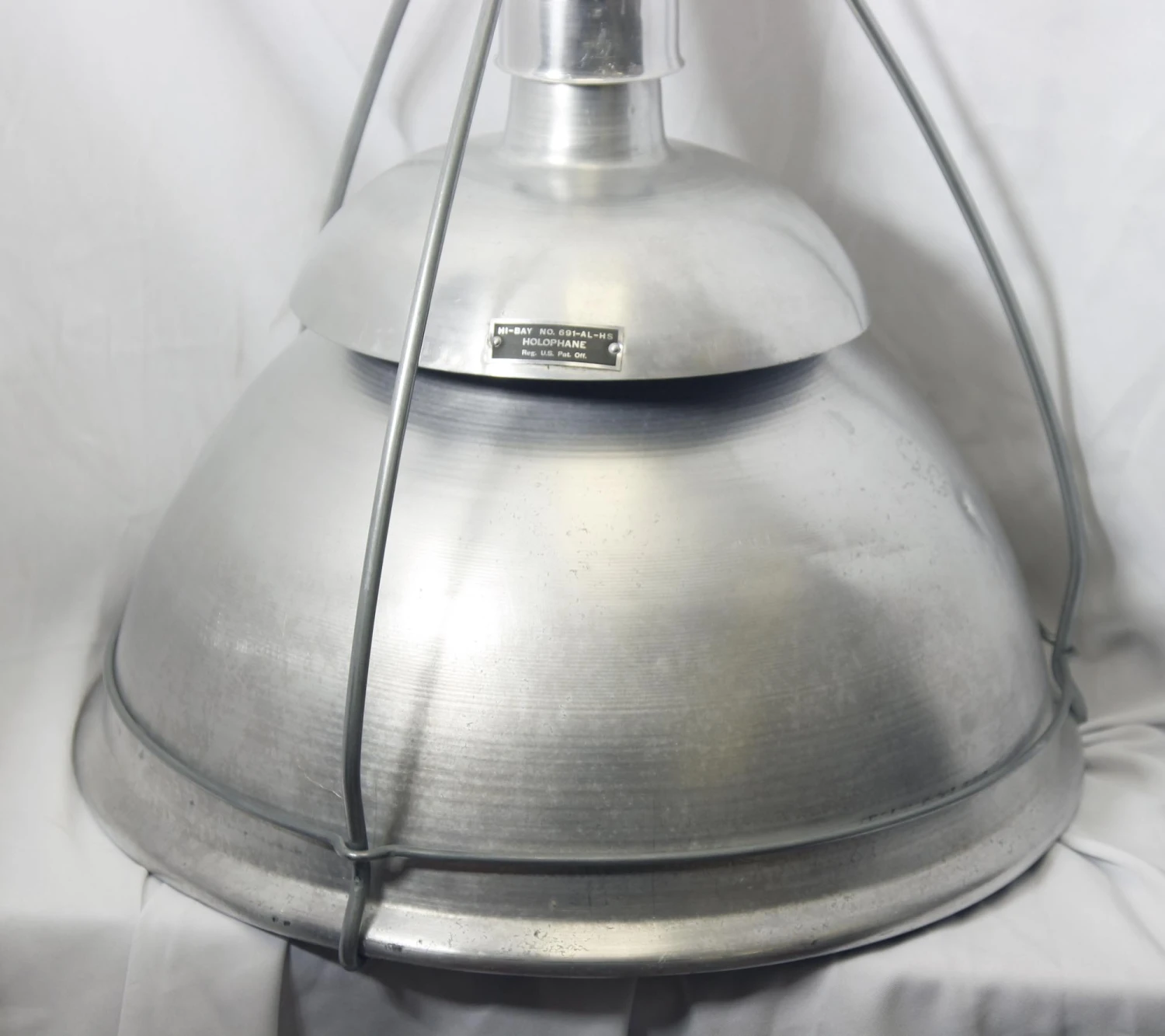 Vintage holophane industrial High Bay lights with metal skin. It can be purchased with or without skin. The metal shade can only be permanently removed. Priced each.