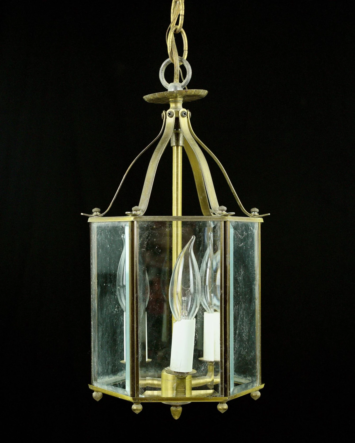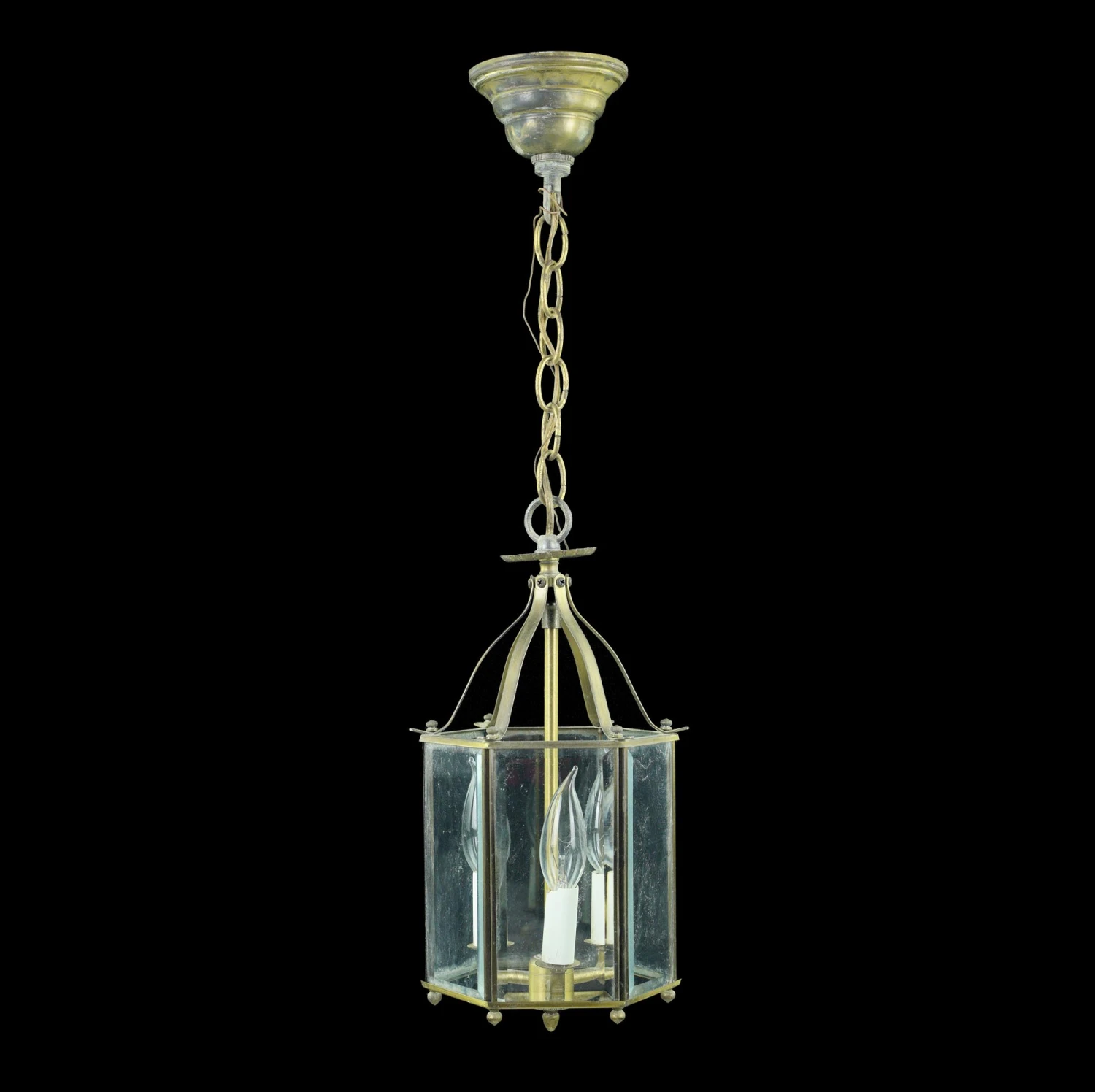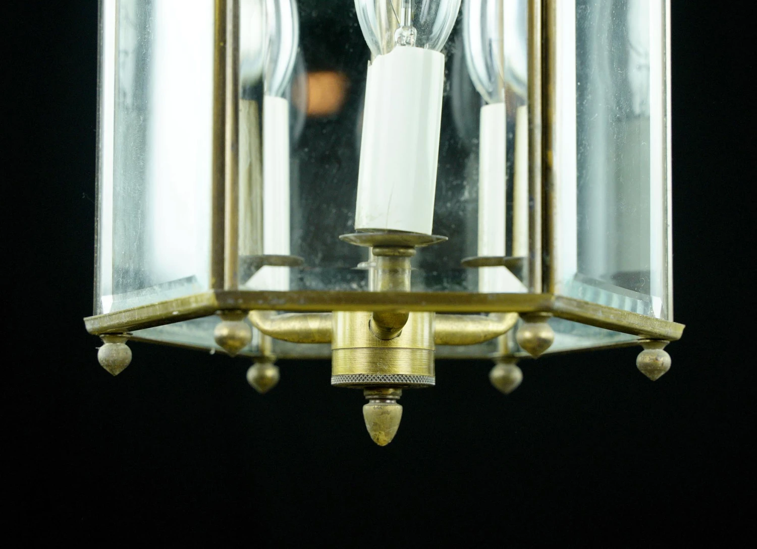This vintage pendant light hanging lantern offers timeless allure. With brass frame accents and clear glass panels, it forms a classic lantern design. This pendant light blends vintage charm with elegant materials, creating a captivating lighting fixture that illuminates spaces with a warm and inviting ambiance. This light requires three candelabra light bulbs. This is in good condition. The price includes restoration of cleaning and rewiring.