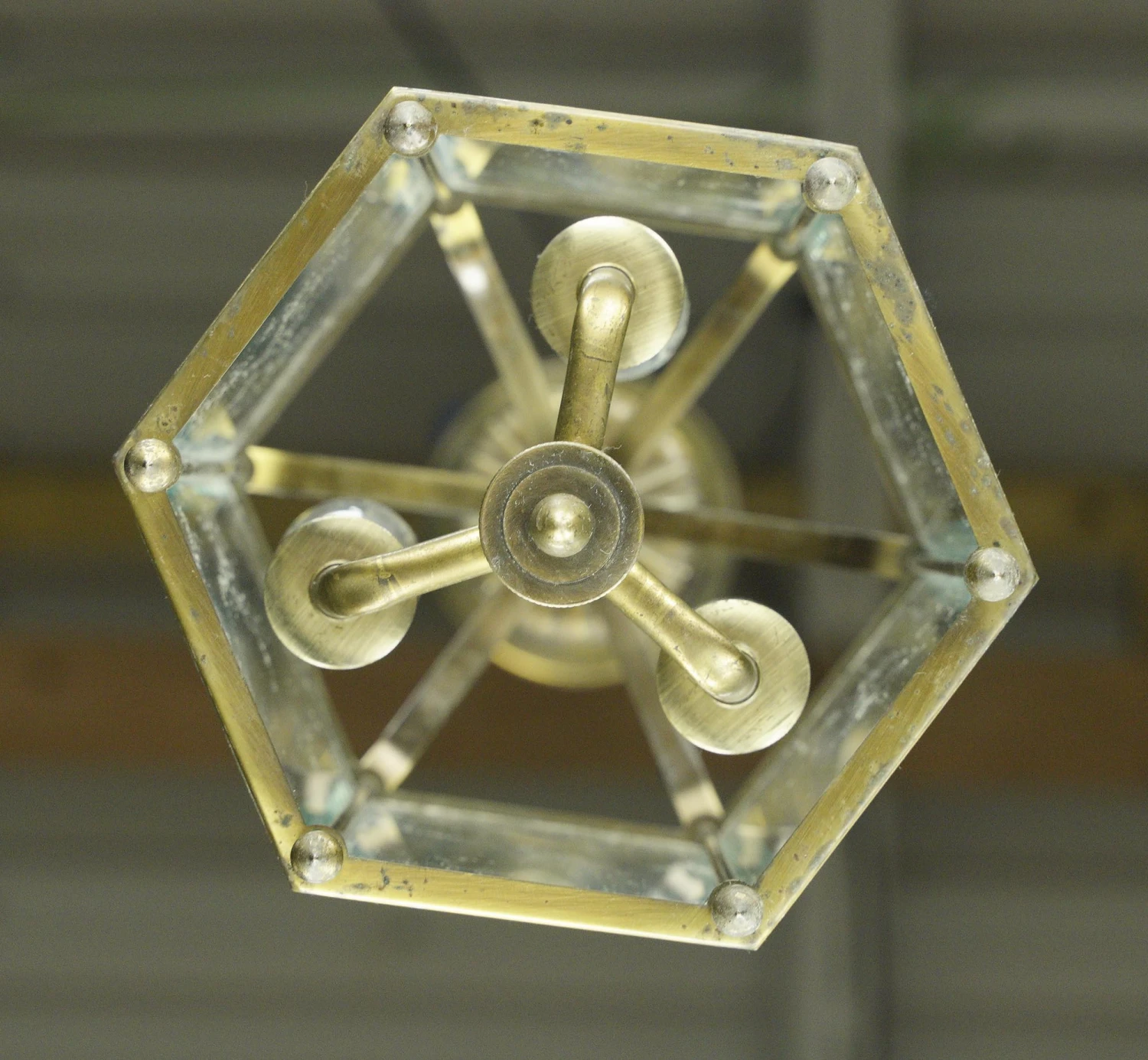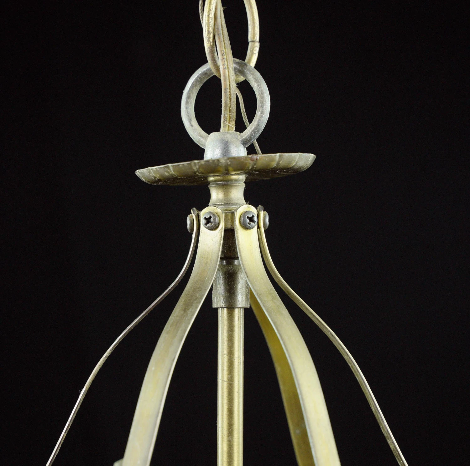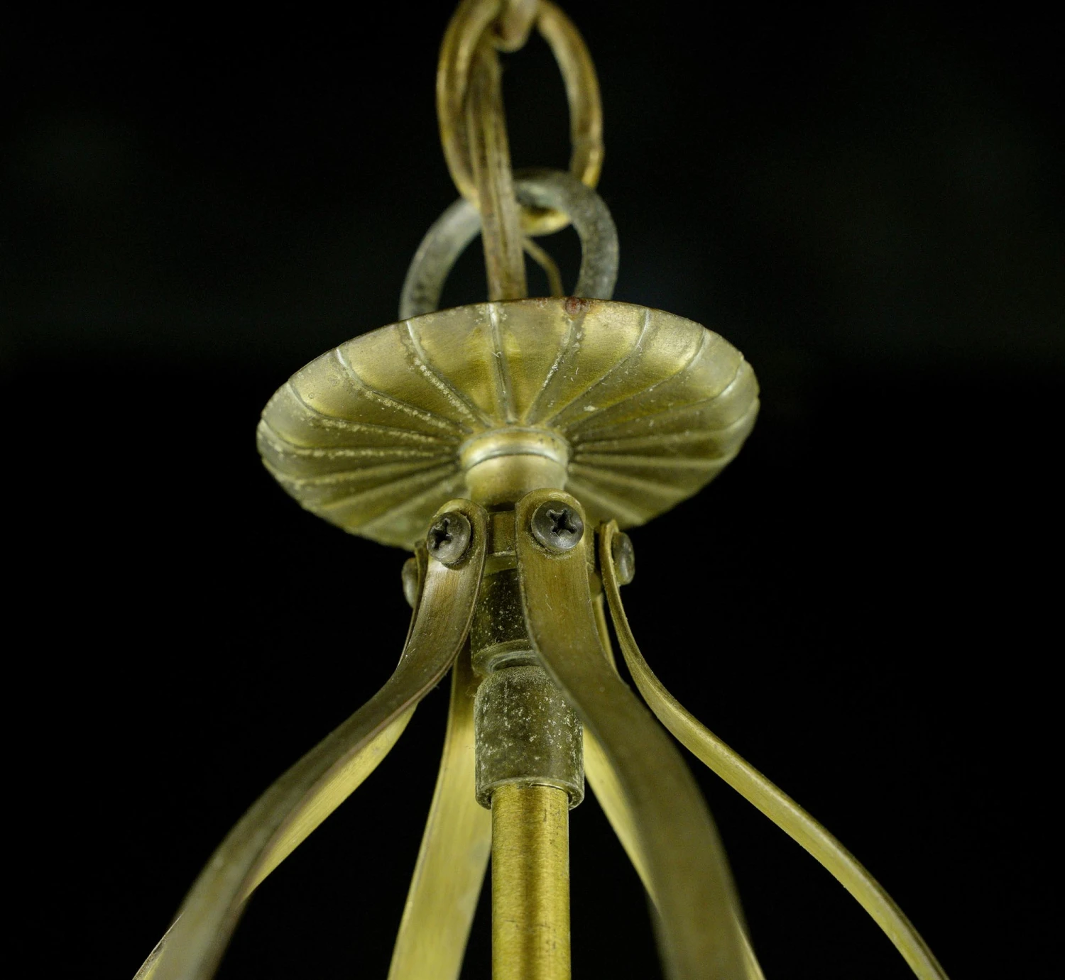This vintage pendant light hanging lantern offers timeless allure. With brass frame accents and clear glass panels, it forms a classic lantern design. This pendant light blends vintage charm with elegant materials, creating a captivating lighting fixture that illuminates spaces with a warm and inviting ambiance. This light requires three candelabra light bulbs. This is in good condition. The price includes restoration of cleaning and rewiring.