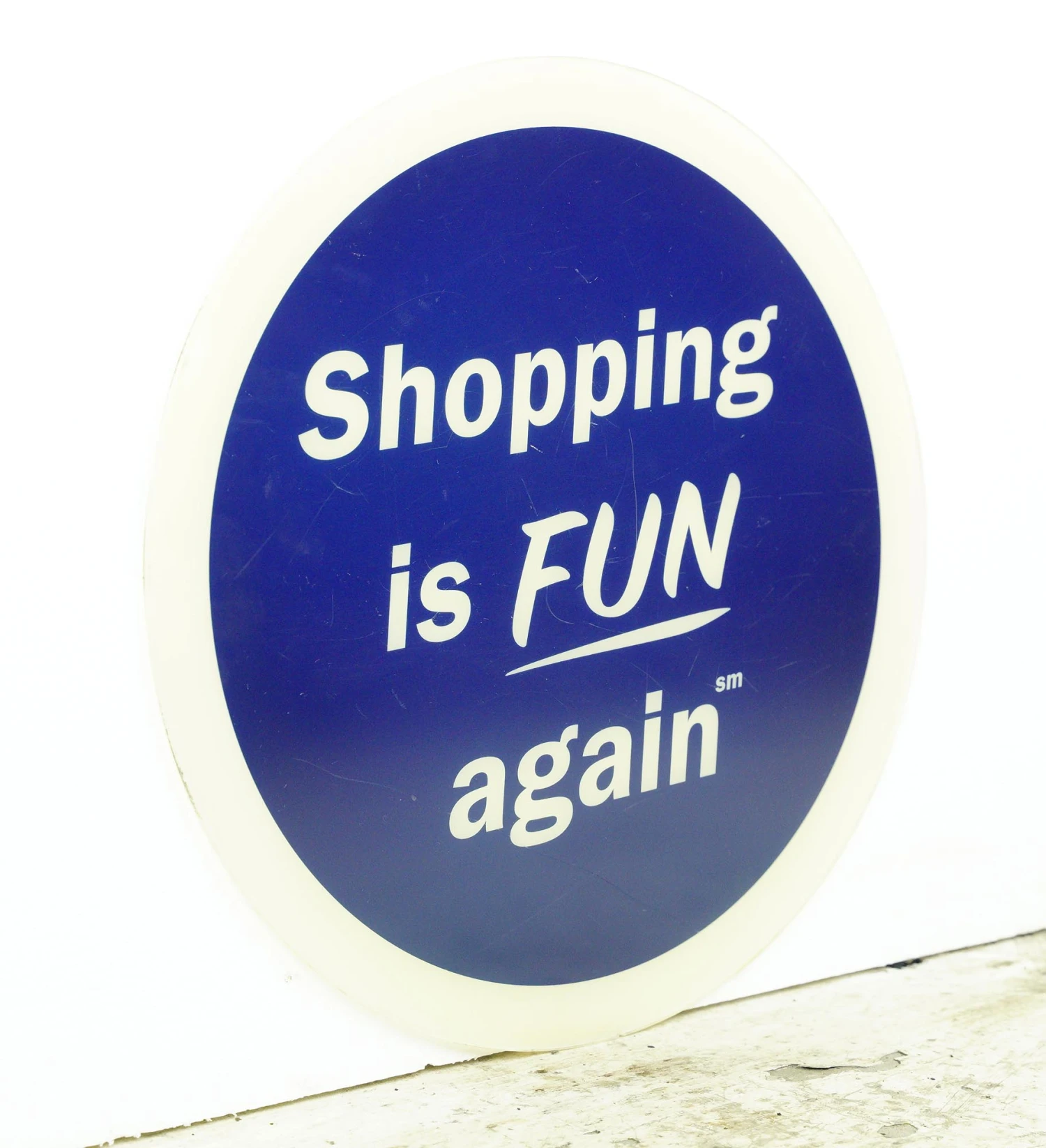 This vintage round acrylic wall sign is 15 in. in diameter. The sign humorously declares “Shopping is Fun Again” in blue and white colors, offering a nostalgic touch and playful decor for retail enthusiasts. This is in good condition with minor surface wear.