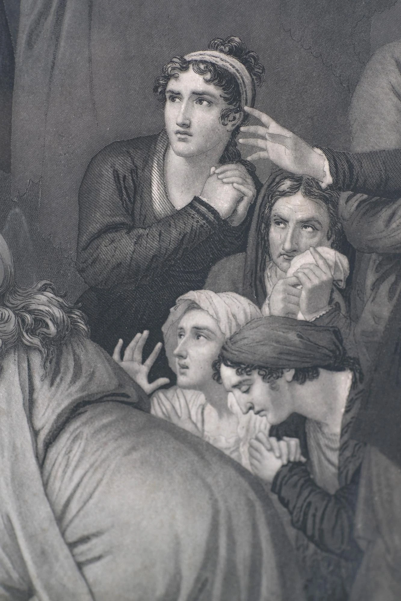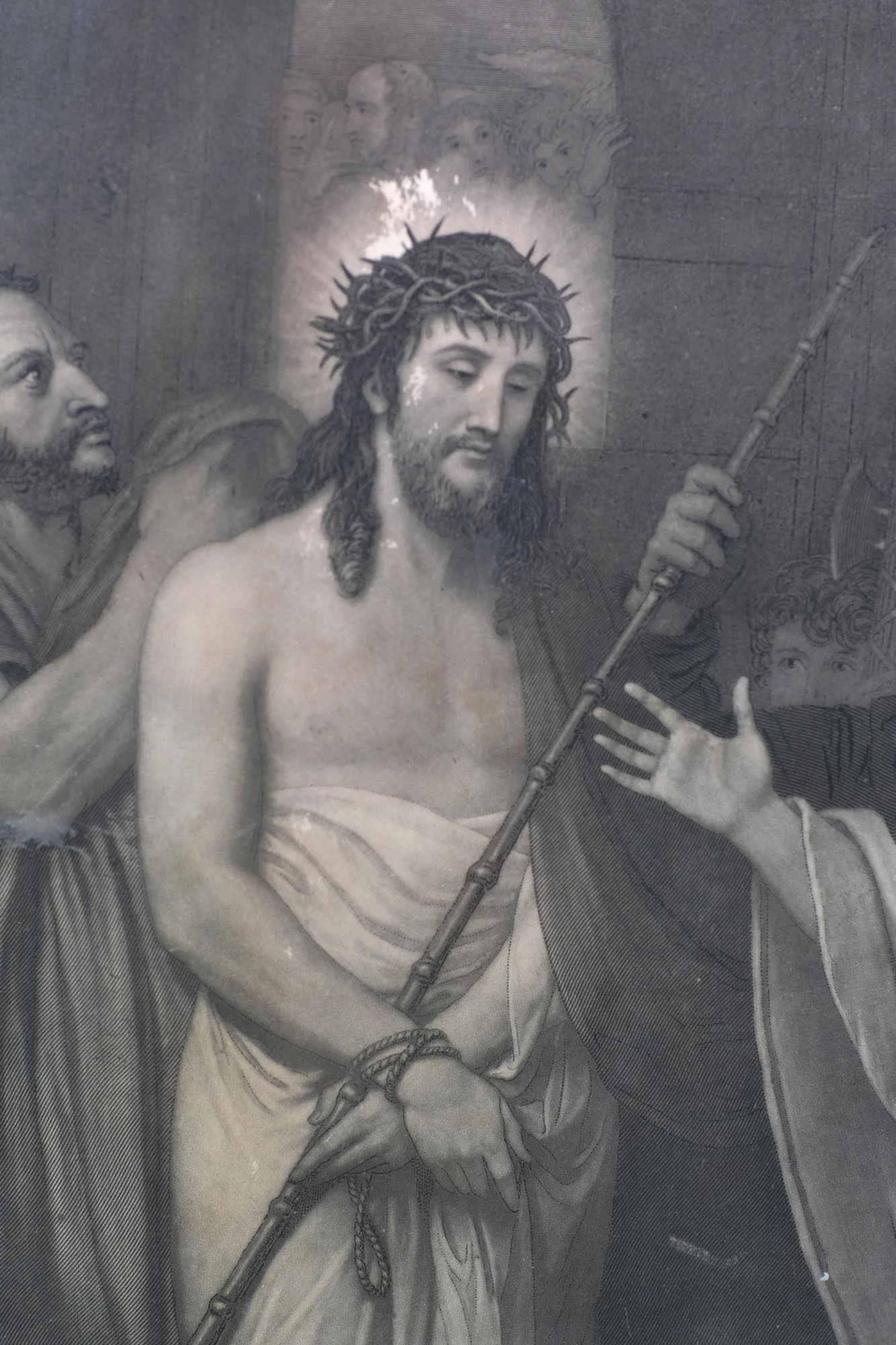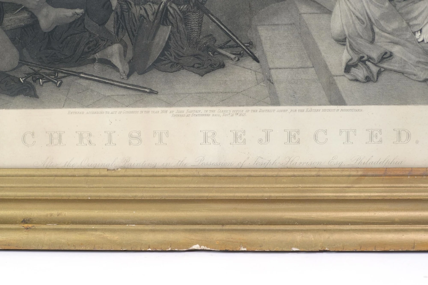 This reproduction is based on the painting of Christ Rejected with fascinating detailed expressions. It is framed in gold plaster on wood. The glass is intact. There is a mounting wire attached to the back.