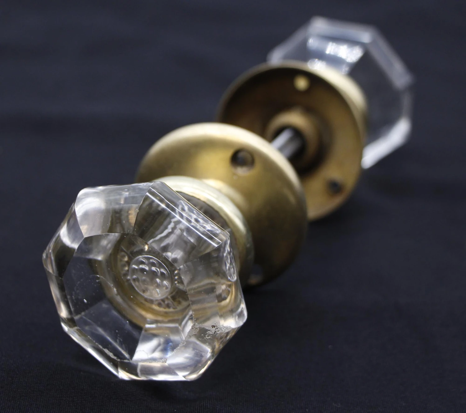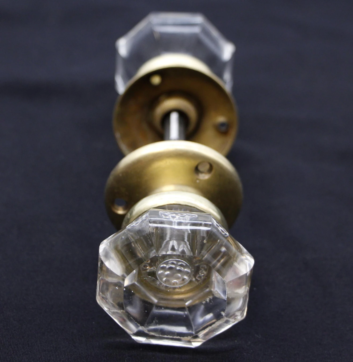 These octagon glass door knobs are concave in the center. The mercury center is a unique cross design. This set includes two cast brass rosettes. Good condition with appropriate wear from age. Priced as two door knobs, two rosettes, and a spindle. One available.