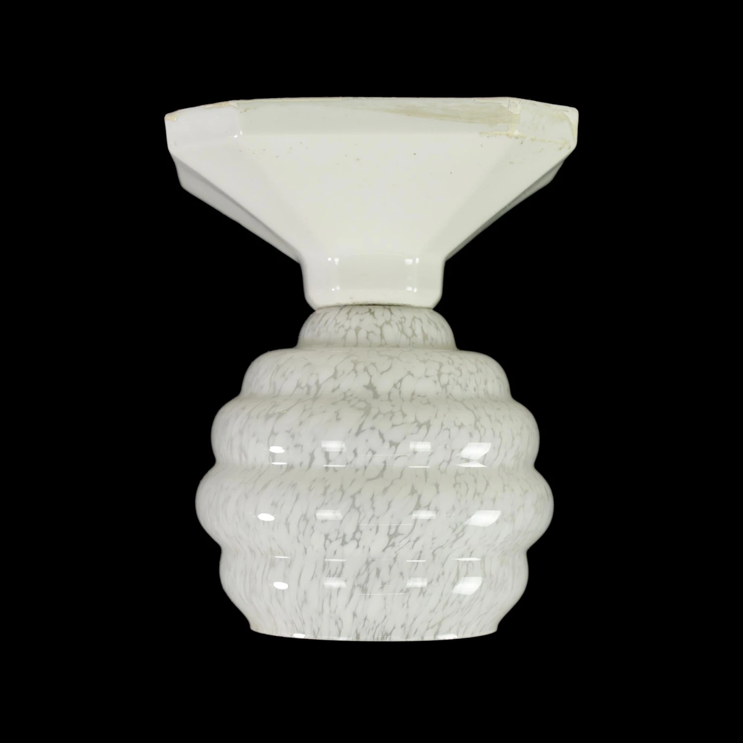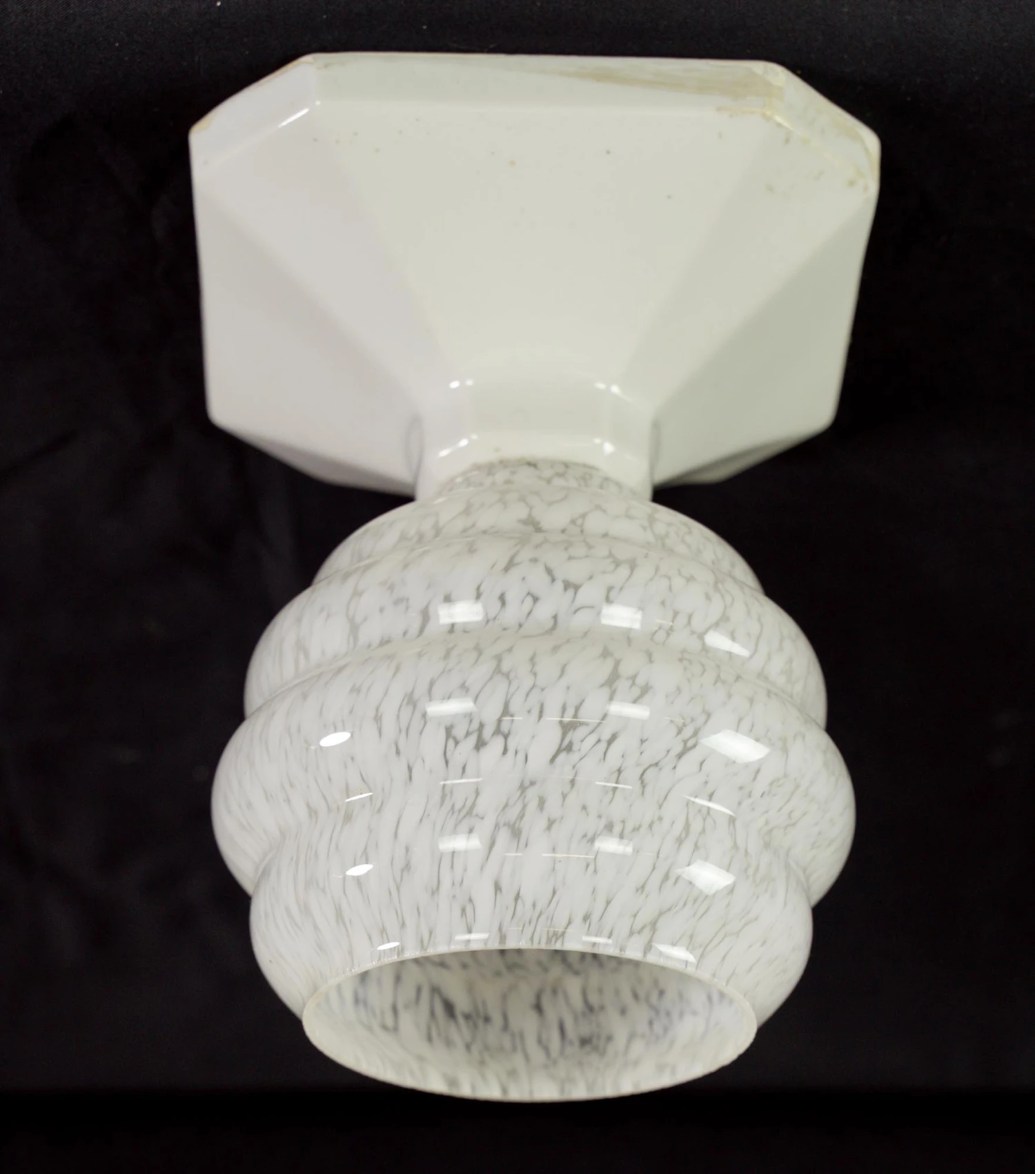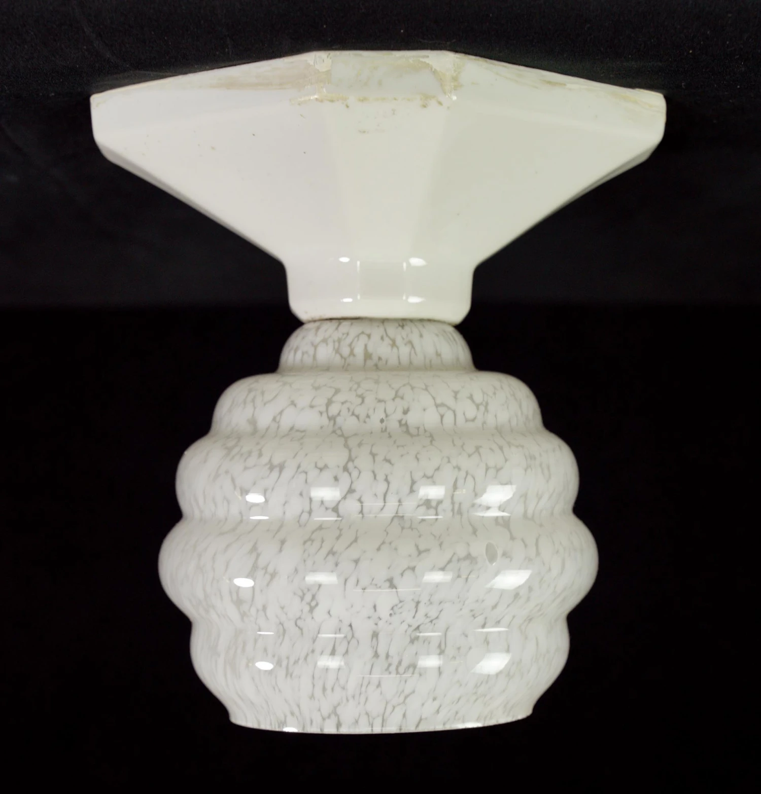 White and clear marbleized alabaster globe flush mount fixture with a white square ceramic fitter. This requires one standard medium base bulb. The price includes restoration of cleaning and rewiring. Good condition with appropriate wear from age. One available.