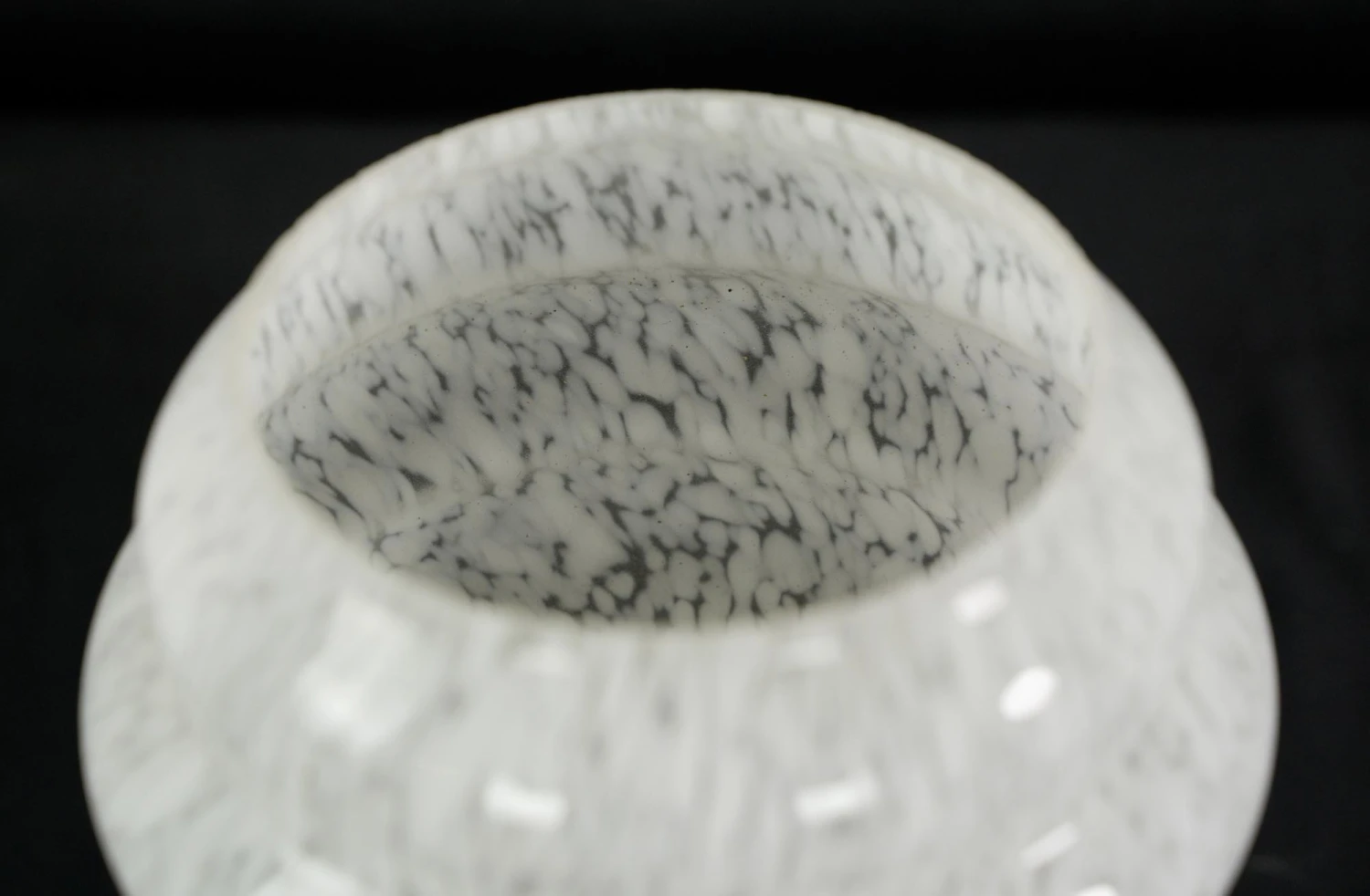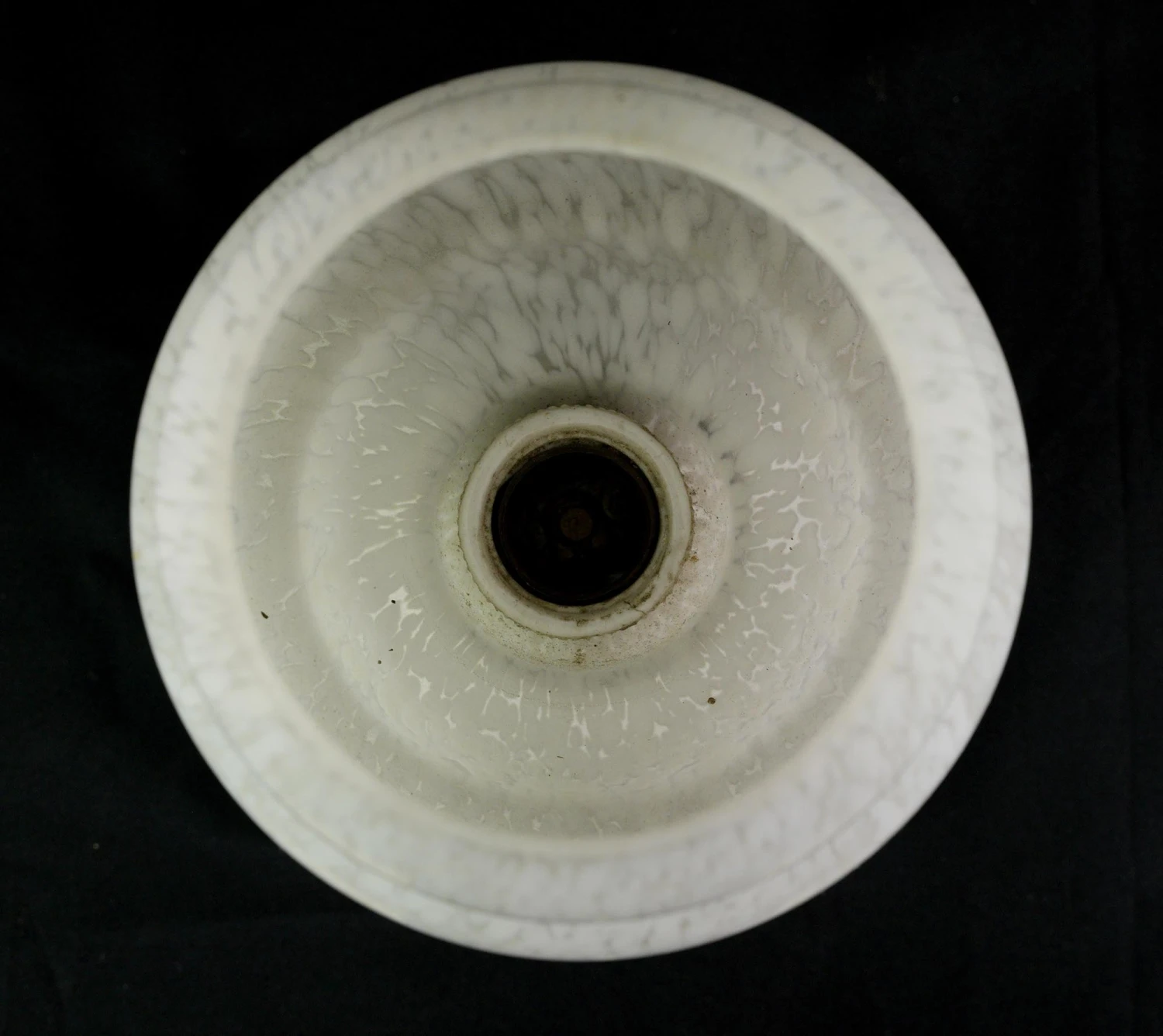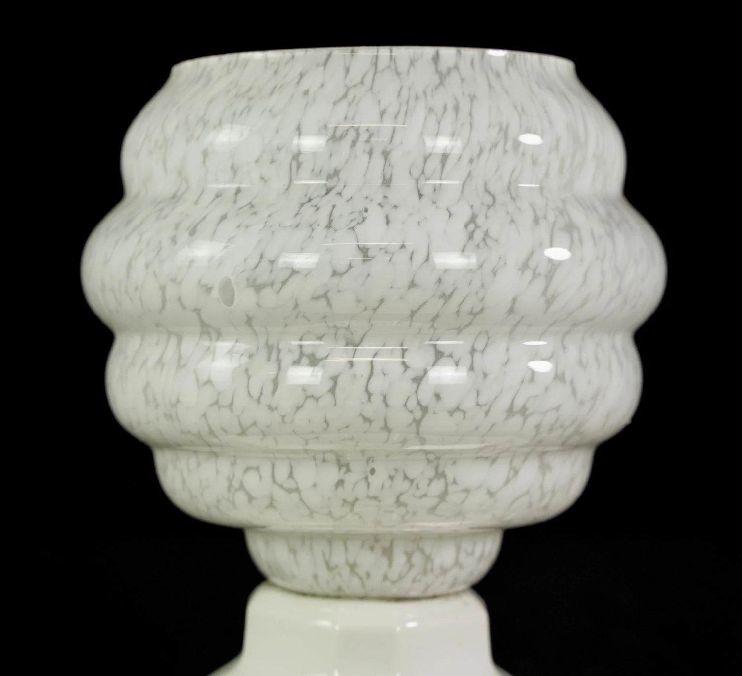 White and clear marbleized alabaster globe flush mount fixture with a white square ceramic fitter. This requires one standard medium base bulb. The price includes restoration of cleaning and rewiring. Good condition with appropriate wear from age. One available.