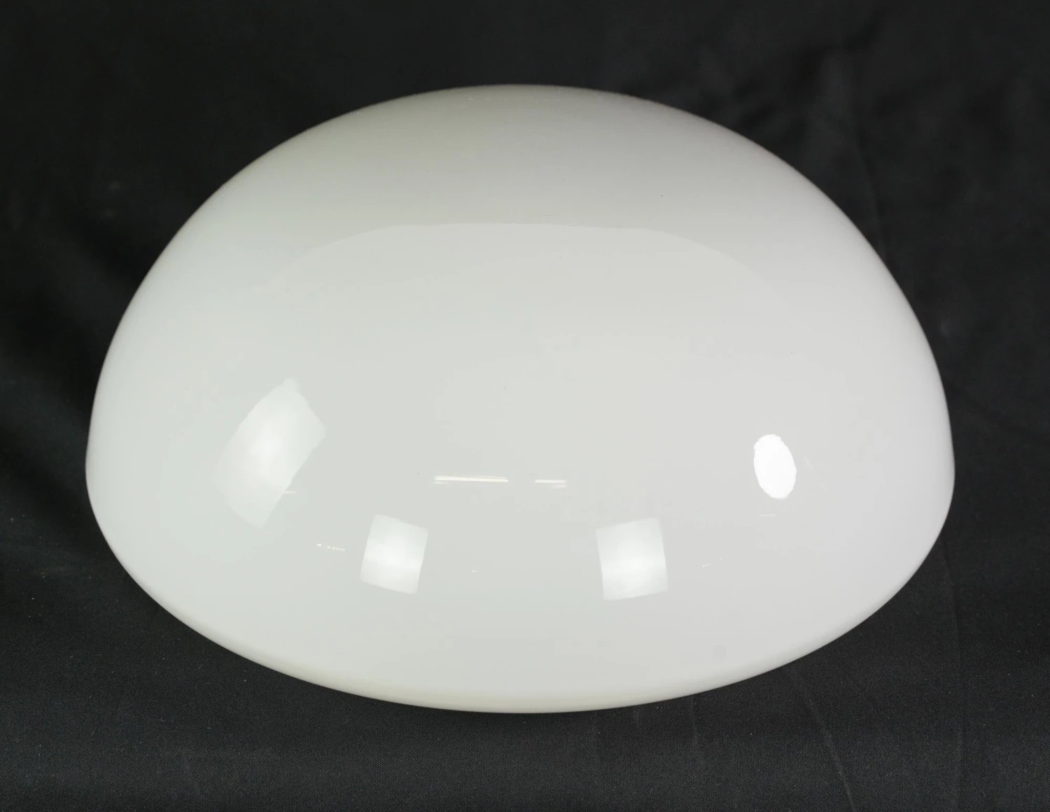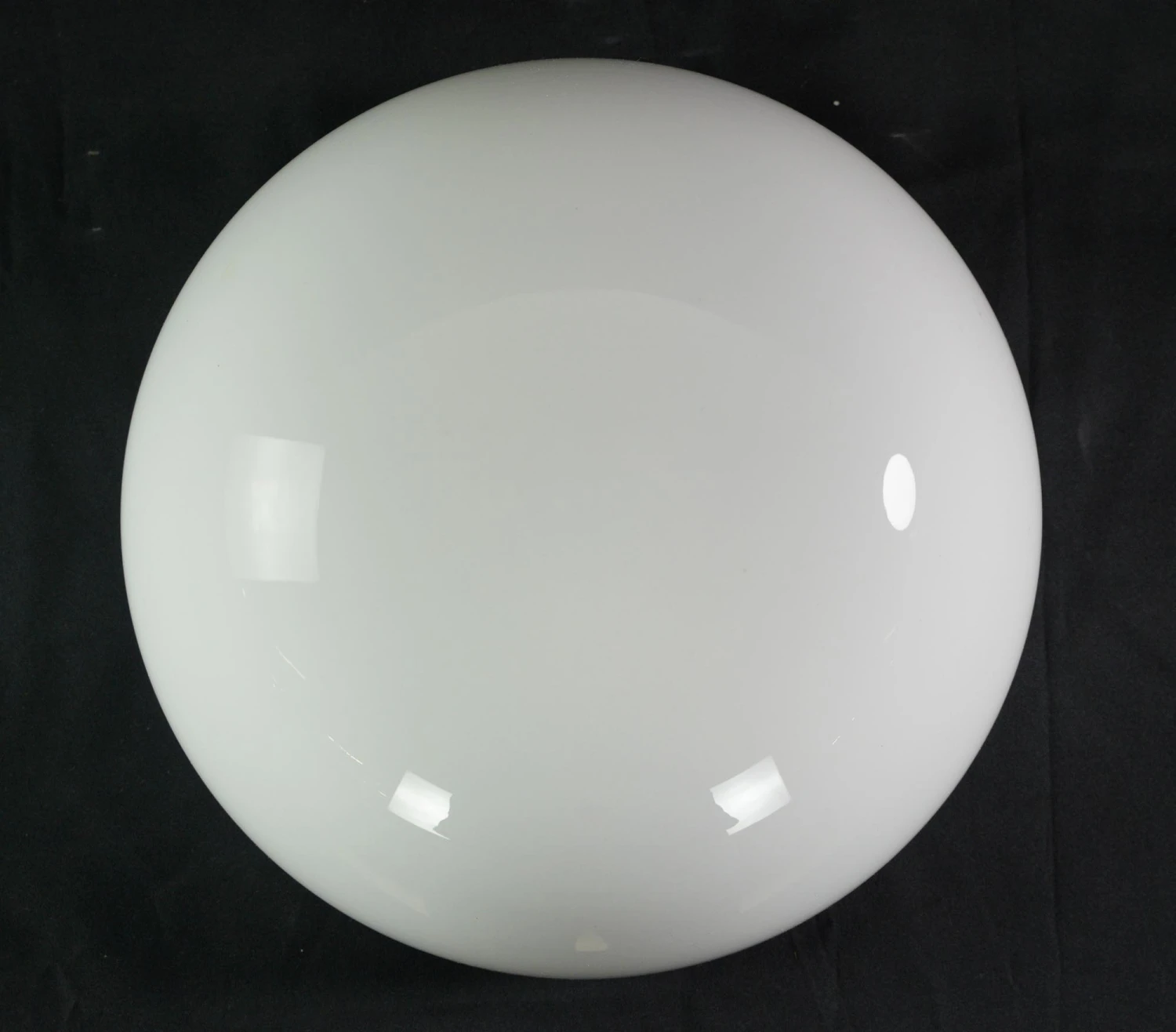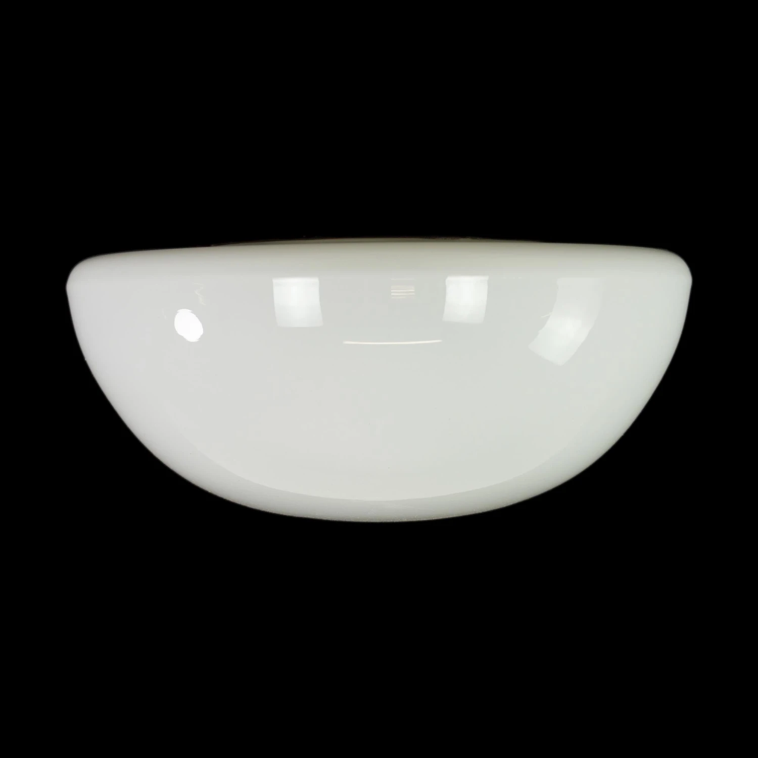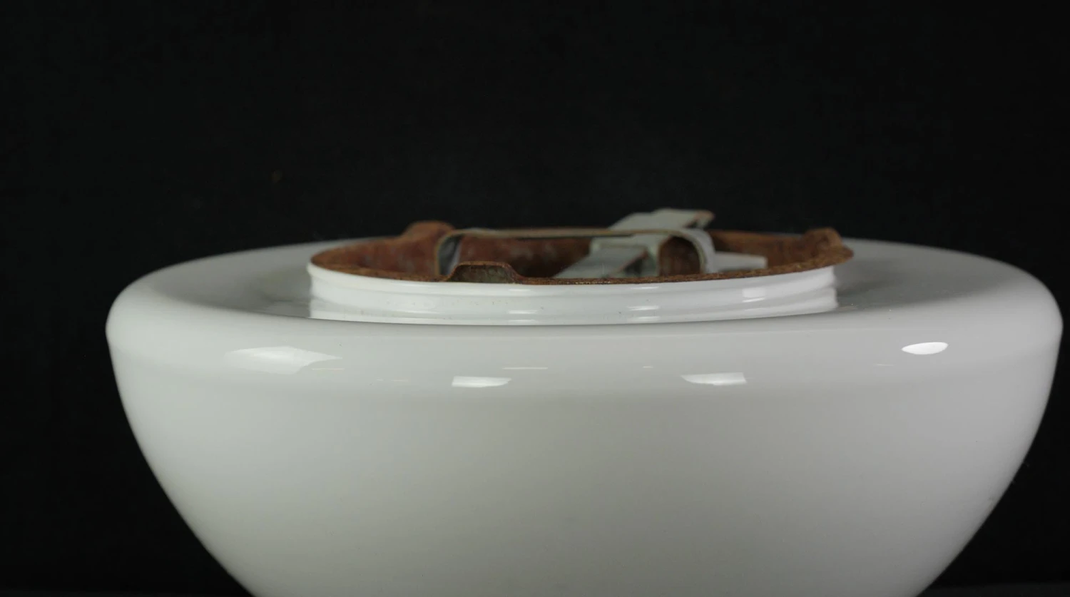 Round white glass flush mount light fixture. This requires one standard medium base bulb. The price includes restoration of cleaning and rewiring. Good condition with appropriate wear from age. Priced each.