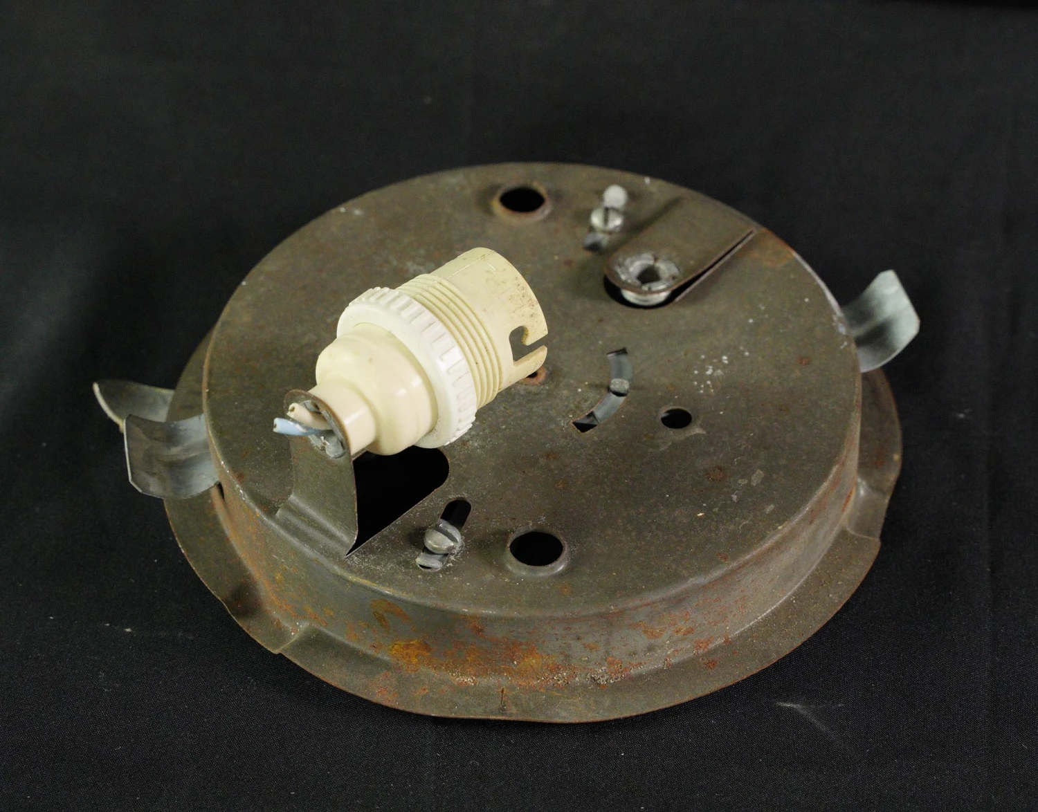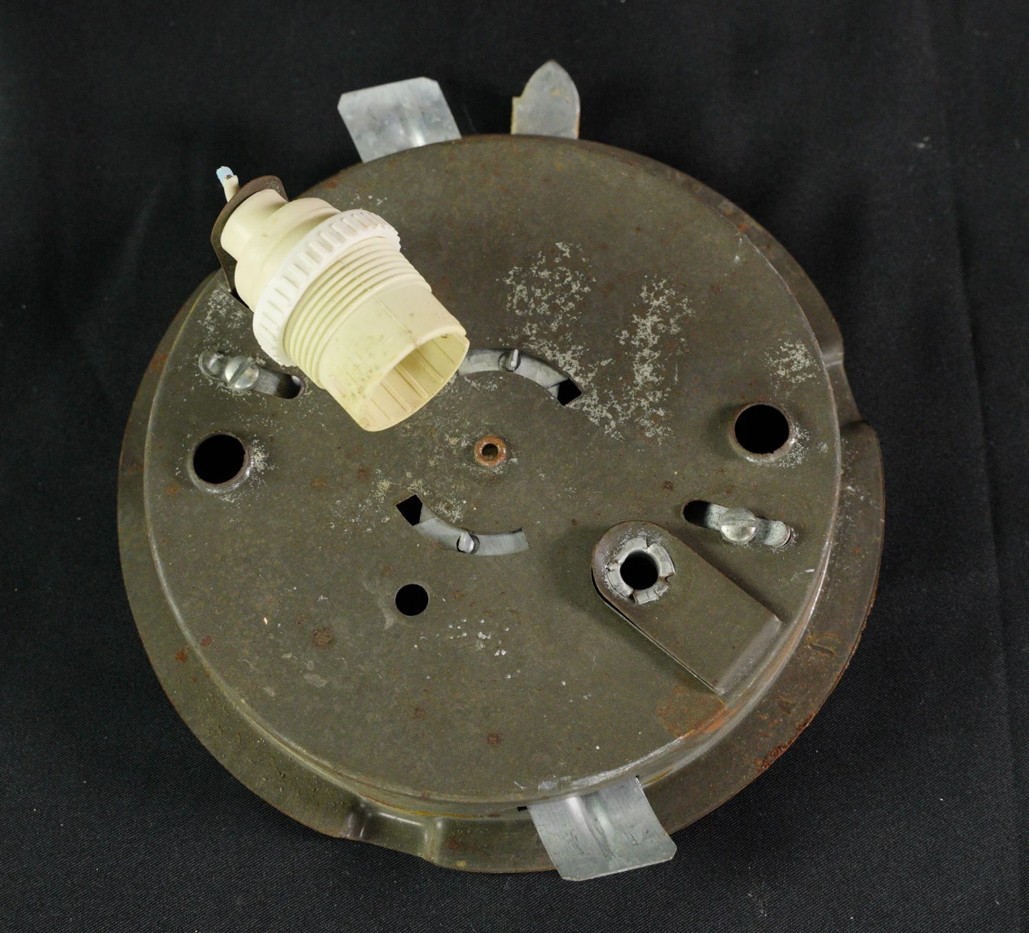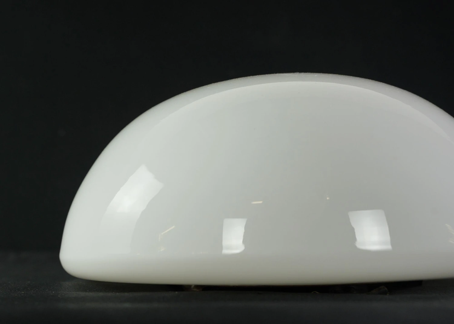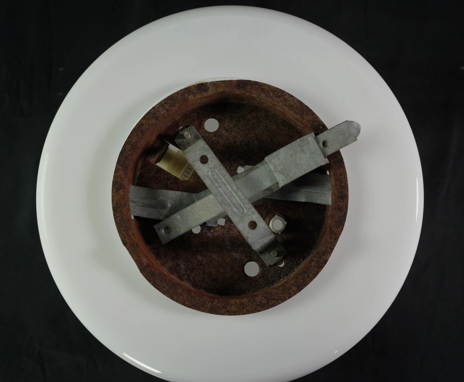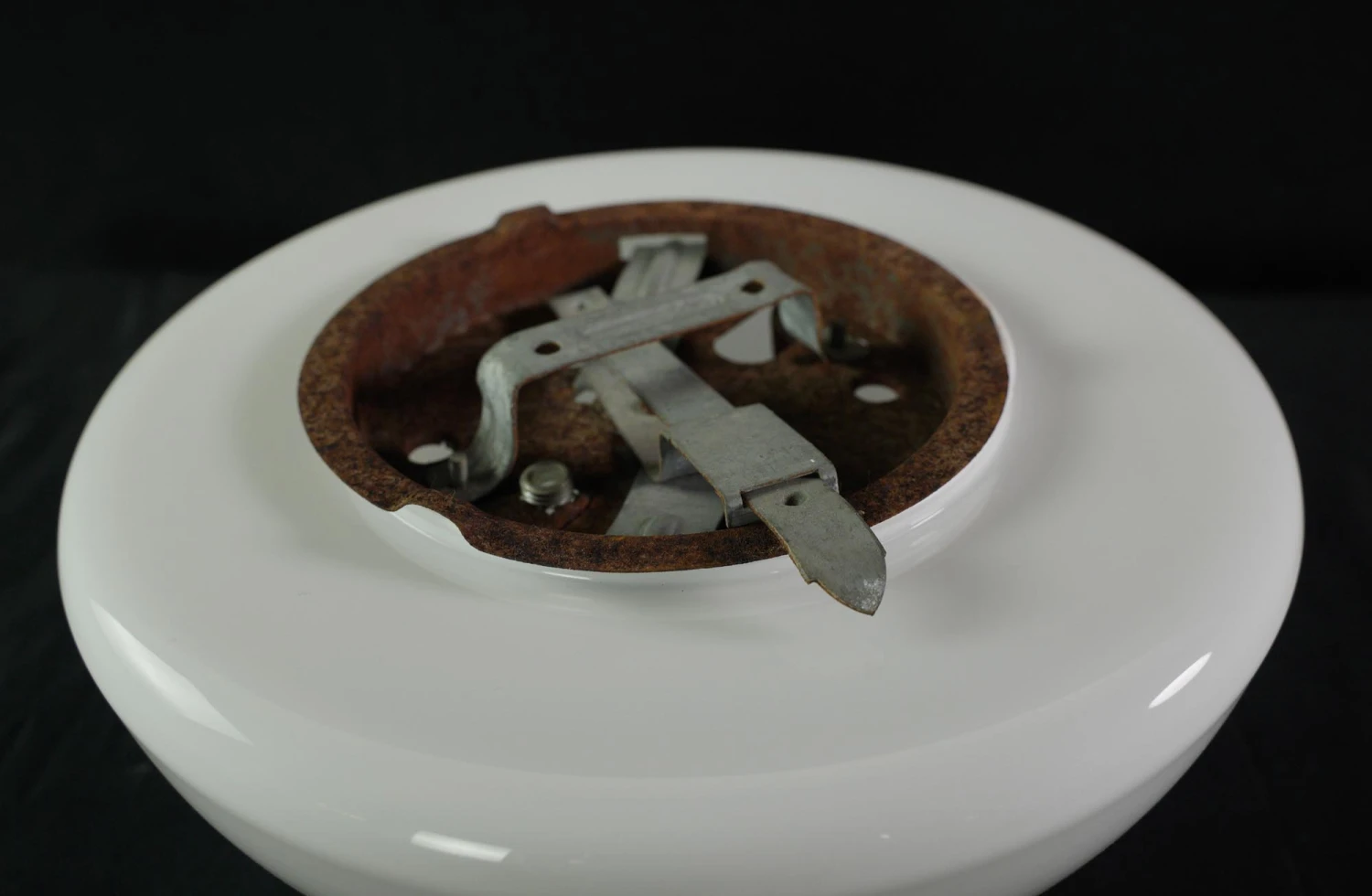 Round white glass flush mount light fixture. This requires one standard medium base bulb. The price includes restoration of cleaning and rewiring. Good condition with appropriate wear from age. Priced each.