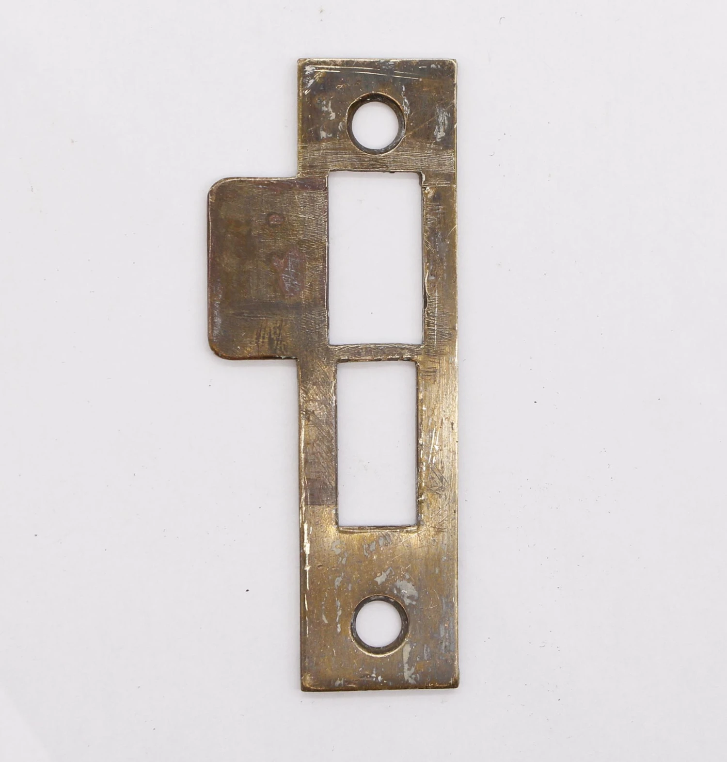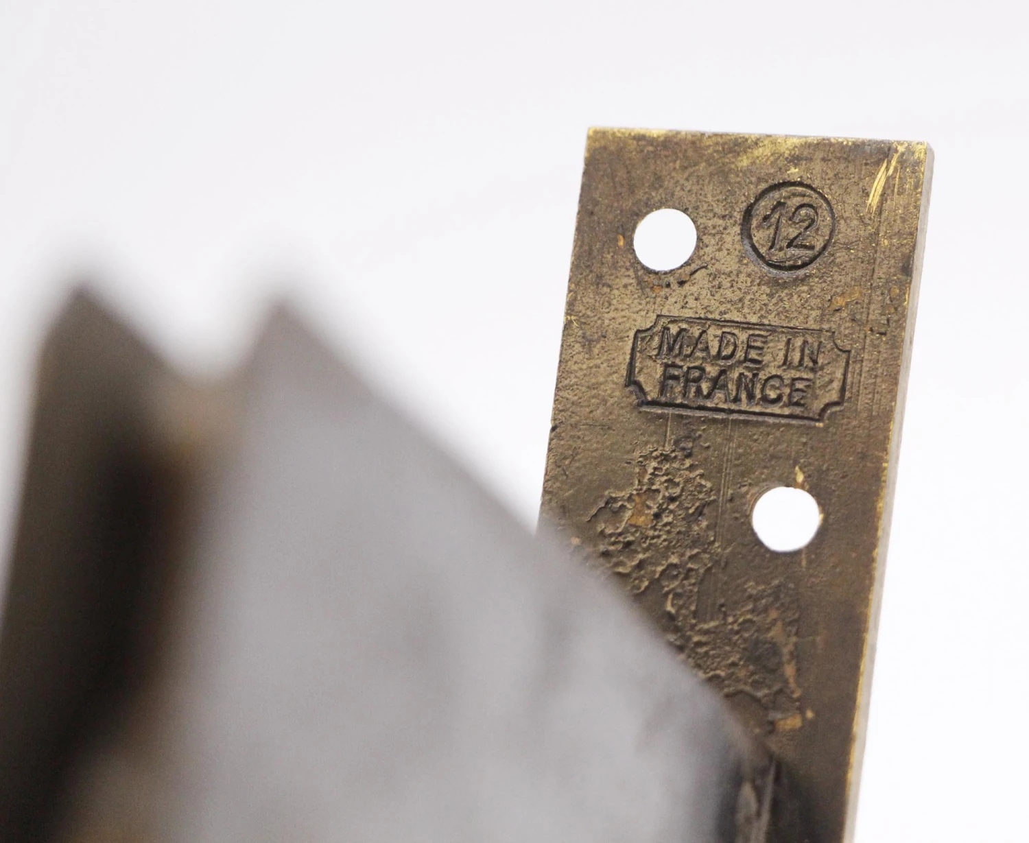 This vintage French made door mortise lock, accompanied by a strike plate, exudes timeless elegance. With its deep back set and brass and cast iron construction, it adds function and vintage charm to doors. This is in great condition with surface wear. No key is available.