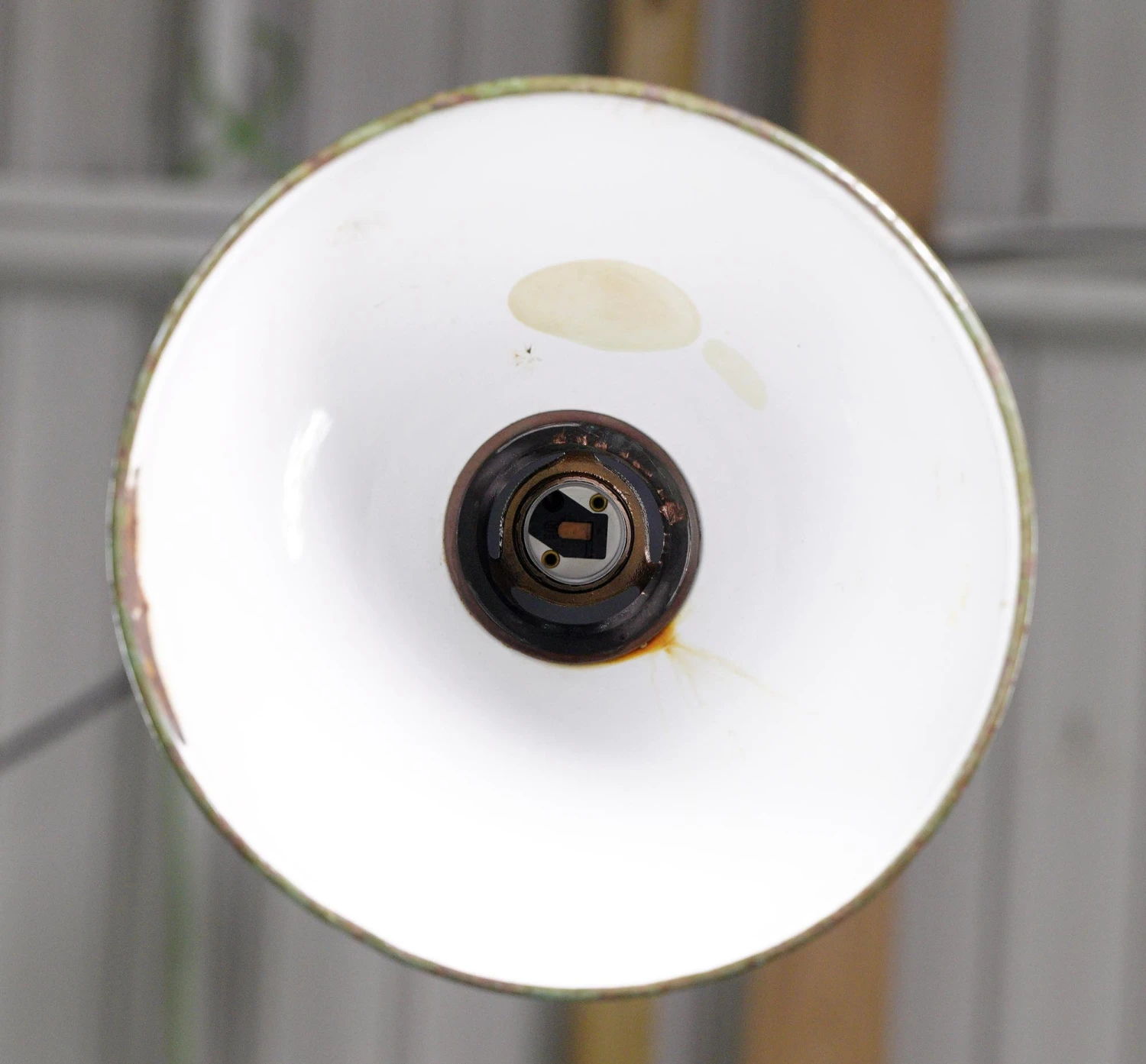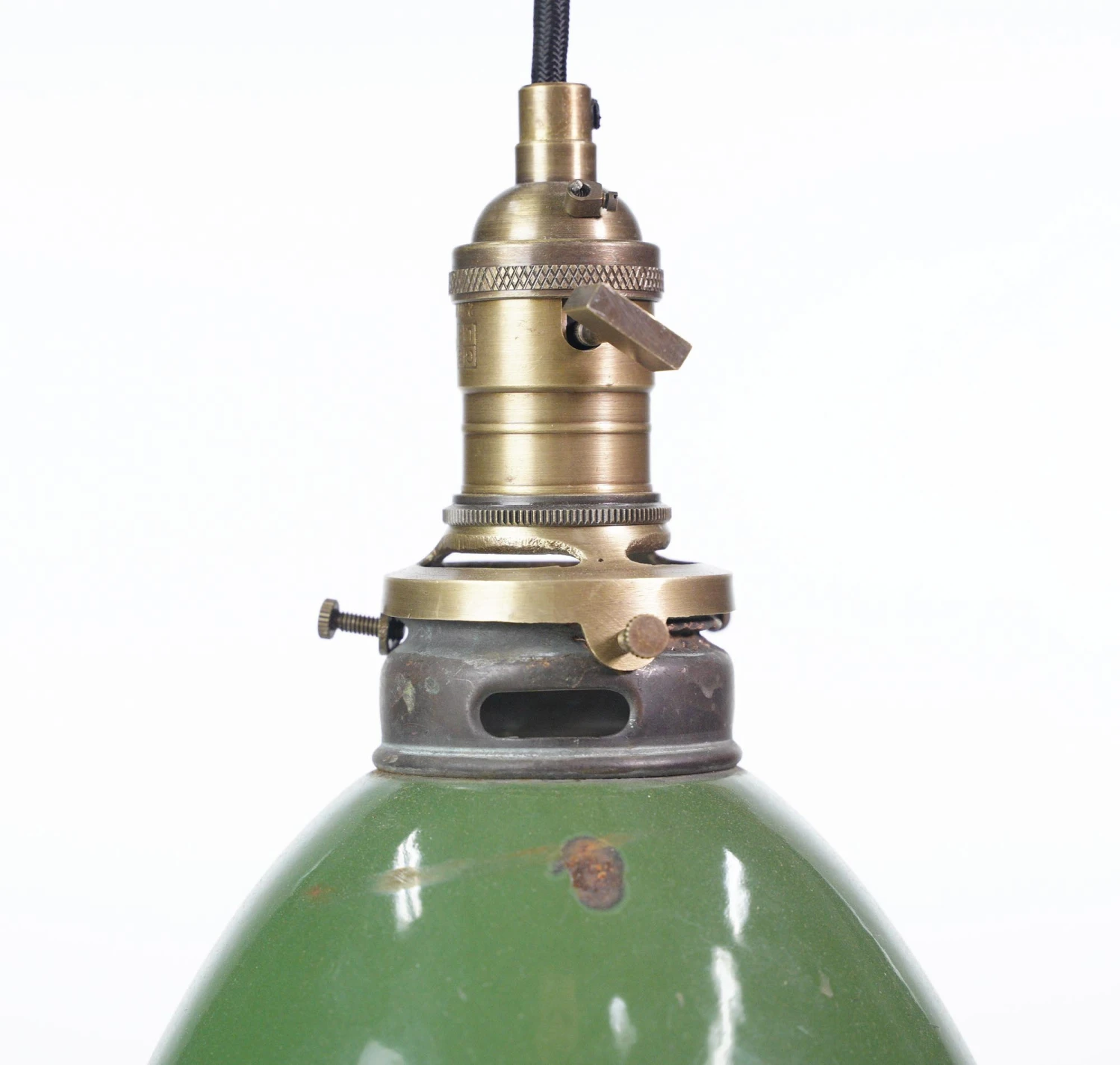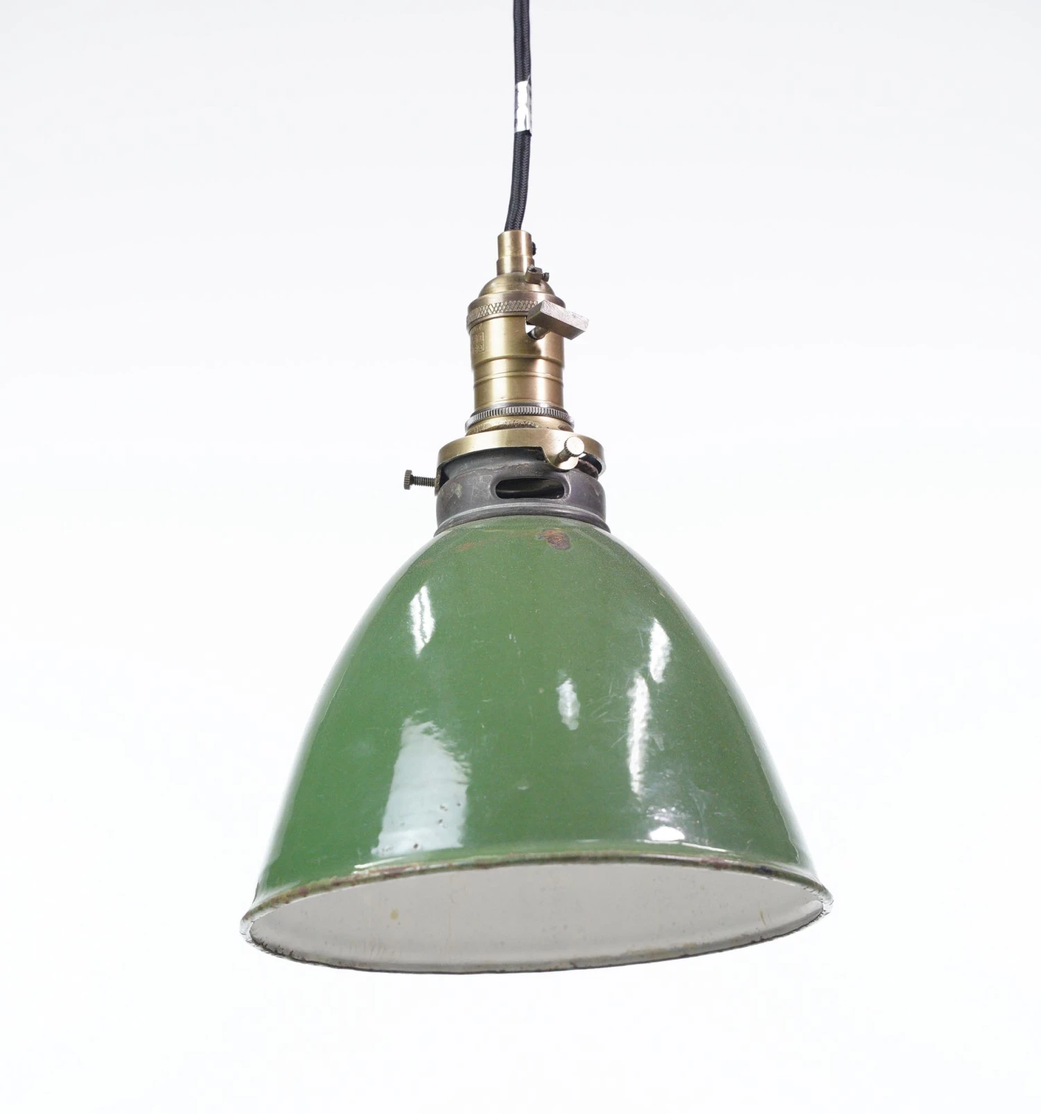 The vintage Industrial green enameled steel pendant light brings a retro charm to any space. The green shade adds a pop of color, while the pendant design adds a touch of industrial style. This light fixture is a perfect blend of vintage and contemporary aesthetics. The shade has surface chips. The price includes restoration of cleaning and rewiring.