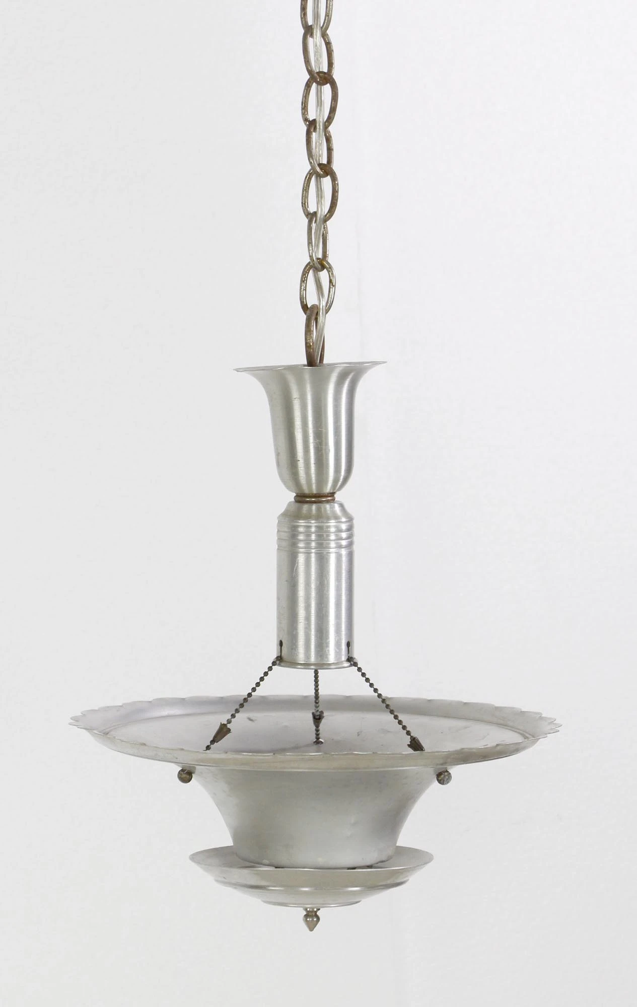 Art Deco aluminum pendant light with scalloped edges along the top. There are some minor dents in the metal. Please see the photos. Price includes restoration.