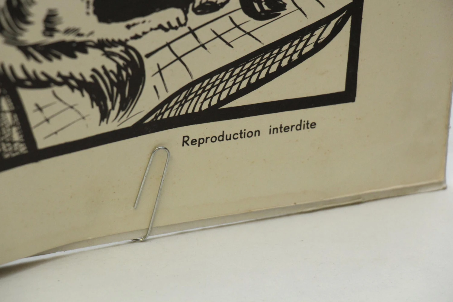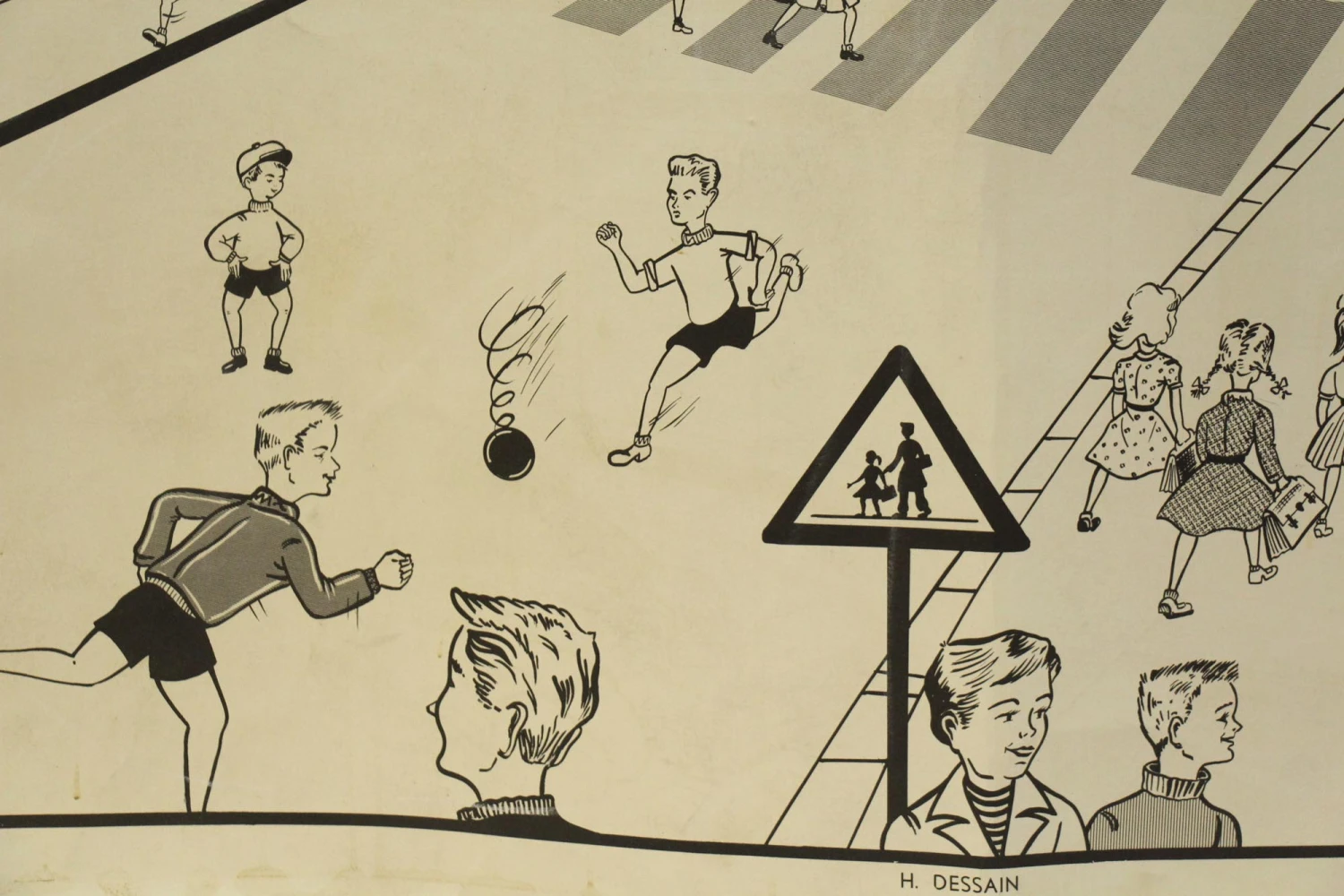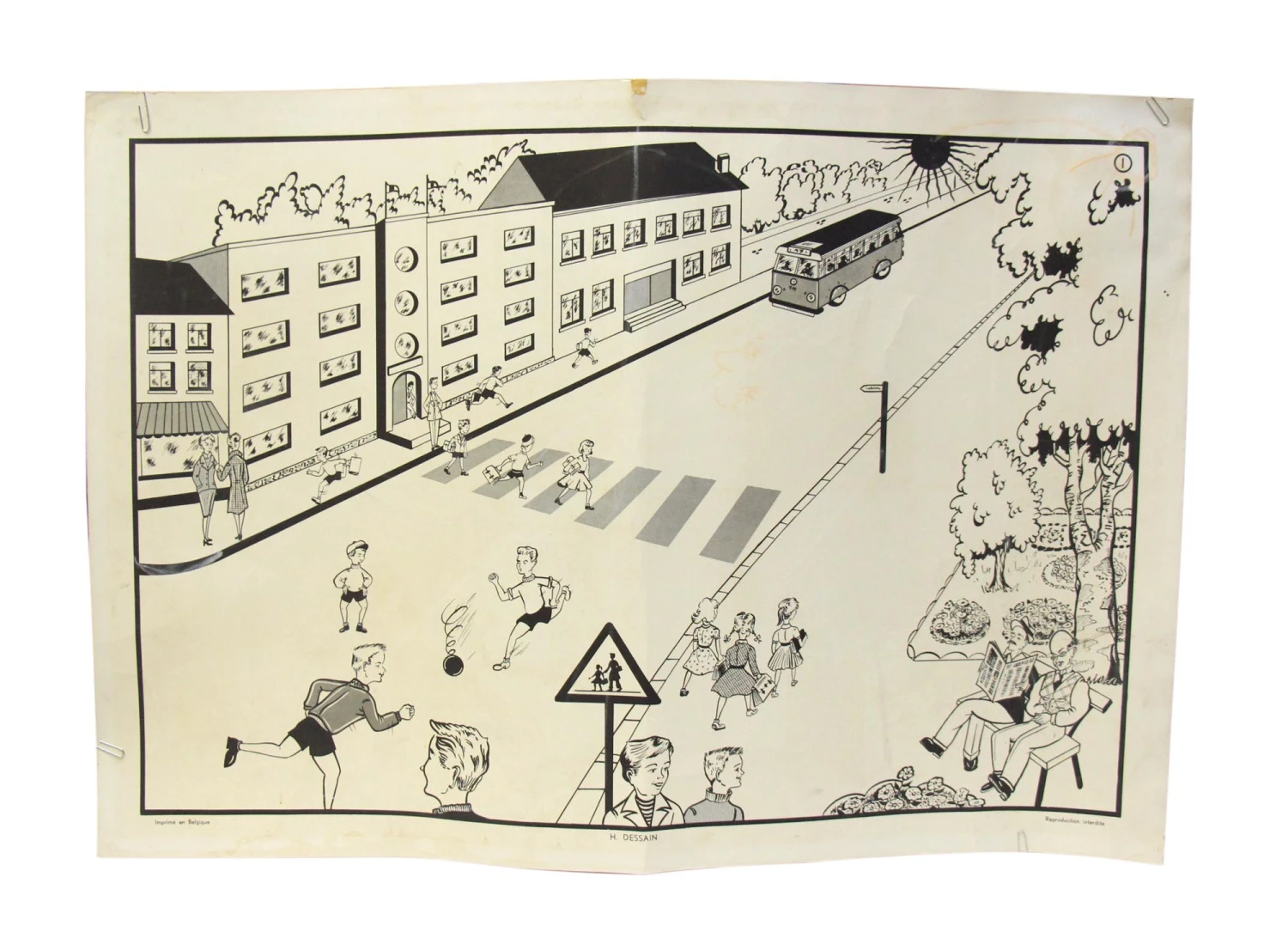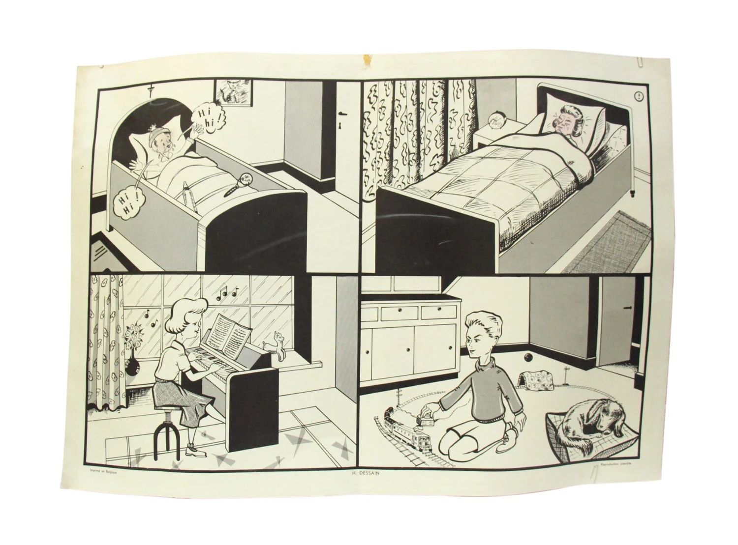 Belgian school poster depicting four different scenes. One is a baby crying “Hi! Hi! Hi!” in his crib. Another scene depicts a mother sleeping in her bed. The bottom right corner has a boy playing with a toy train set with a sleeping dog next to him and the last scene is a young woman playing piano. The entire poster is black and white in a vintage setting. We make custom frames out of reclaimed moldings. Please inquire an additional price for framing.