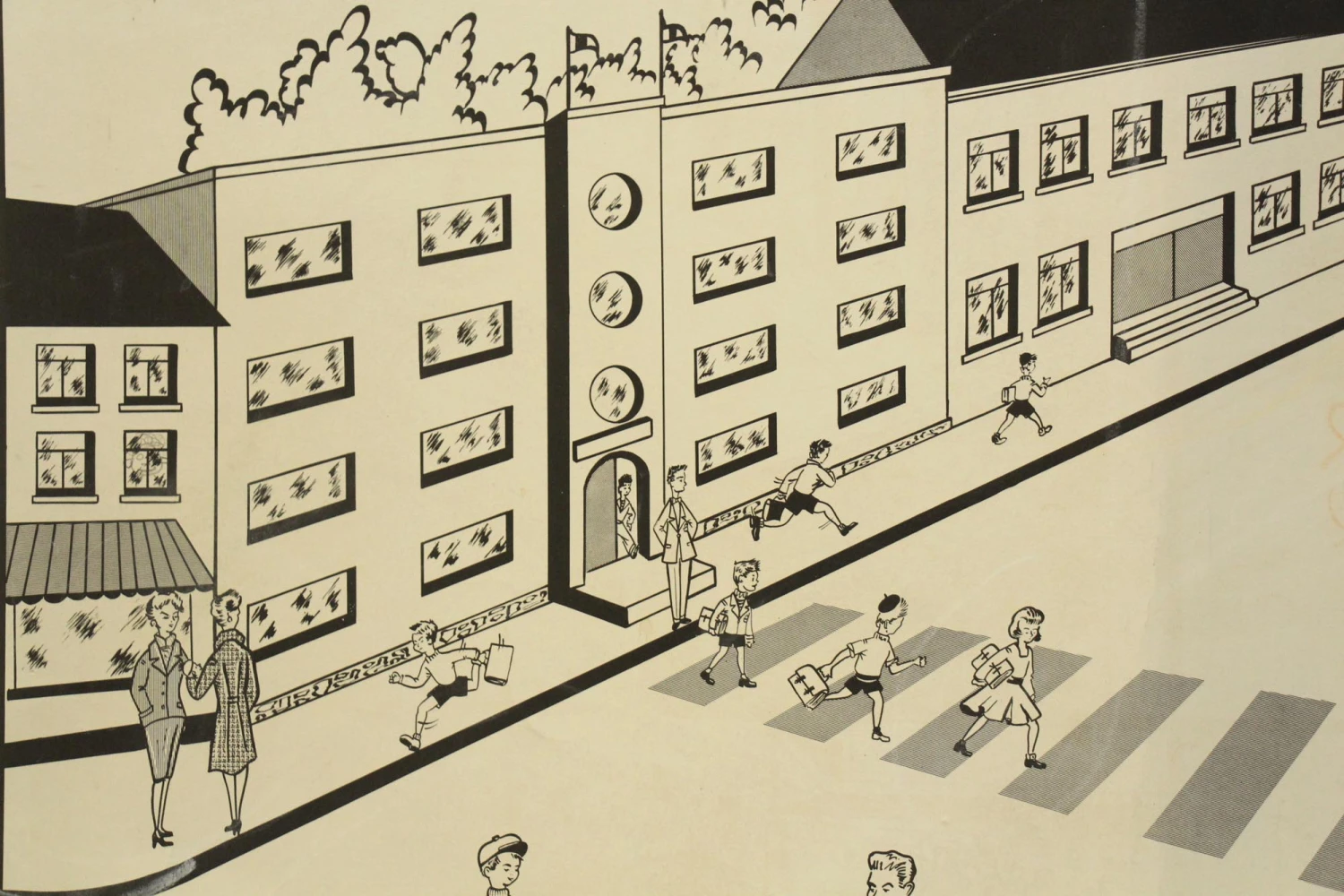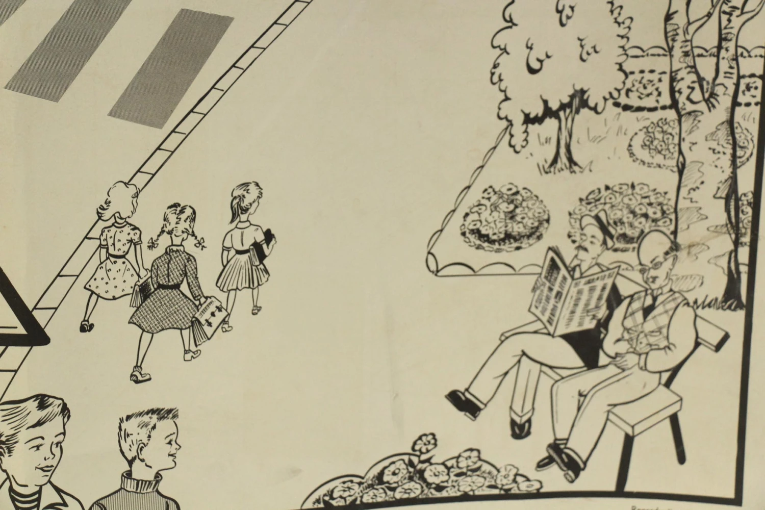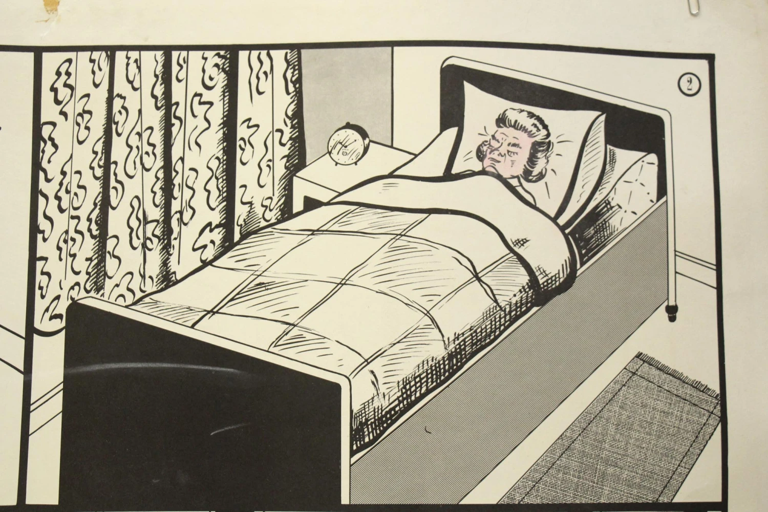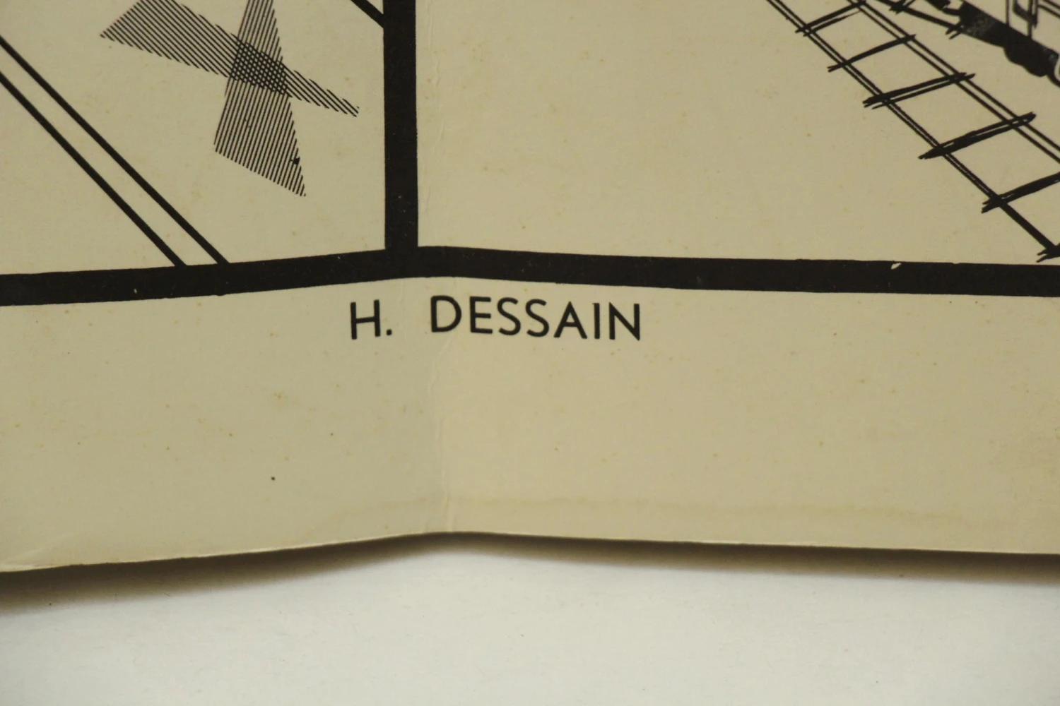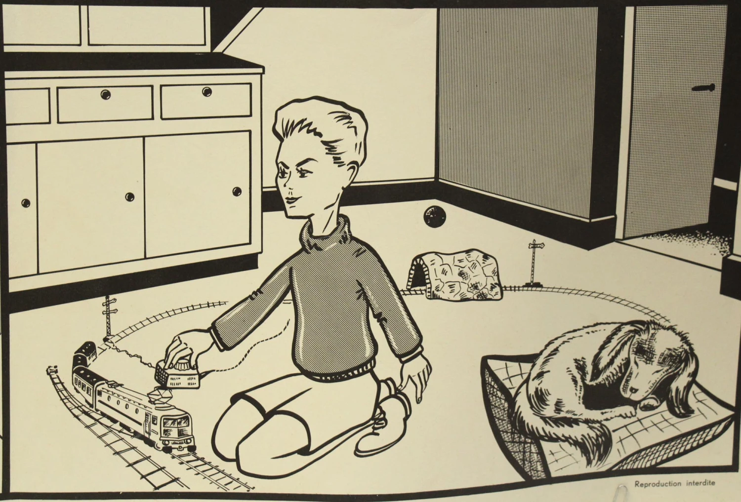 Belgian school poster depicting four different scenes. One is a baby crying “Hi! Hi! Hi!” in his crib. Another scene depicts a mother sleeping in her bed. The bottom right corner has a boy playing with a toy train set with a sleeping dog next to him and the last scene is a young woman playing piano. The entire poster is black and white in a vintage setting. We make custom frames out of reclaimed moldings. Please inquire an additional price for framing.